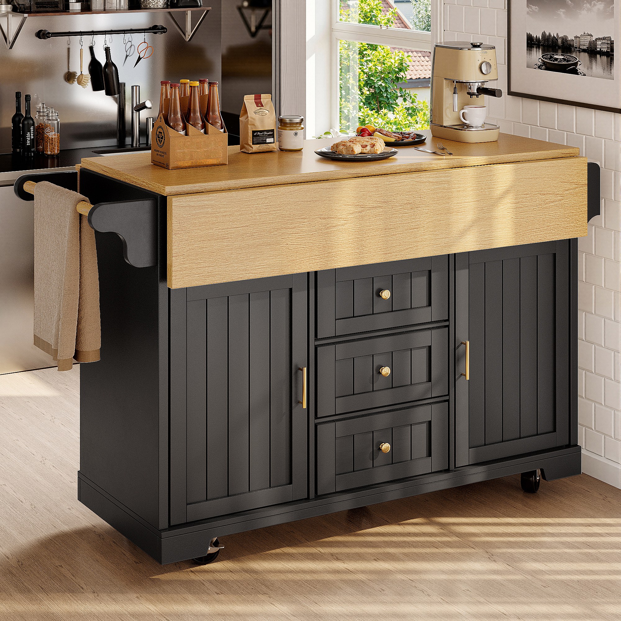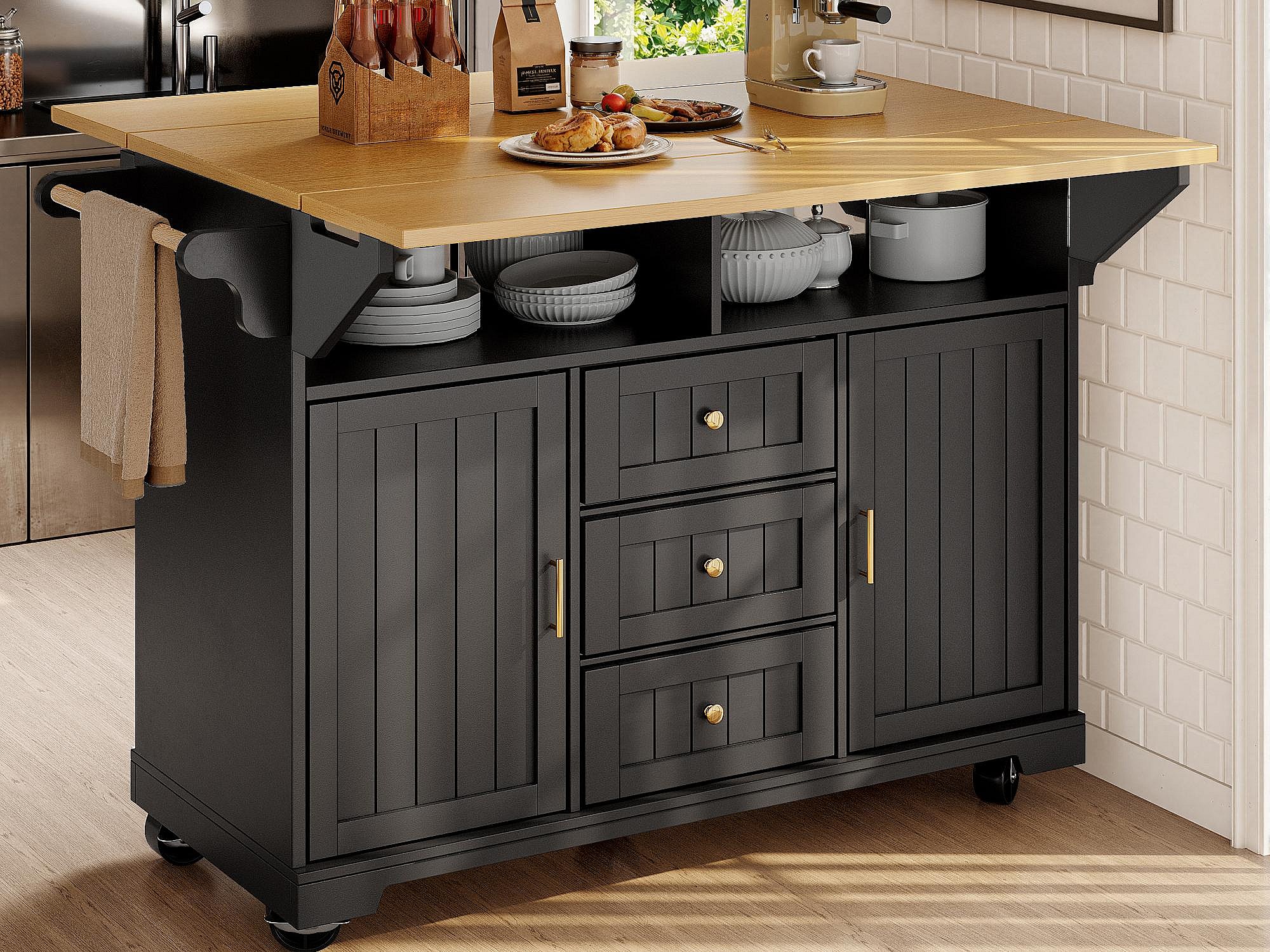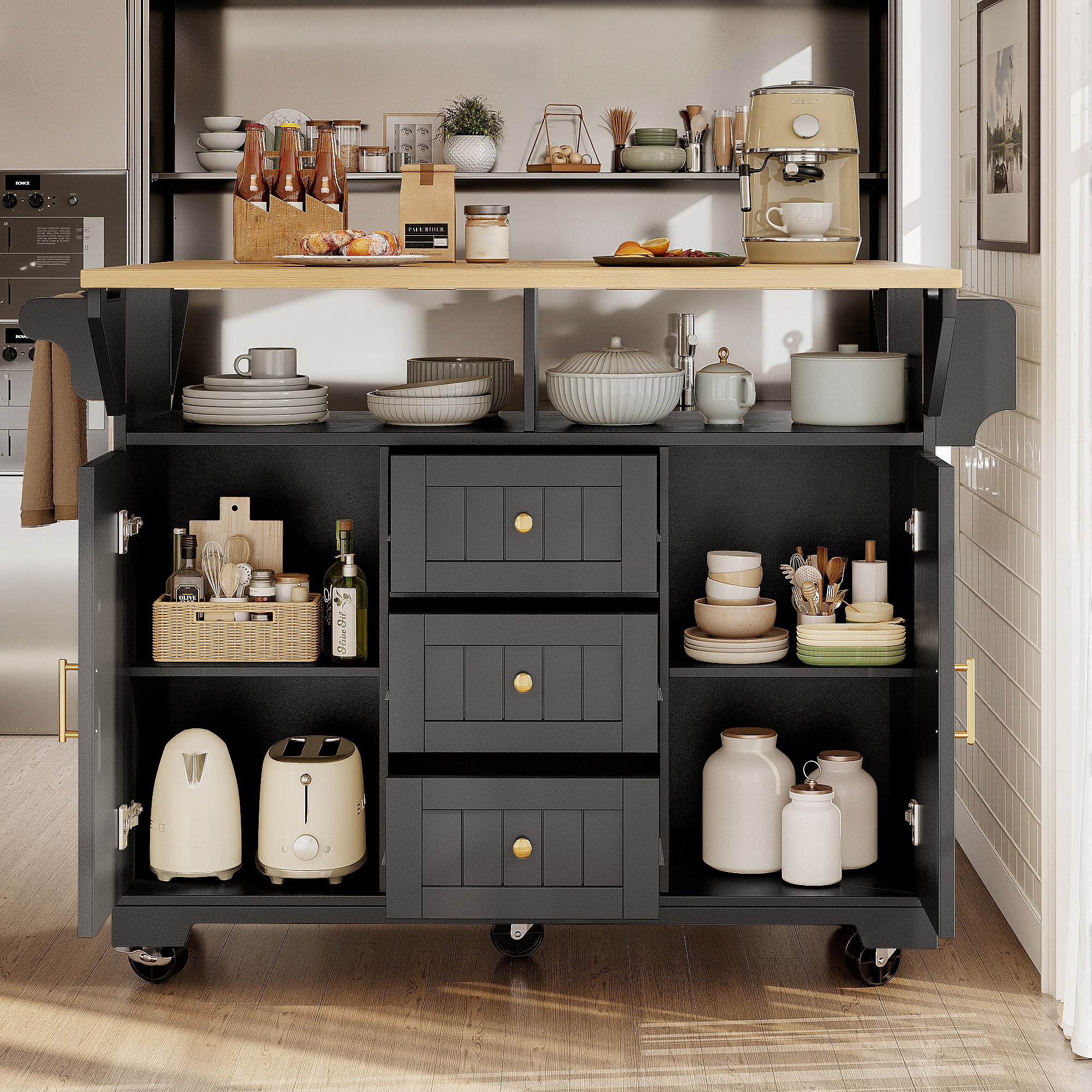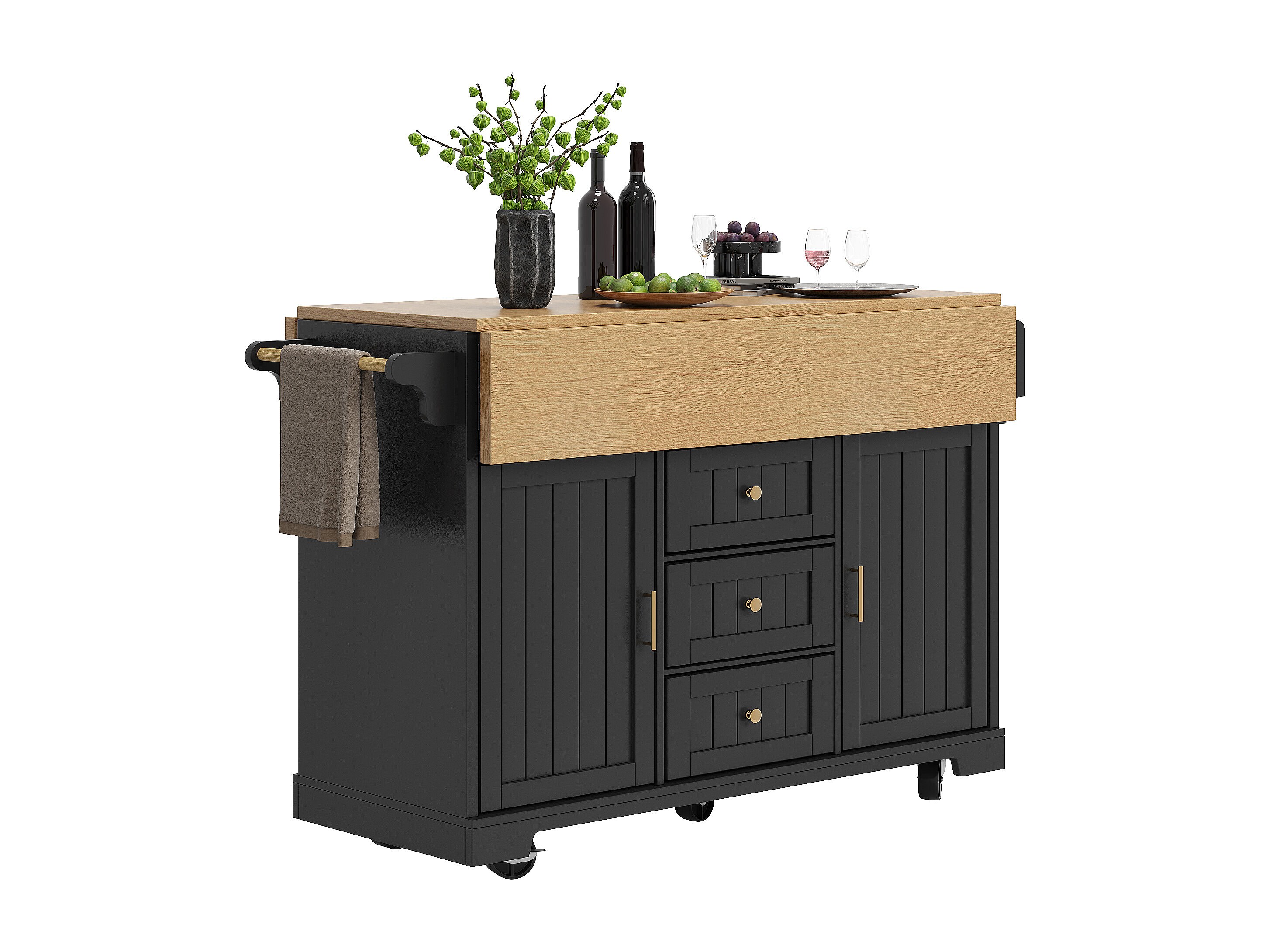 Mobile Kücheninsel - Ausziehbare Arbeitsplatte - 2 Türen und 3 Schubladen - Offene Ablagefächer - Mit Handtuchhalter - MDF - Schwarz