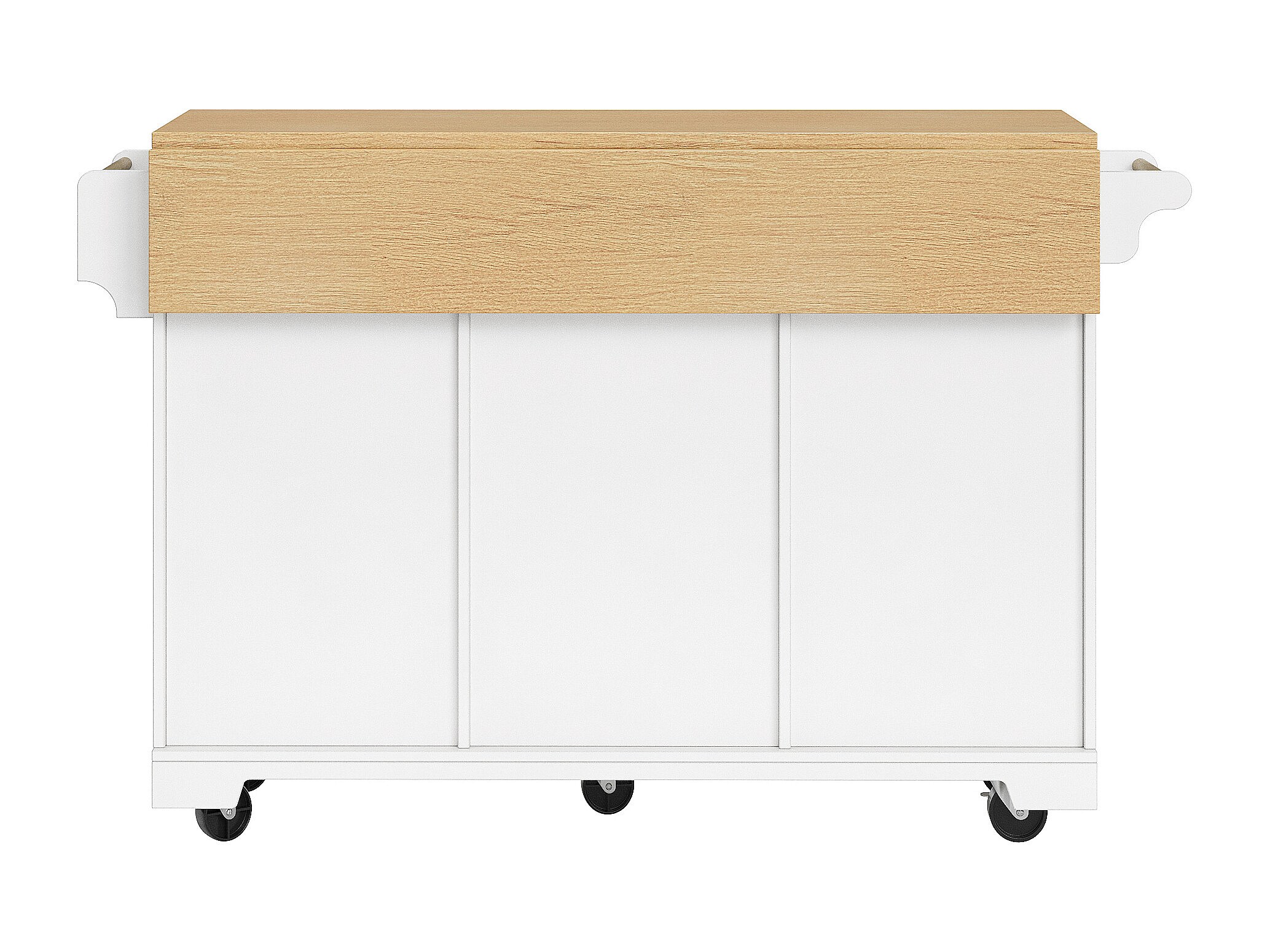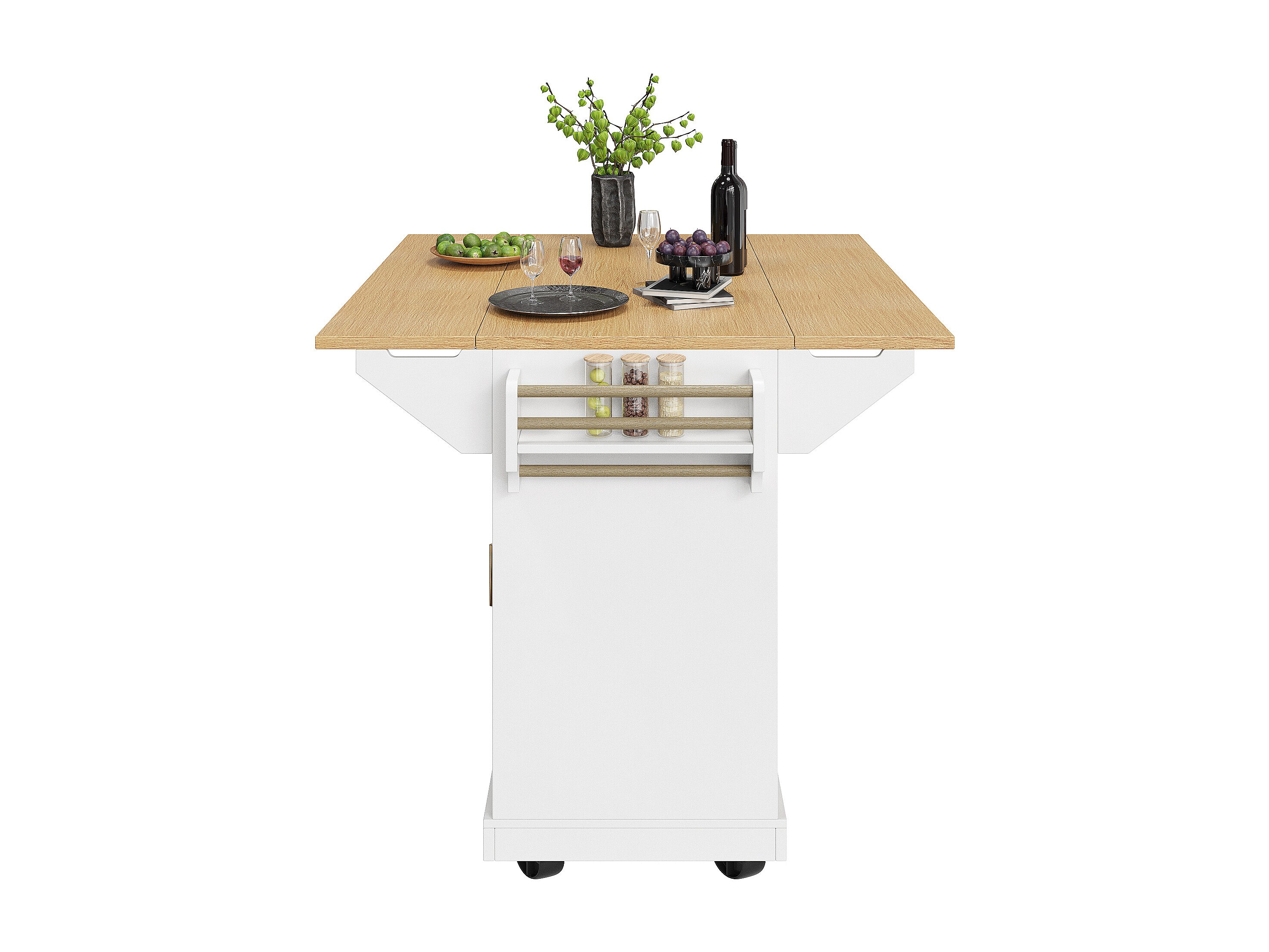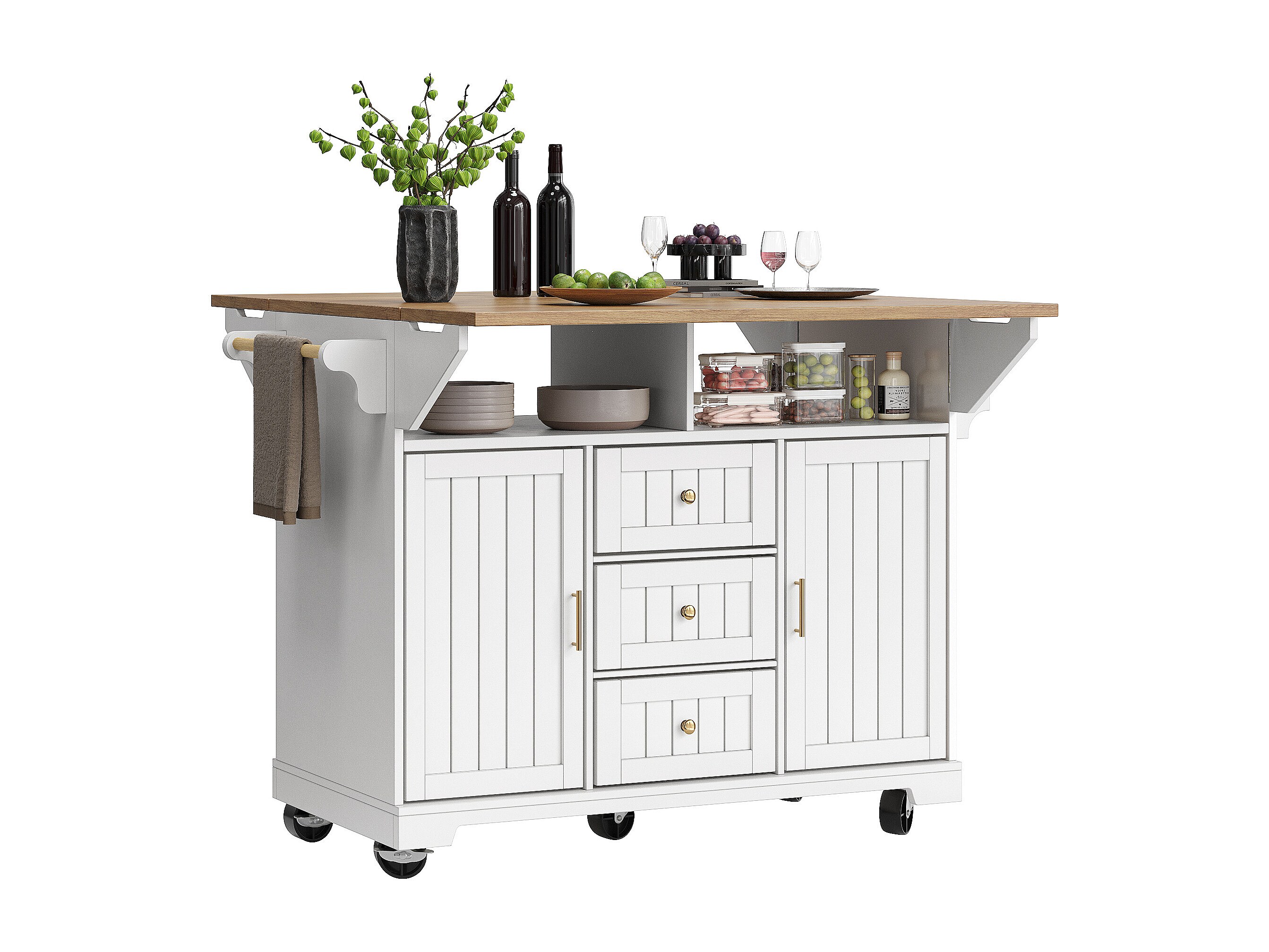 Mobile Kücheninsel - Ausziehbare Arbeitsplatte - 2 Türen und 3 Schubladen - Offene Ablagefächer - Mit Handtuchhalter - MDF - Weiß