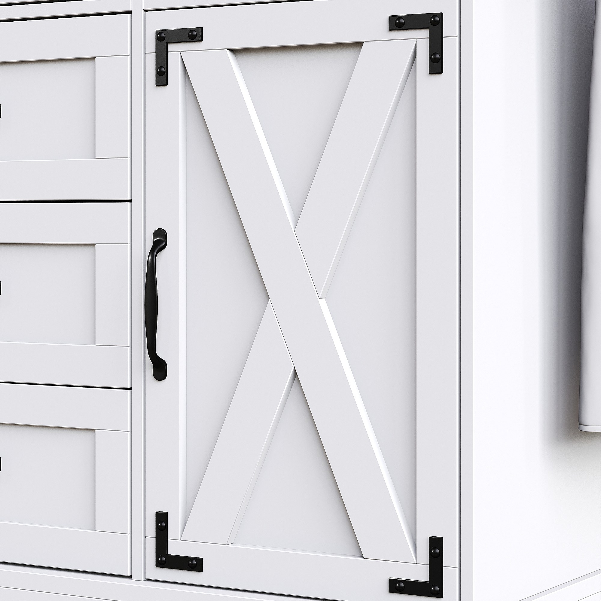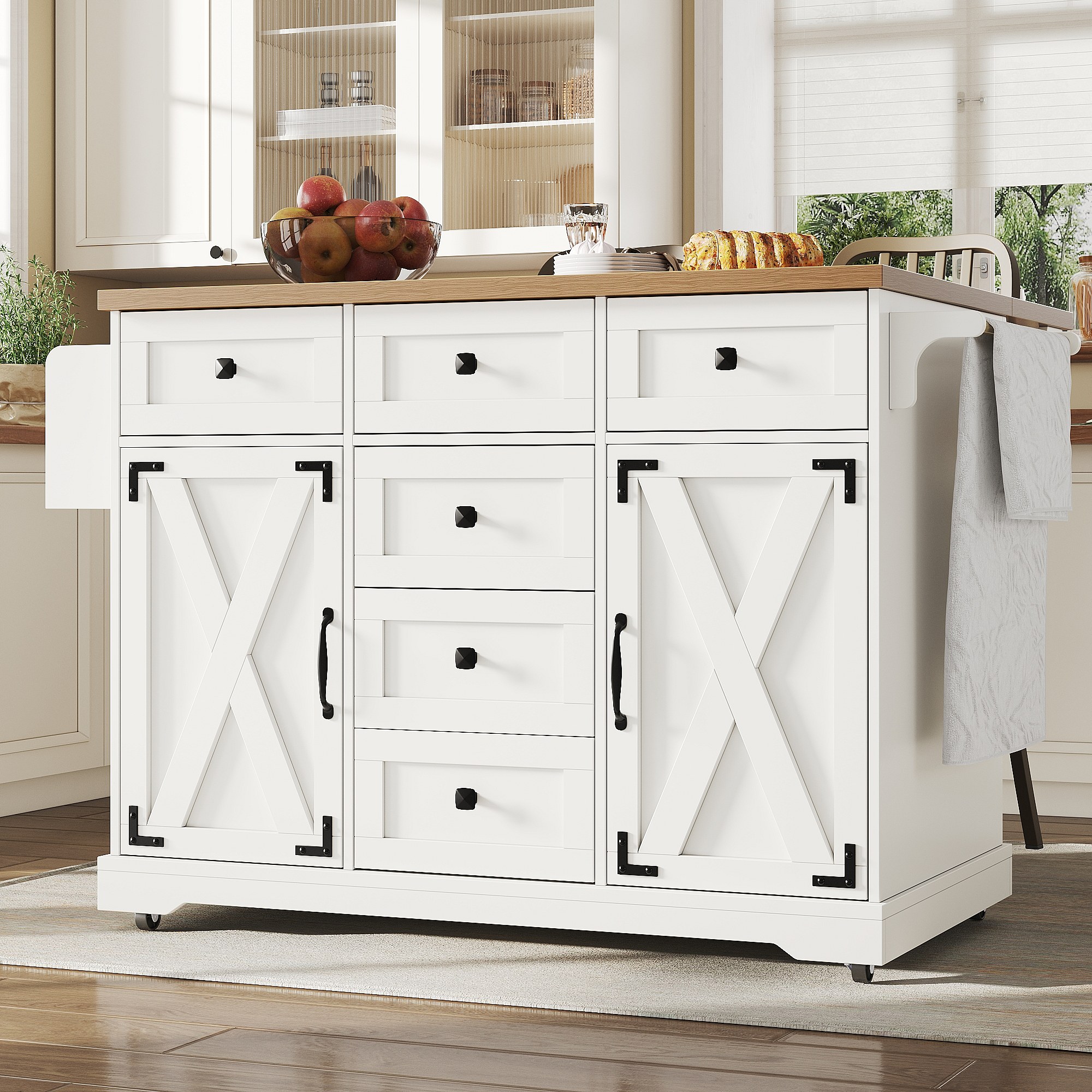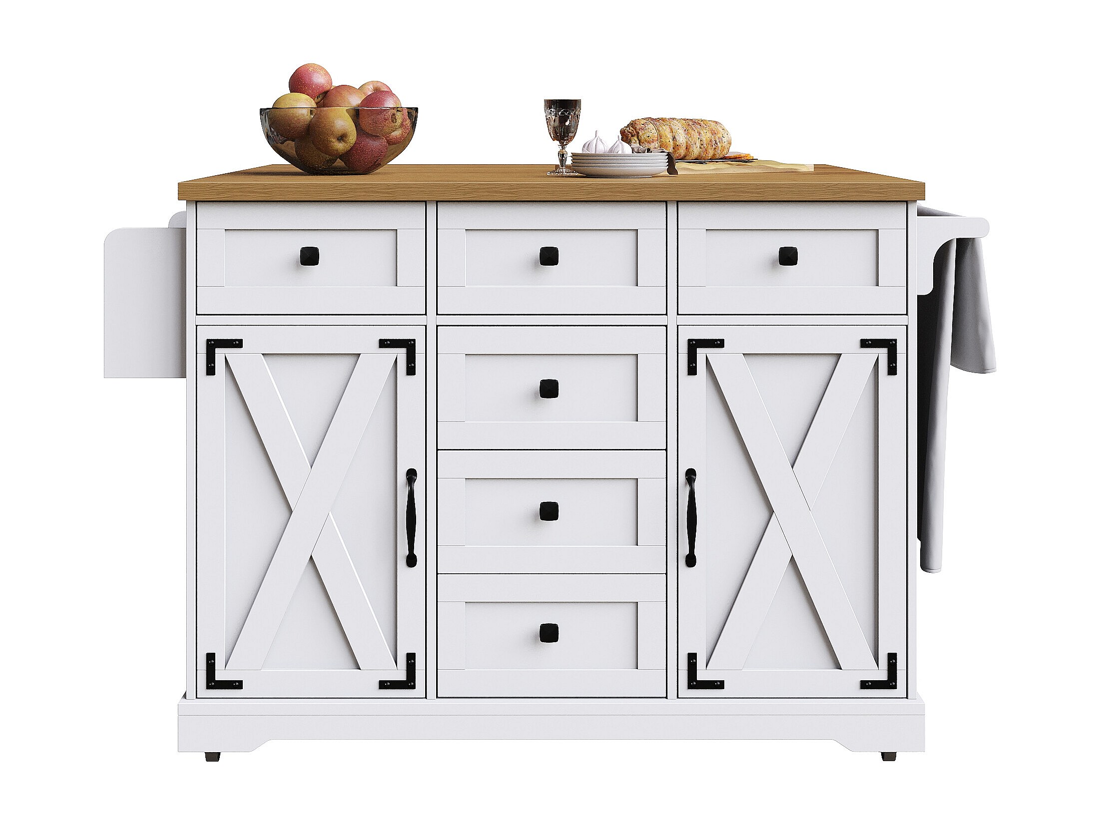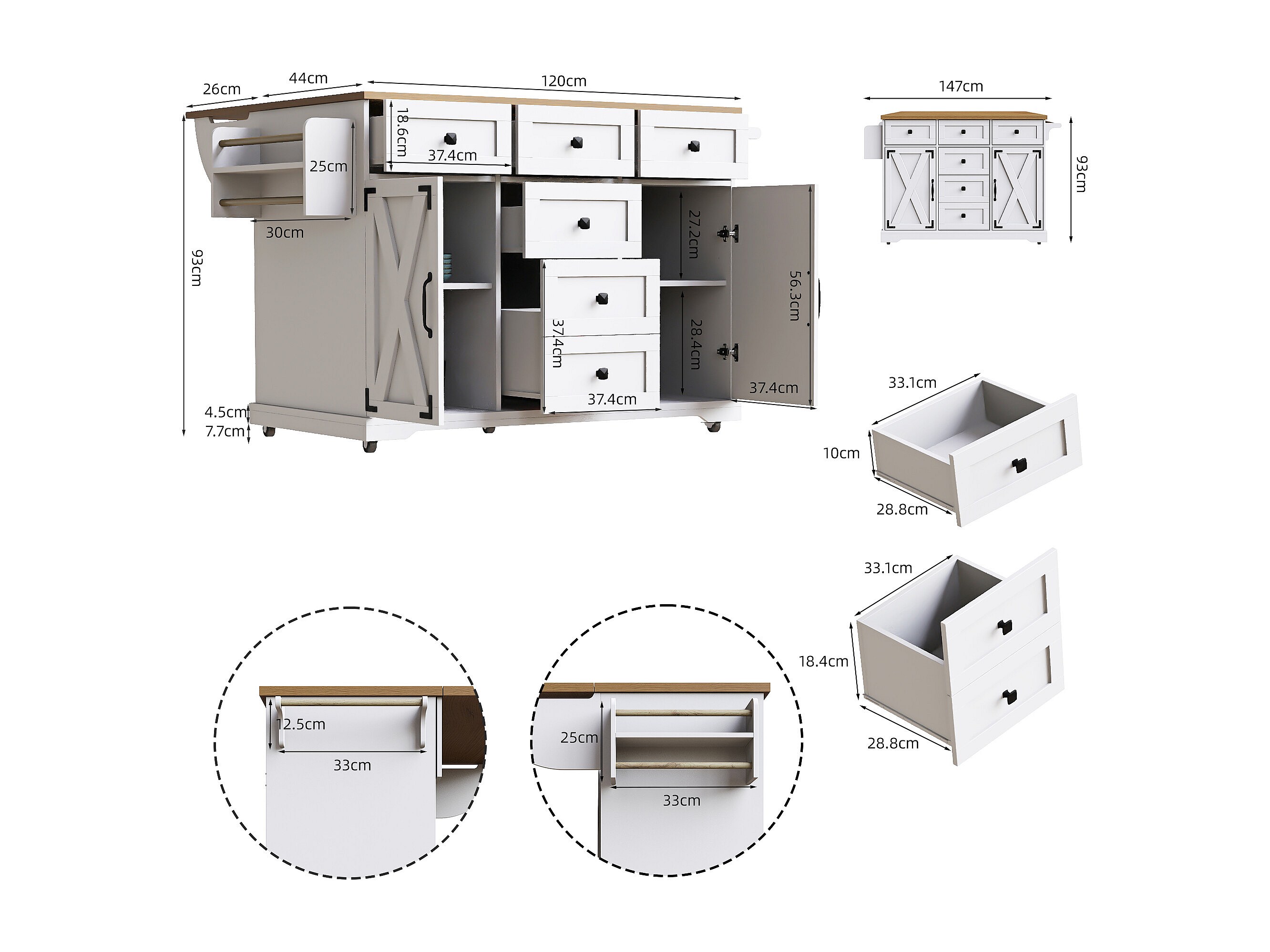 Mobile Kücheninsel - Ausziehbare Arbeitsplatte - 2 Türen und 5 Schubladen - Offene Ablagefächer - Mit Handtuchhalter - MDF - Weiß