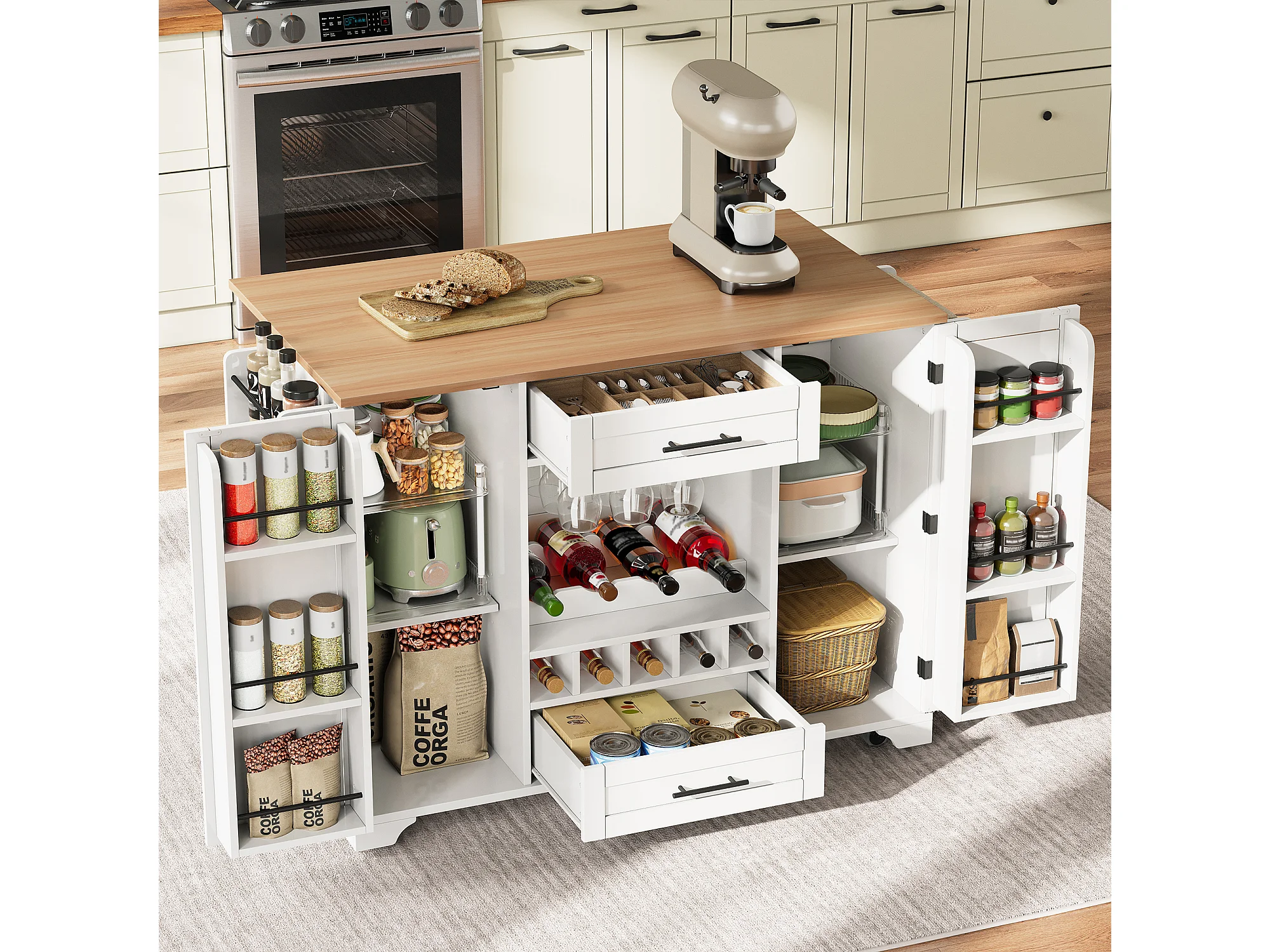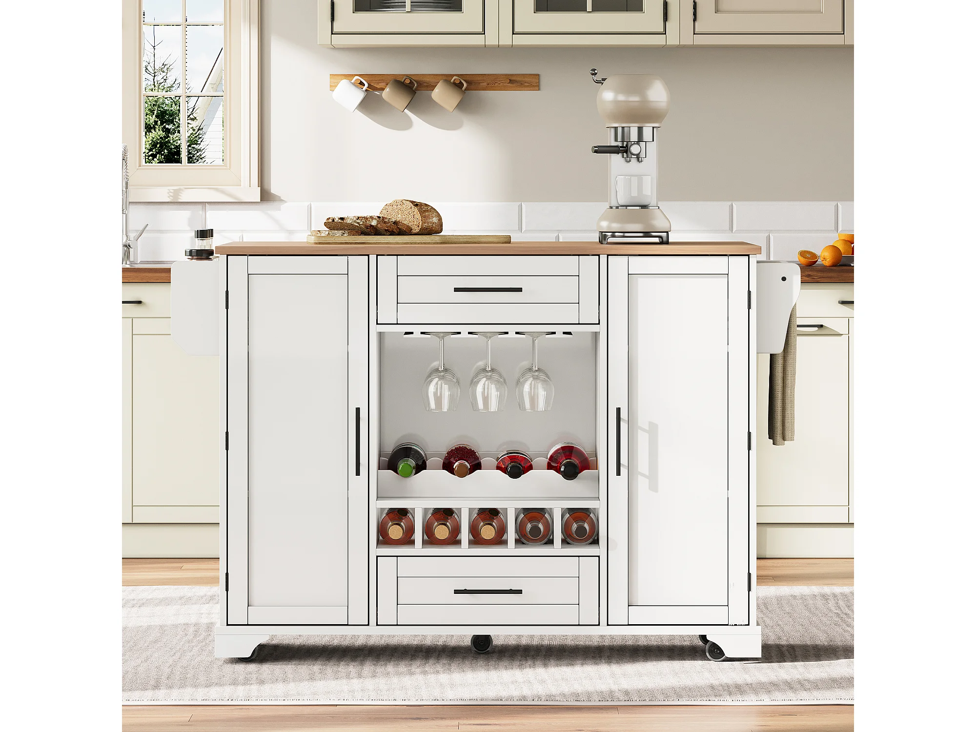 Mobile Kücheninsel - ausziehbare Arbeitsplatte - mit Weinfach und Handtuchhalter - mit 2 Schubladen und 2 Türen - MDF - Weiß