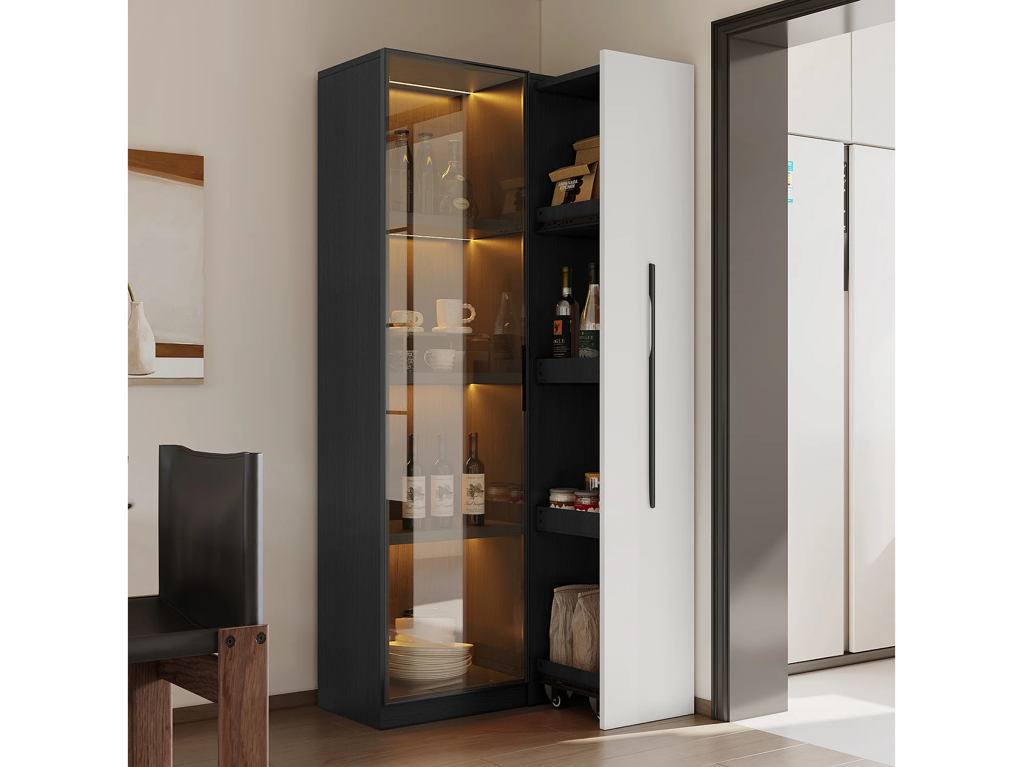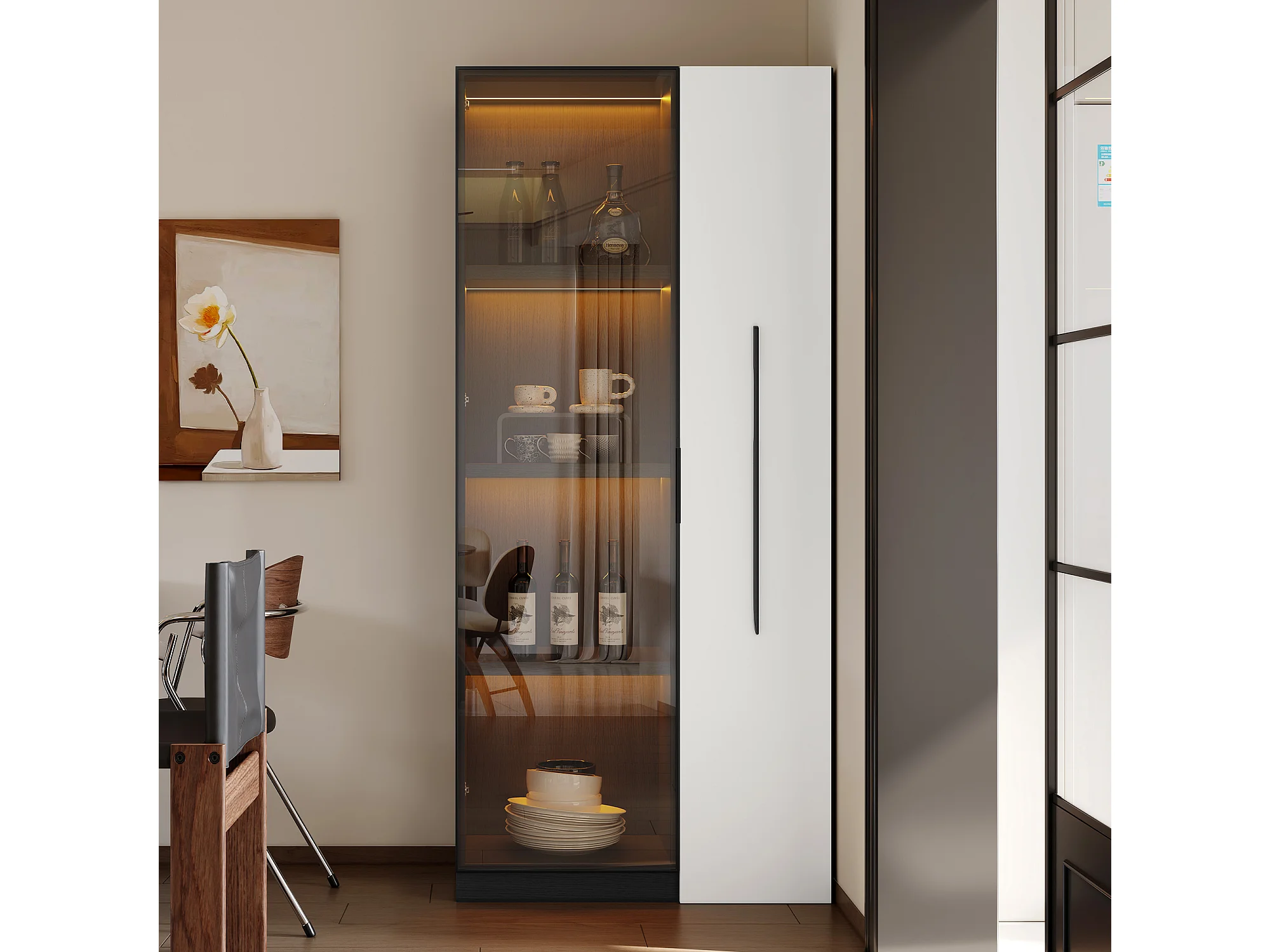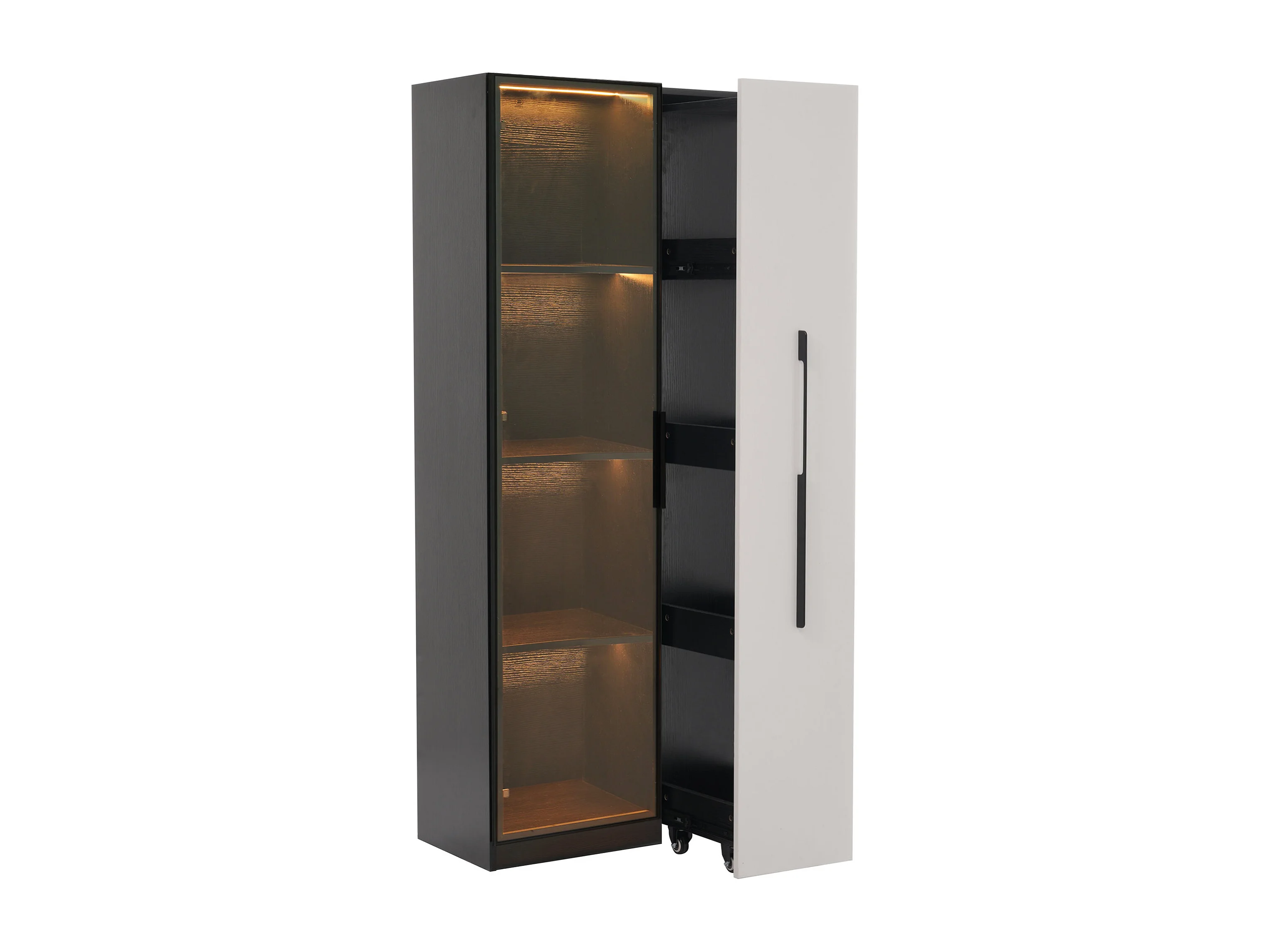 Mobile Vitrine 70x40x160 cm - Bücherregal - LED-Beleuchtung - 1 Glastür und 1 Schublade - mit Rollen - MDF - Schwarz und Weiß