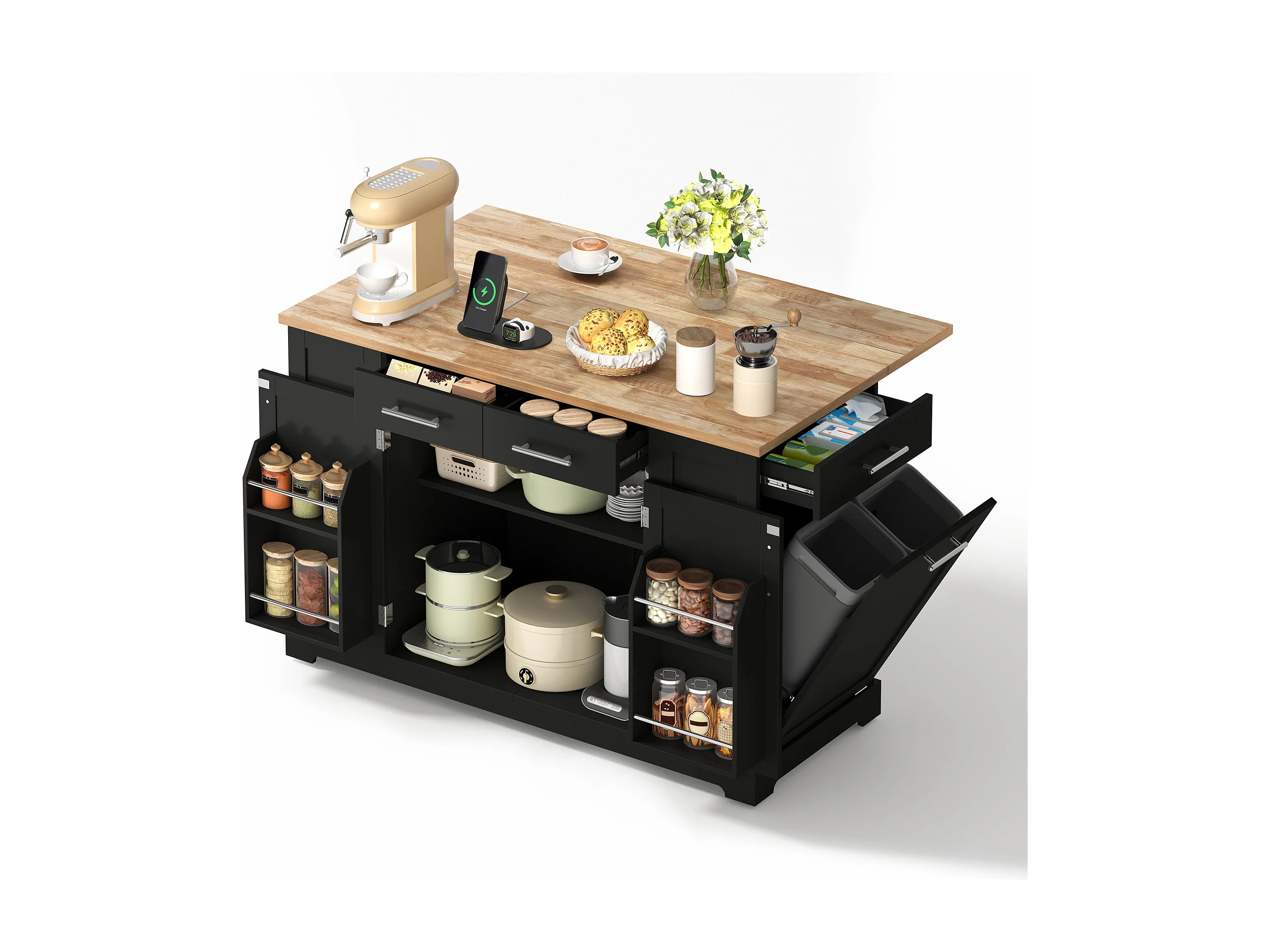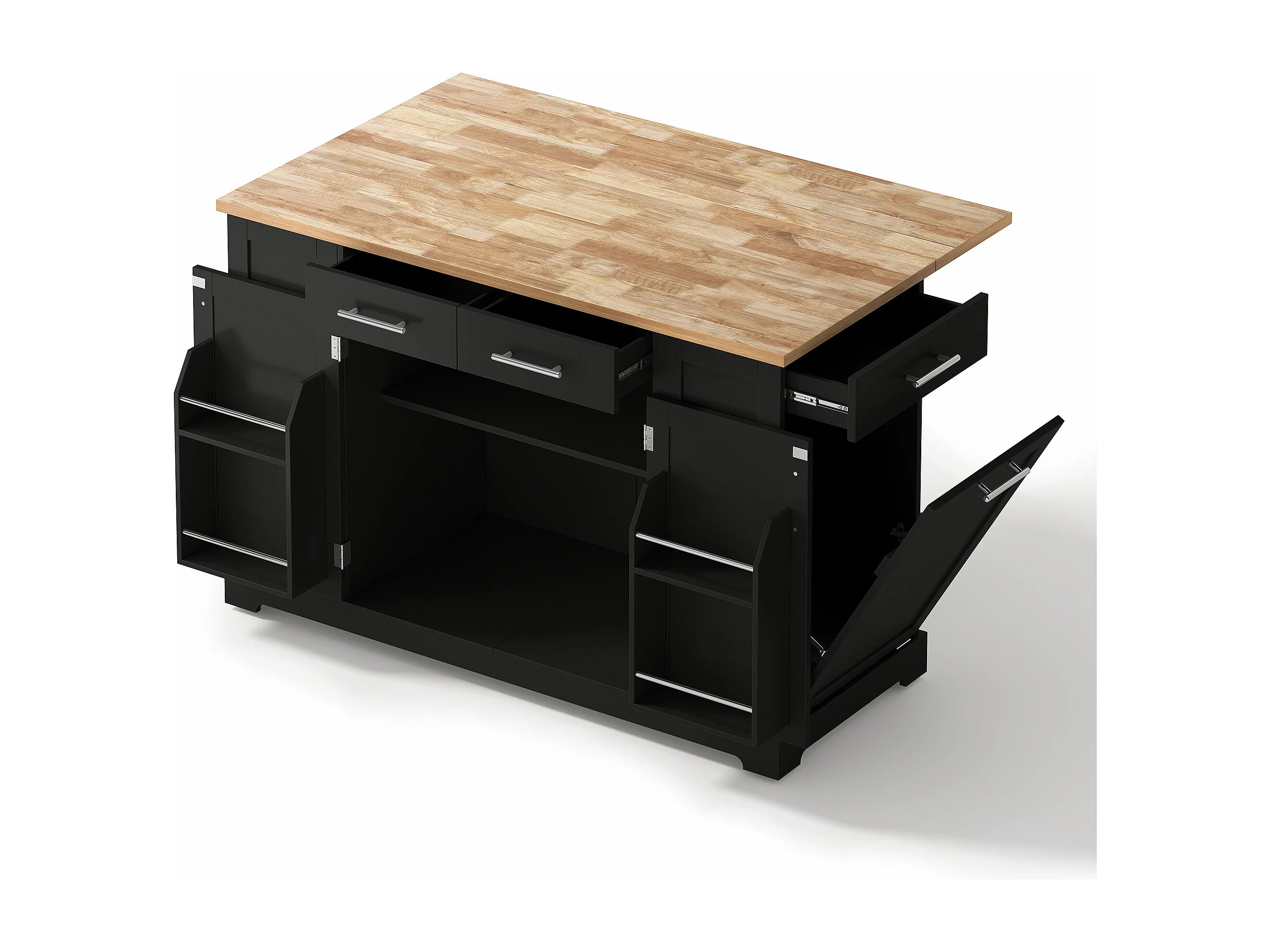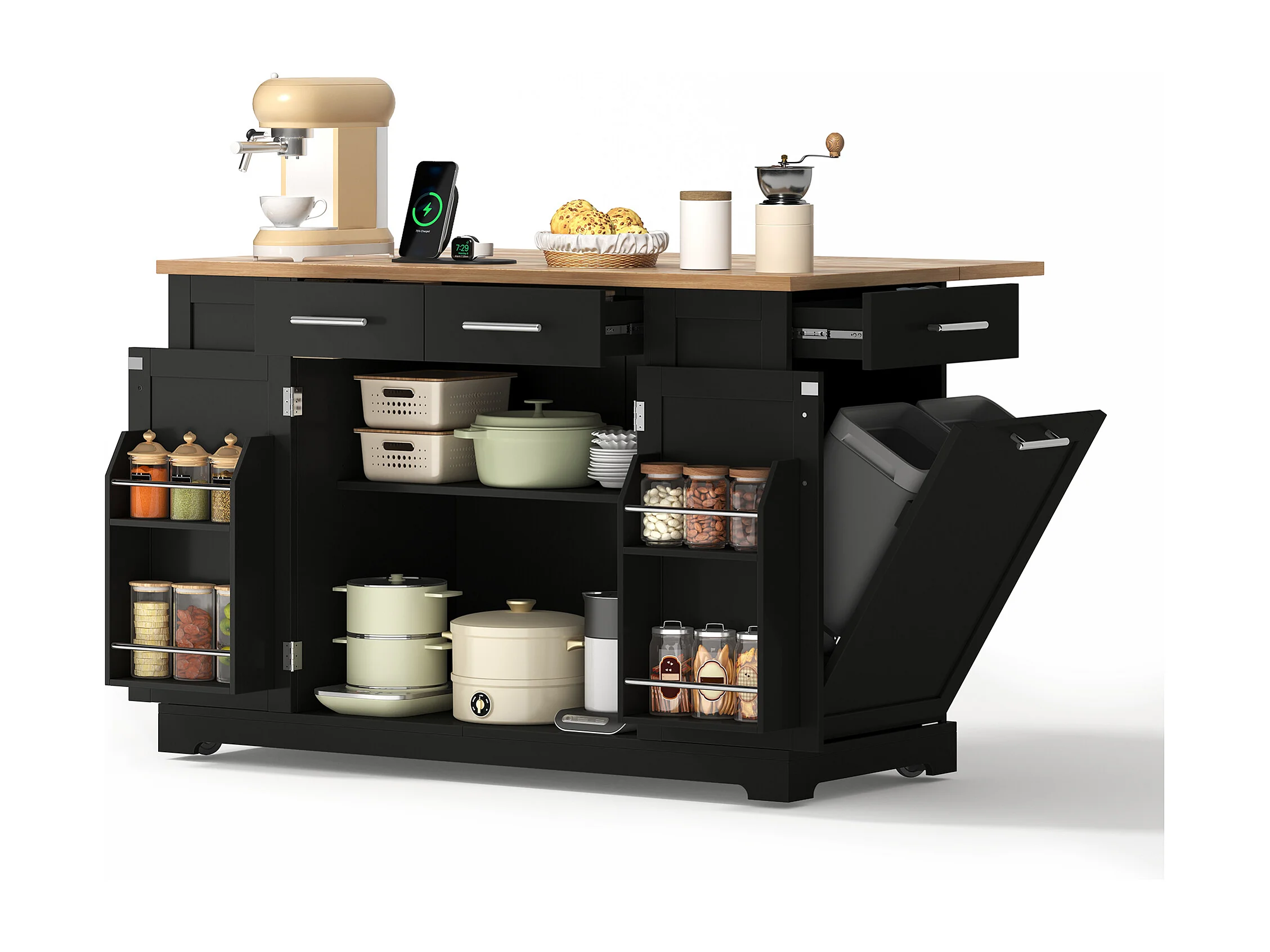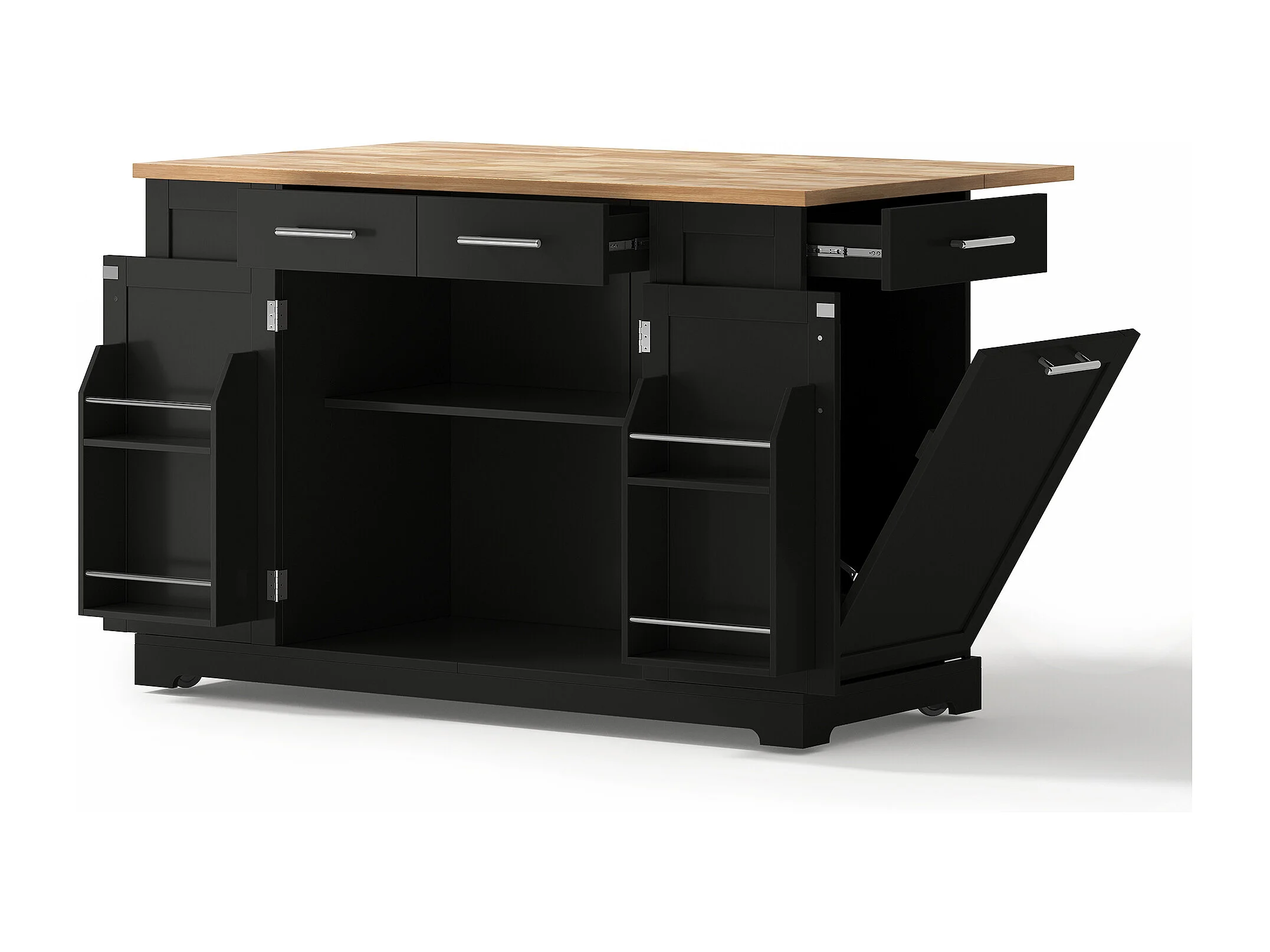 Mobile zentrale Kücheninsel - ausziehbares Tischblatt - mit Steckdose und ausziehbarer Mülltonne - mit Rollen - mit 3 Schubladen und 3 Türen - Schwarz + Natur