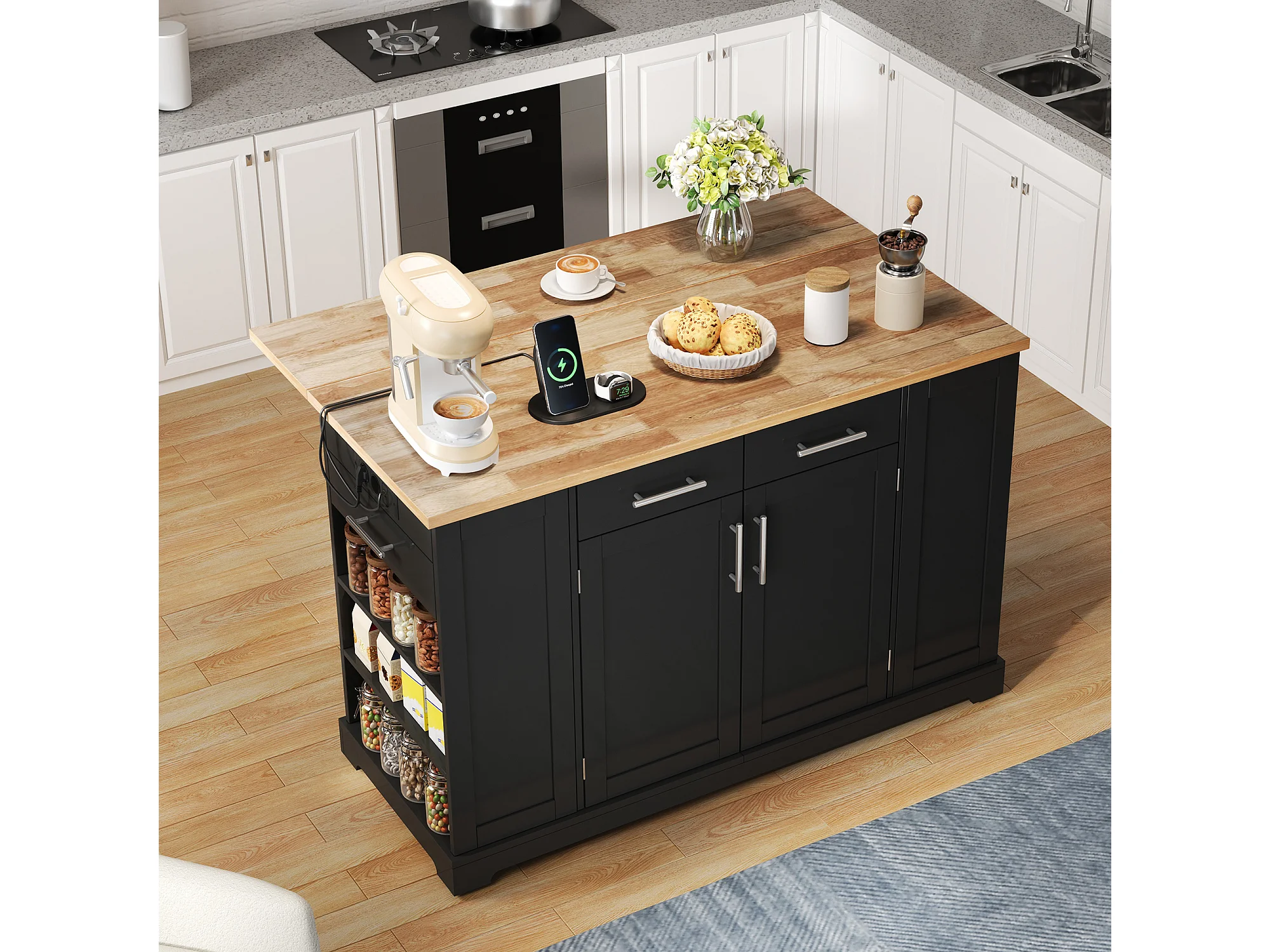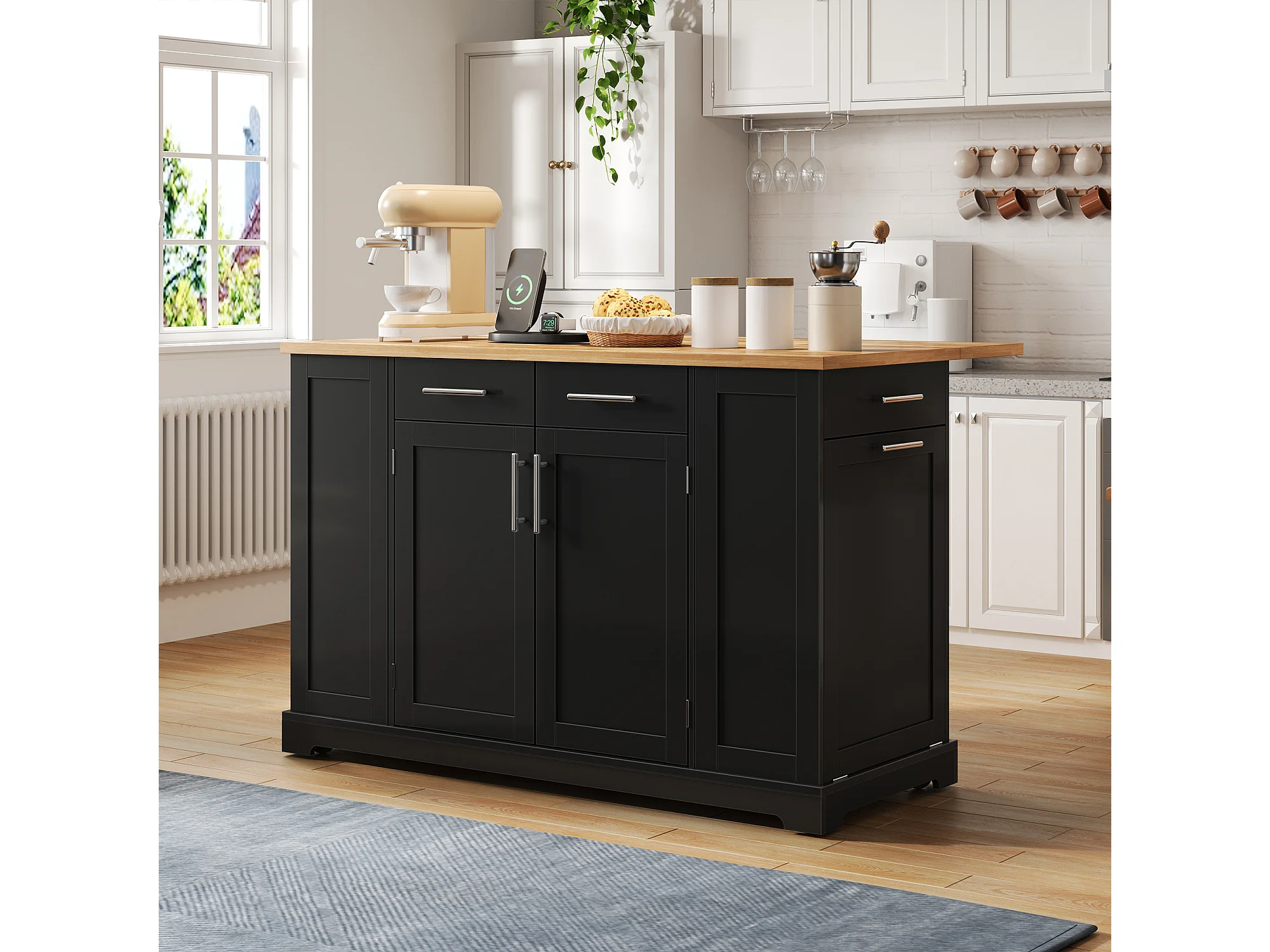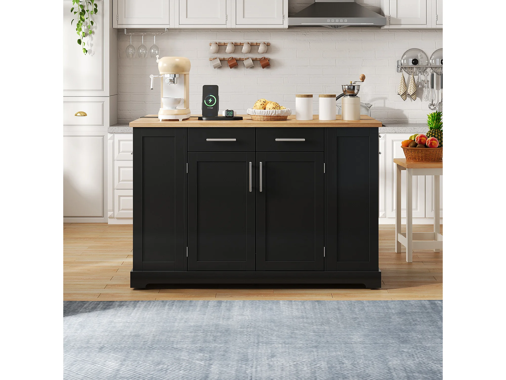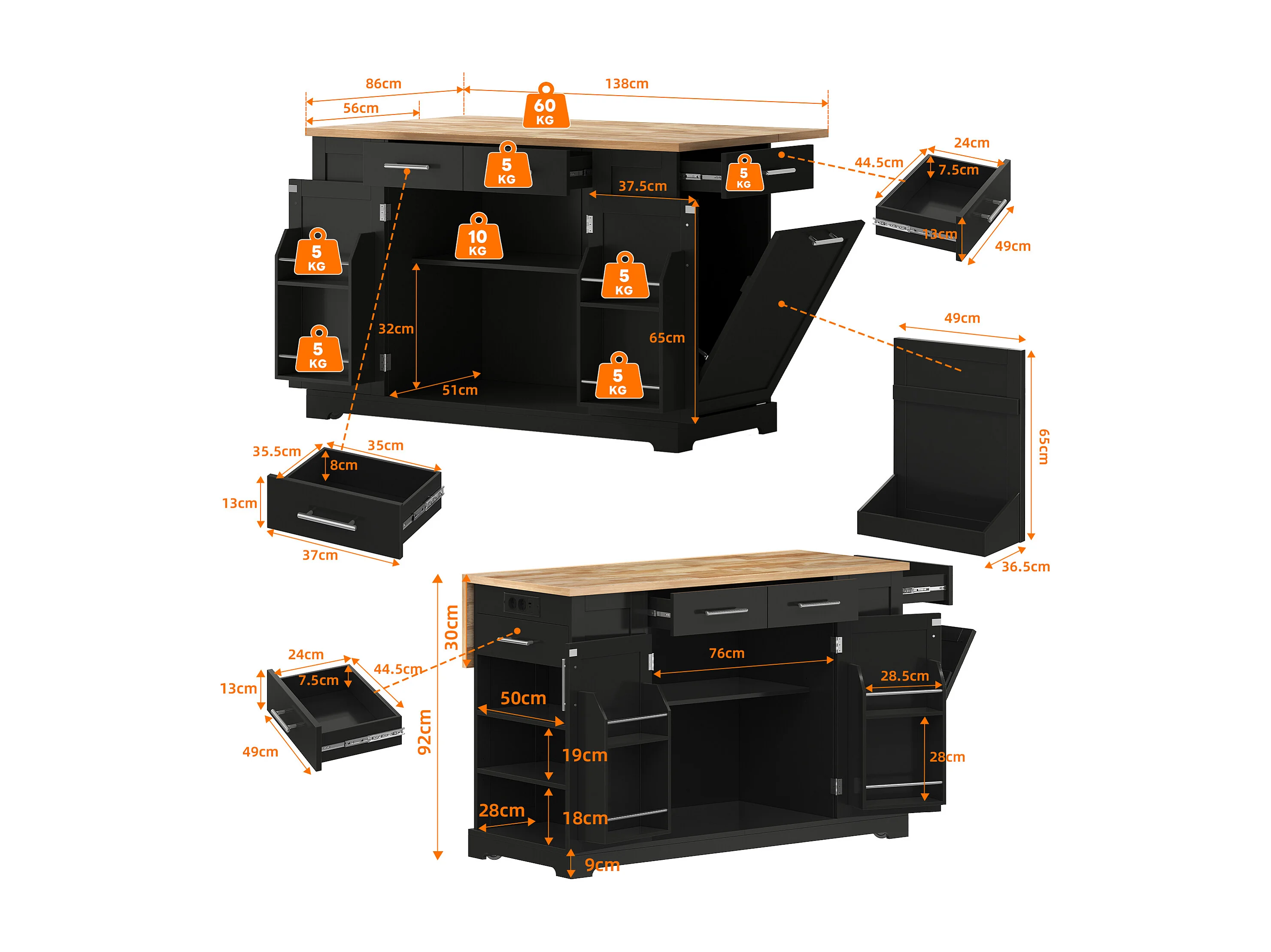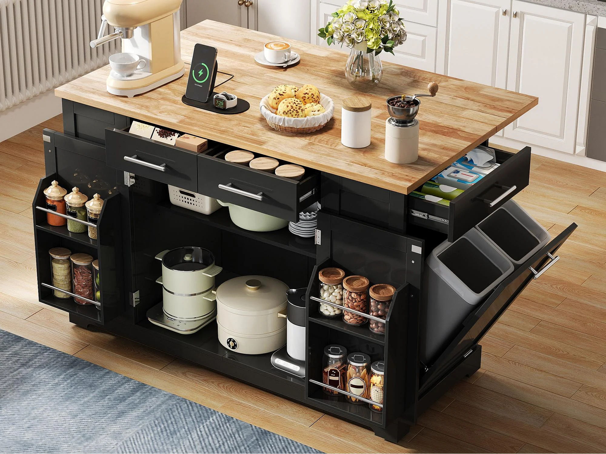 Mobile zentrale Kücheninsel - ausziehbares Tischblatt - mit Steckdose und ausziehbarer Mülltonne - mit Rollen - mit 3 Schubladen und 3 Türen - Schwarz + Natur