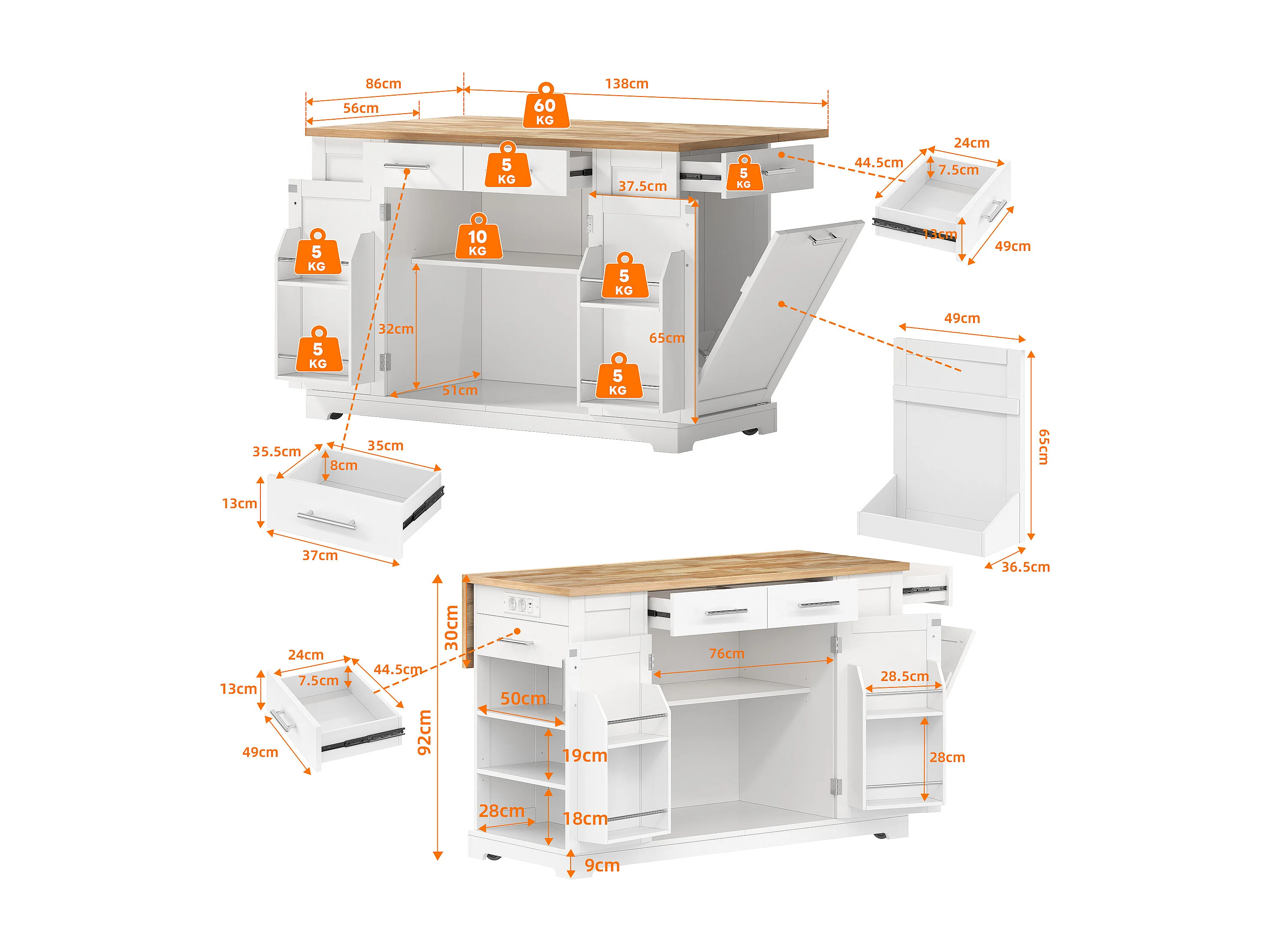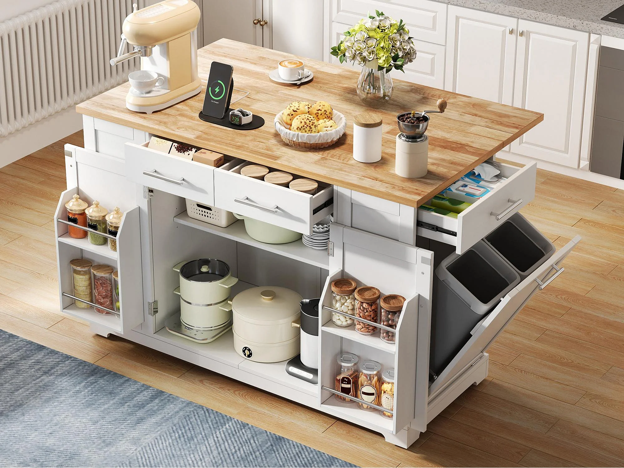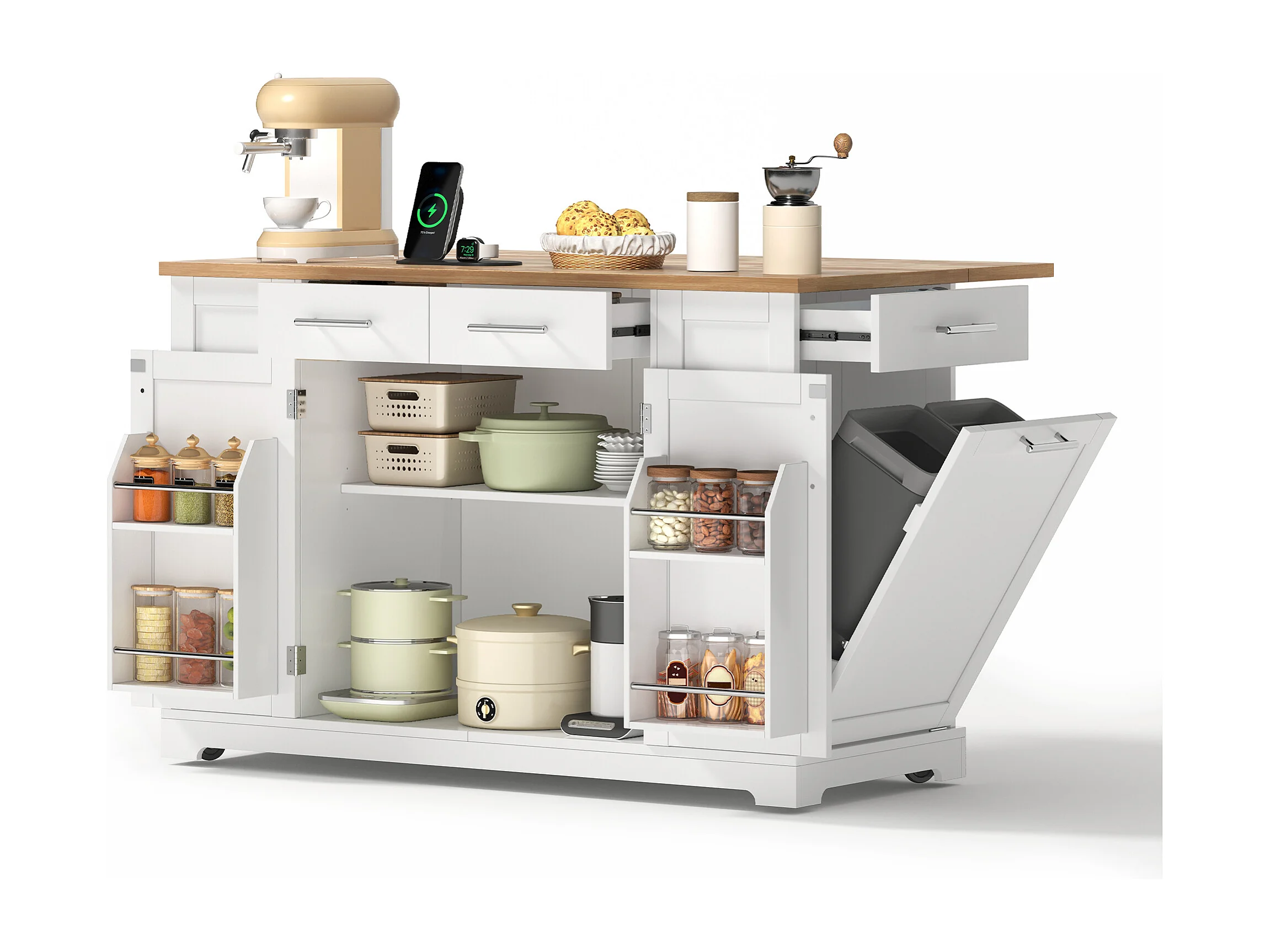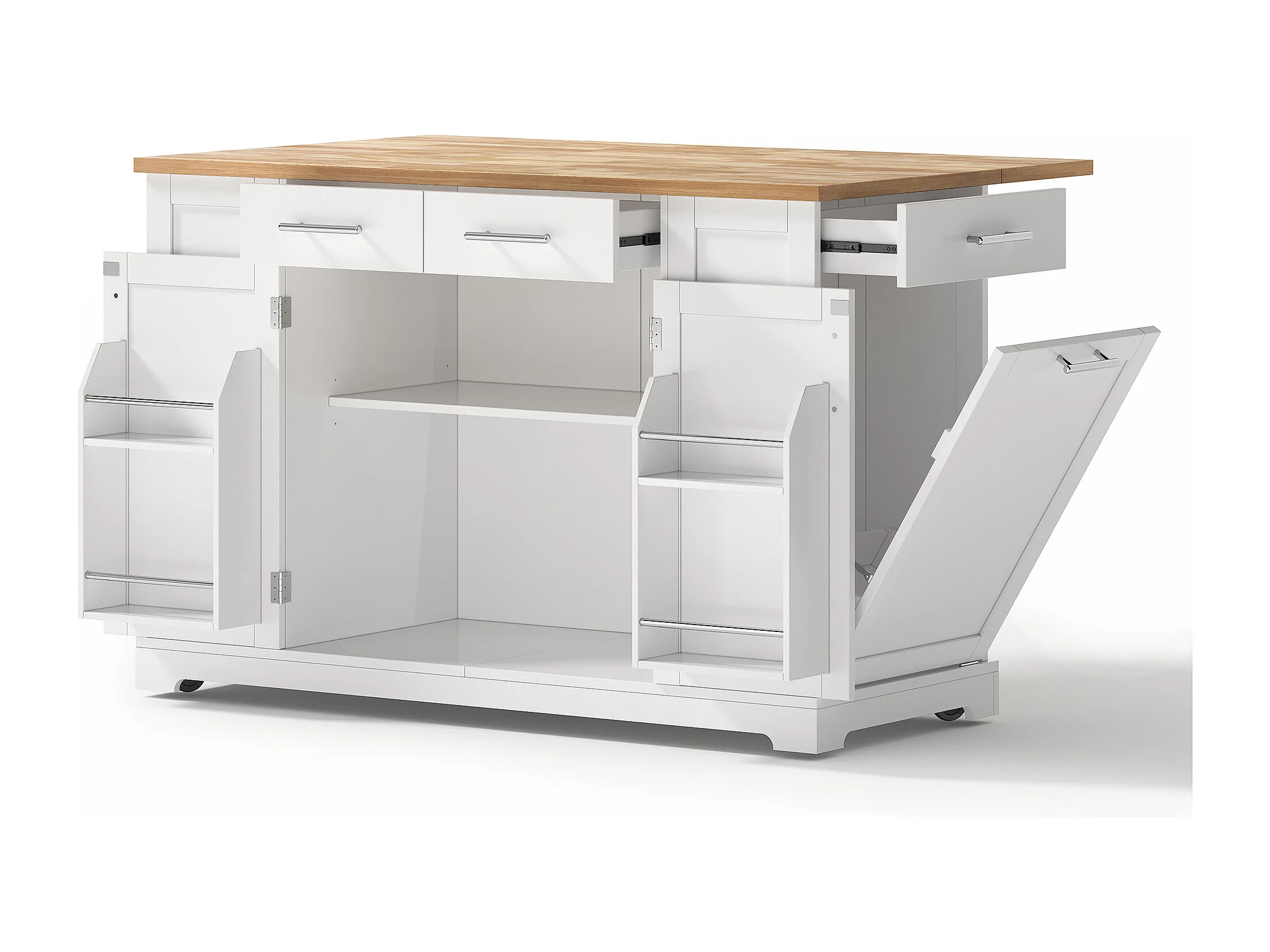 Mobile zentrale Kücheninsel - ausziehbares Tischblatt - mit Steckdose und ausziehbarer Mülltonne - mit Rollen - mit 3 Schubladen und 3 Türen - Weiß + Natur