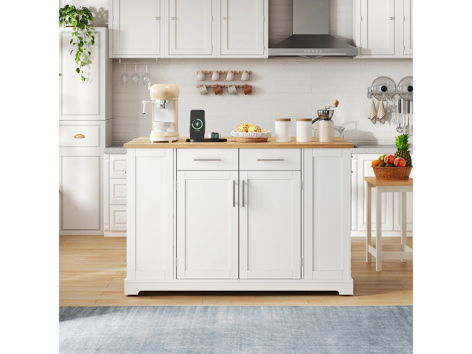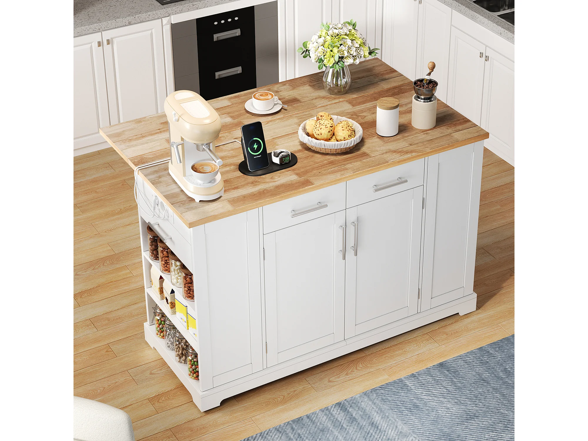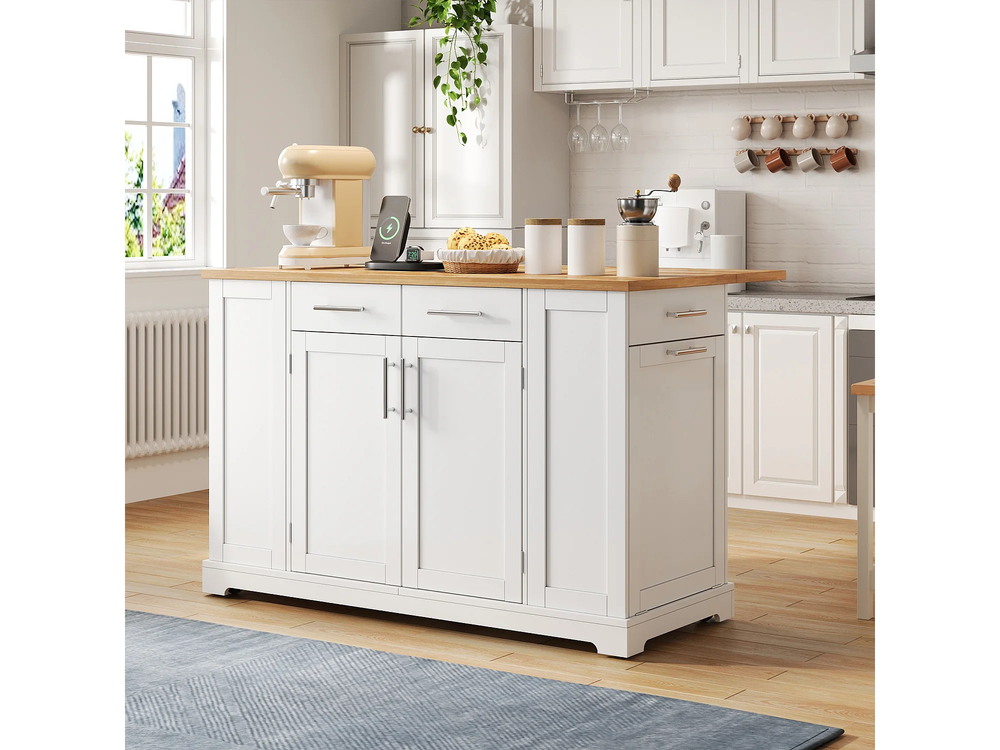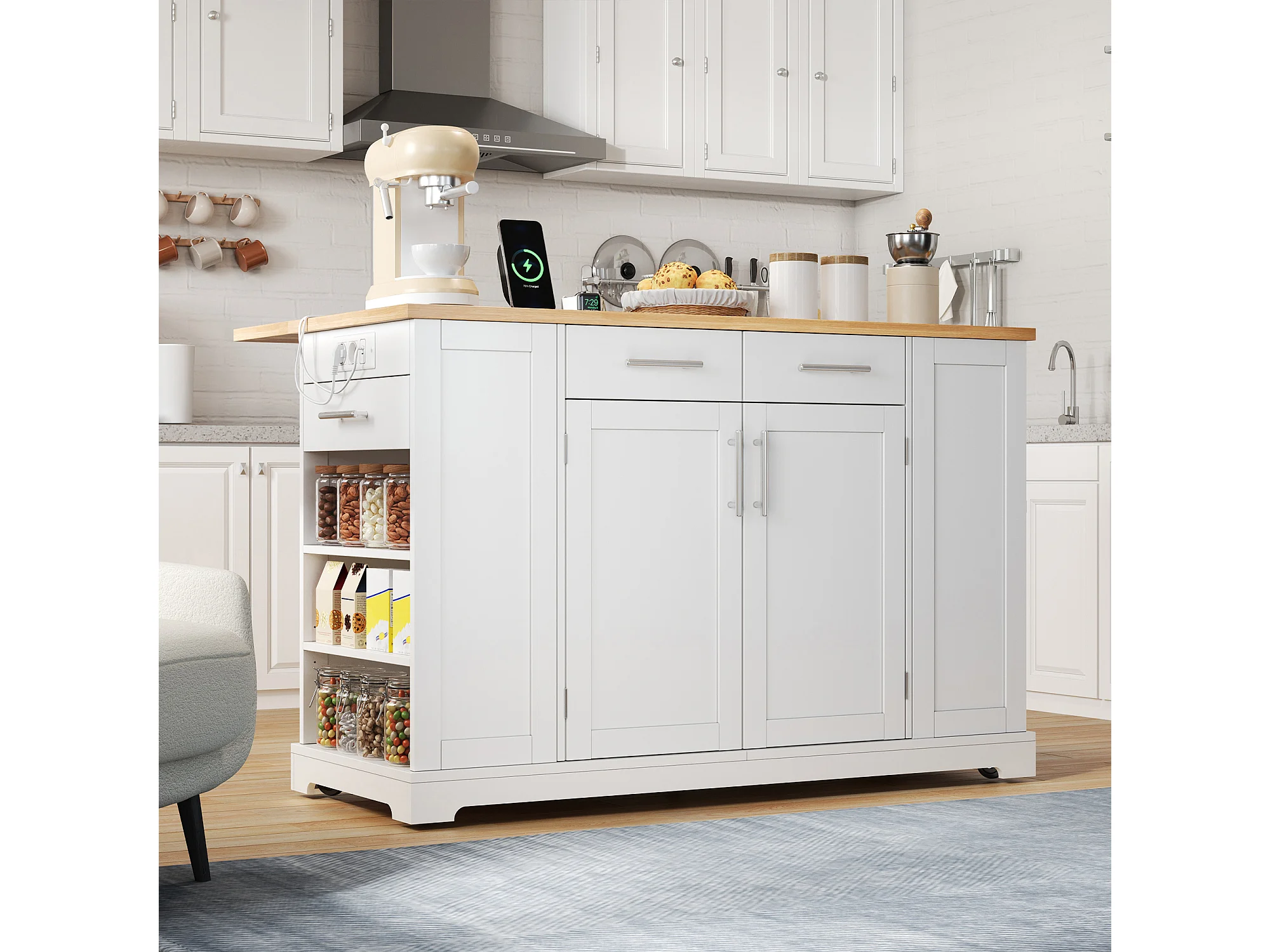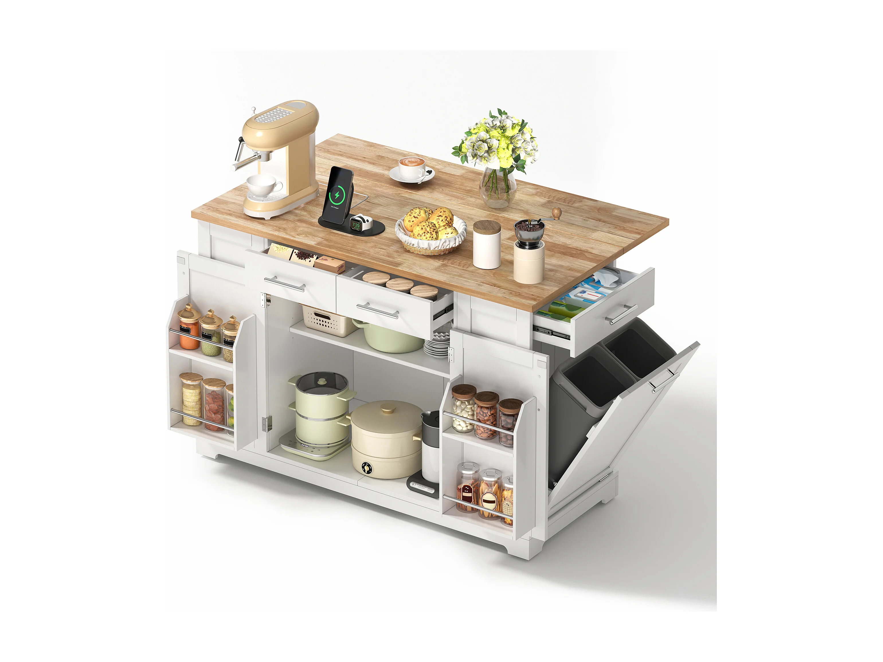Mobile zentrale Kücheninsel - ausziehbares Tischblatt - mit Steckdose und ausziehbarer Mülltonne - mit Rollen - mit 3 Schubladen und 3 Türen - Weiß + Natur