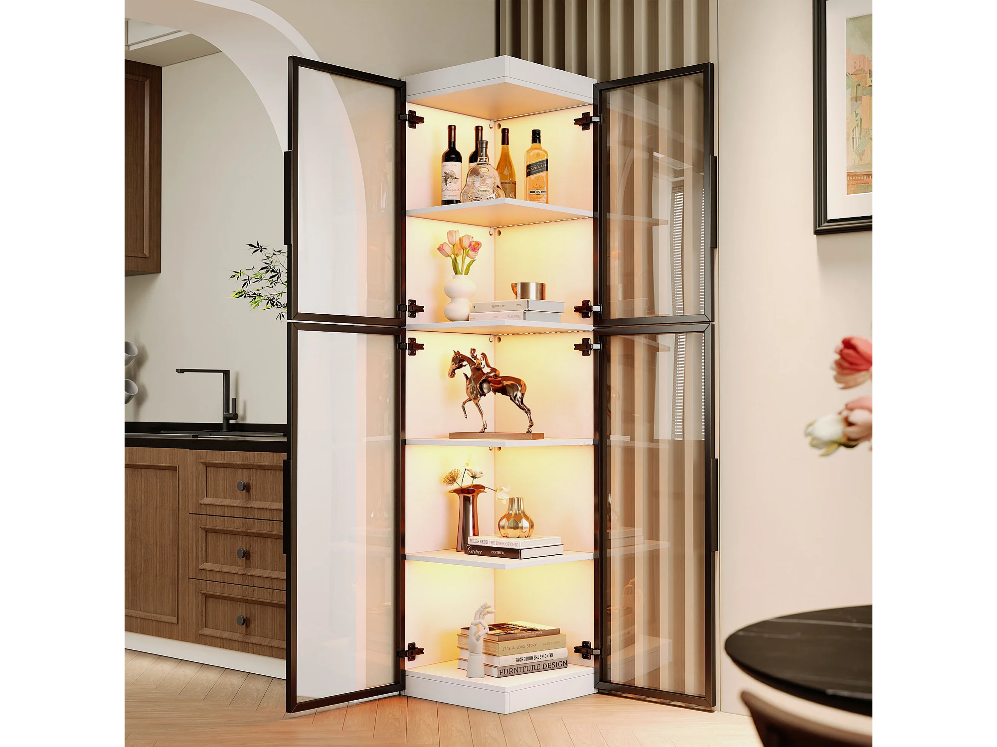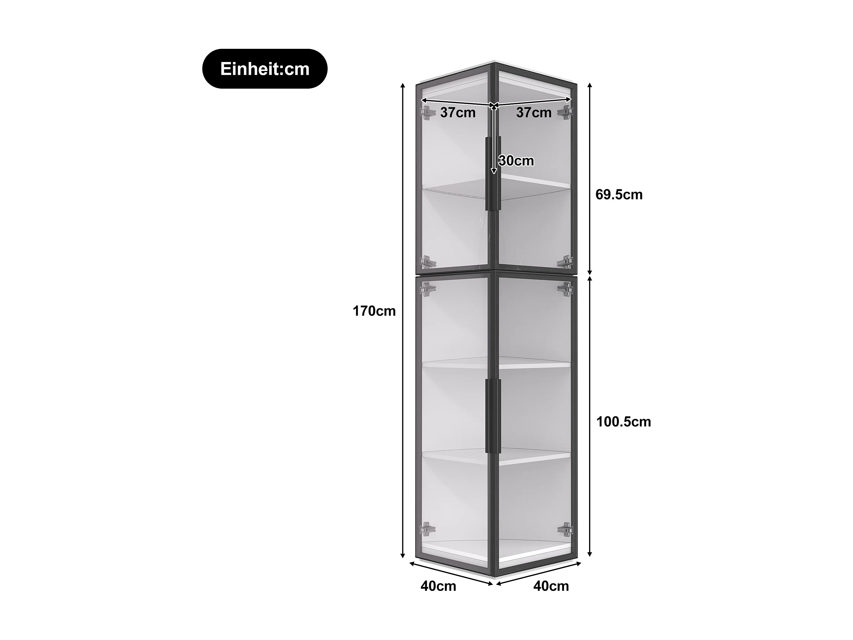 Moderne Vitrine – 40 x 40 x 170 cm – mit 5 Einlegeböden, LED-Beleuchtung und 2 Türen – Acryl + MDF – weiß