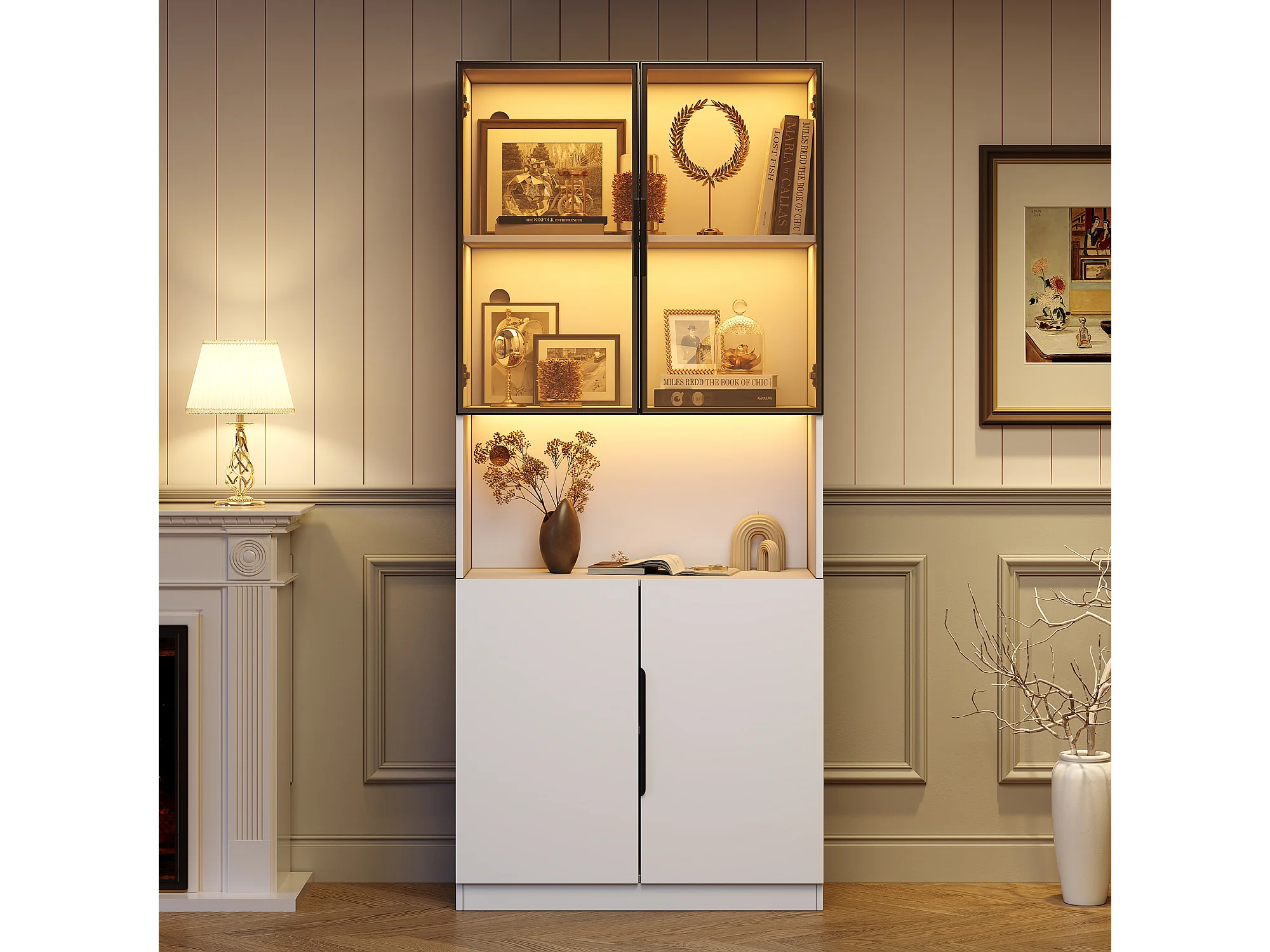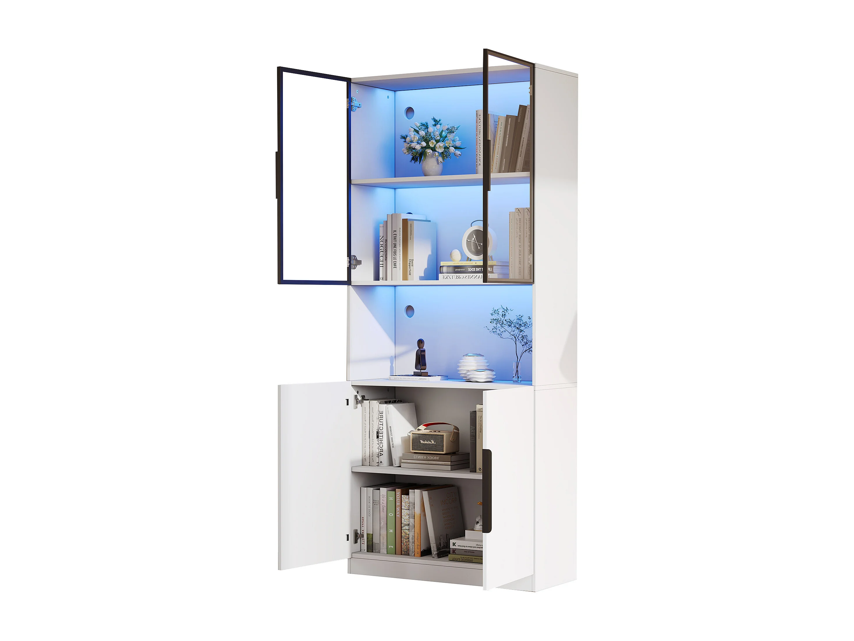 Moderne Vitrine 80x30x200 cm - LED-Beleuchtung - 4 Türen - Höhenverstellbare Regalböden - Spanplatten - Weiß