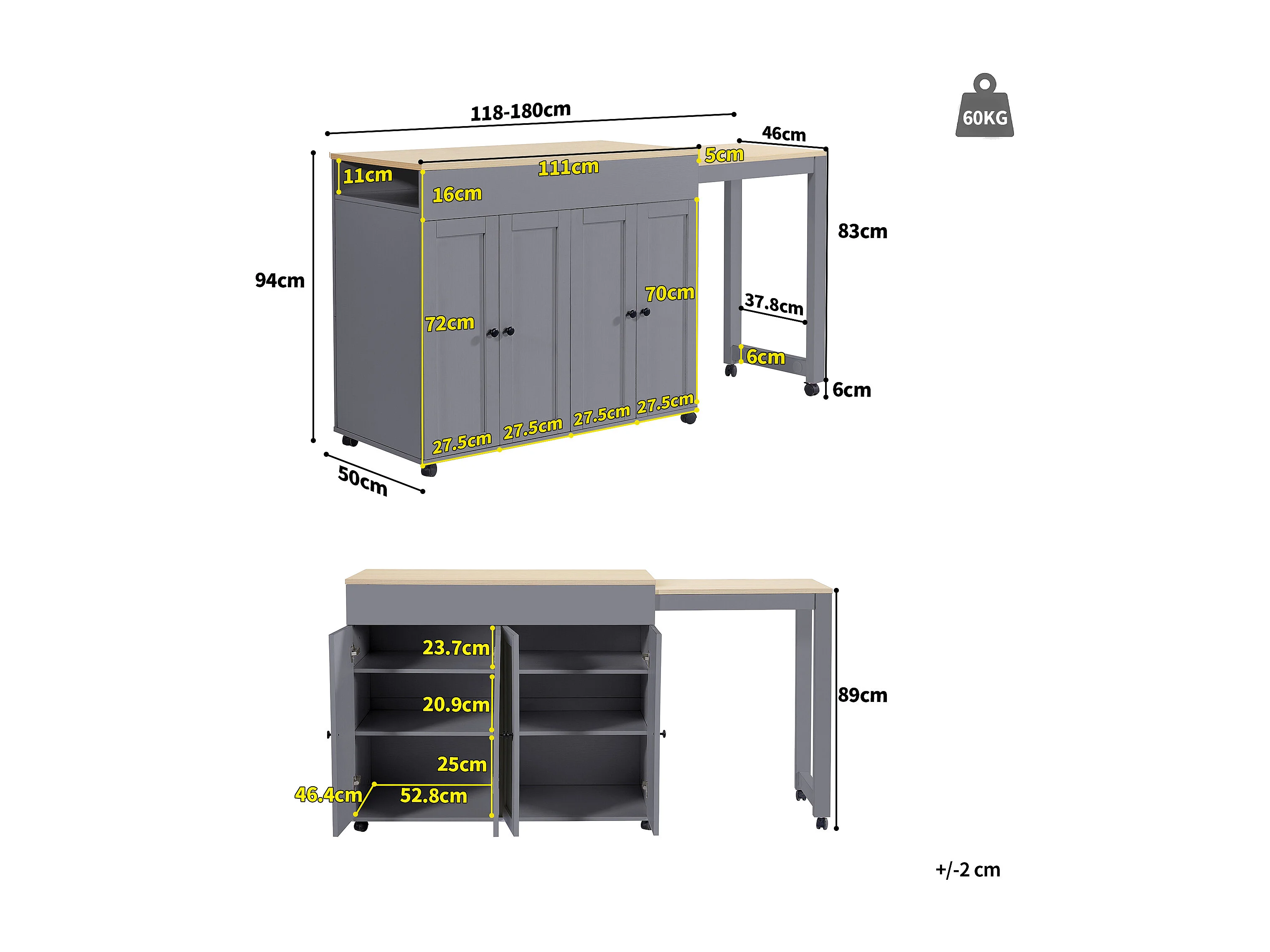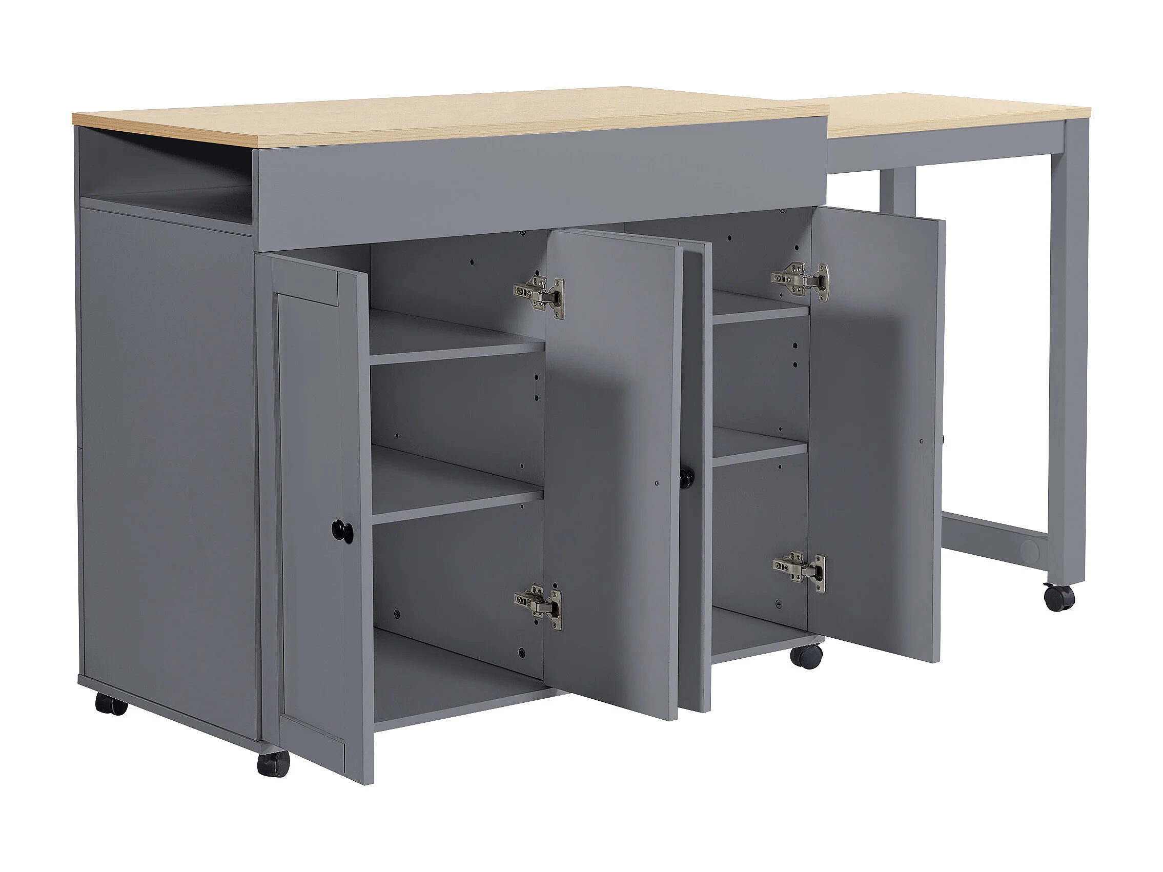 Moderner, ausziehbarer Bartisch – 118–180 x 50 x 94 cm – mit 4 Türen und 6 Ablagen – MDF – grau