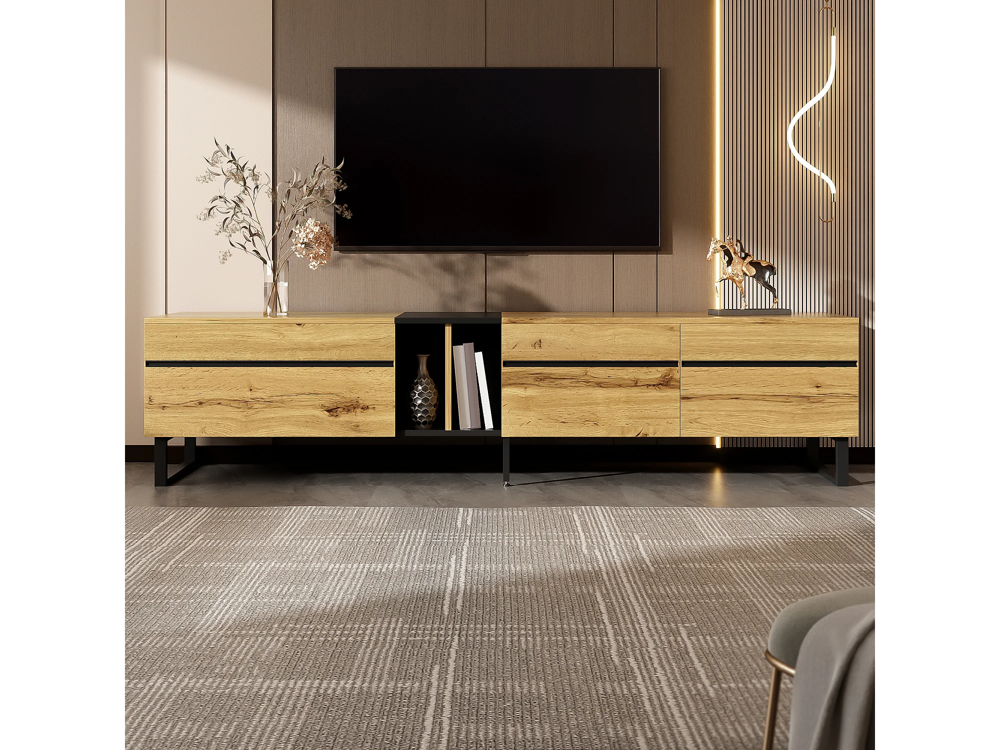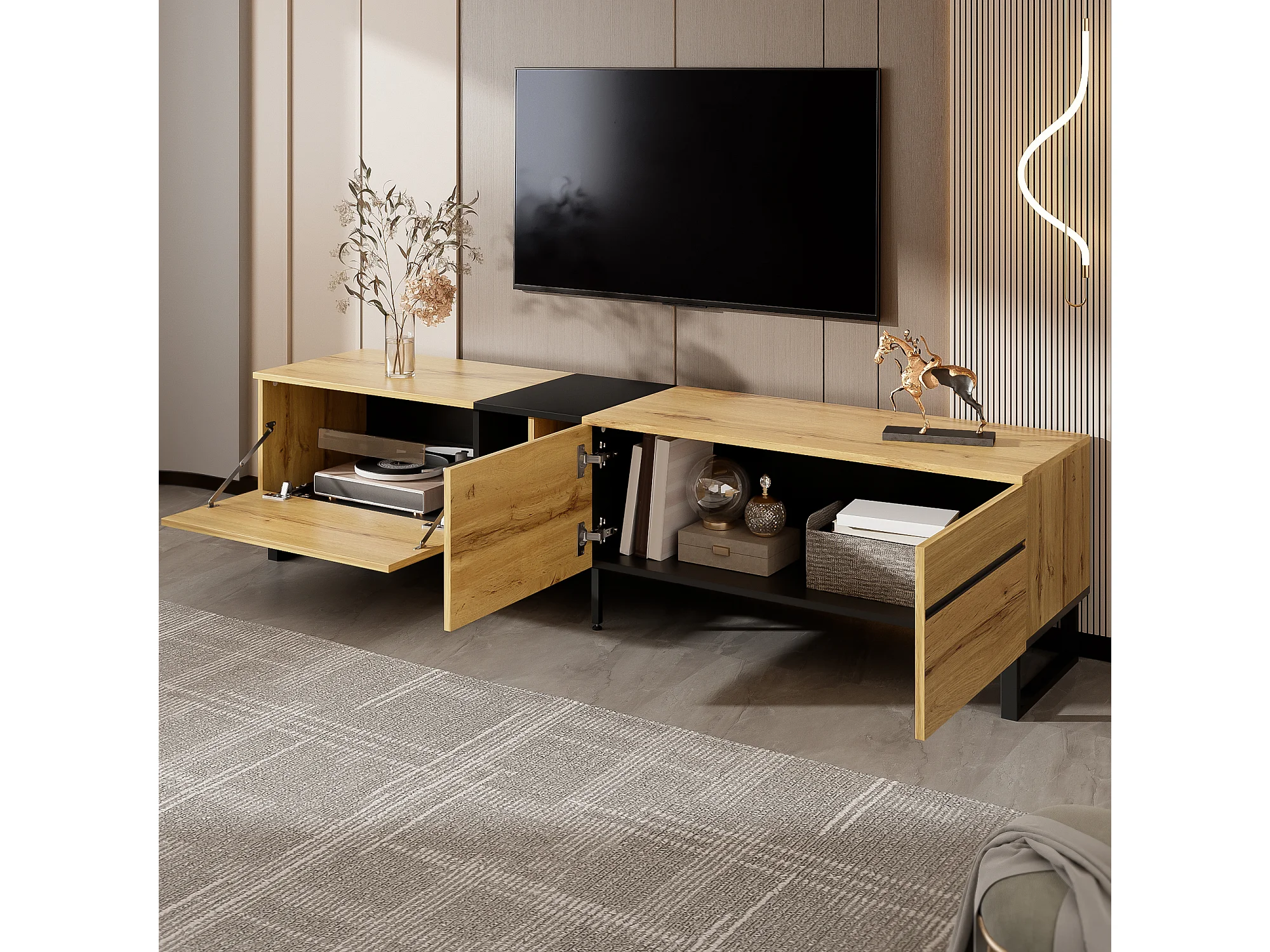 Moderner, niedriger TV-Ständer – 180 x 38 x 45 cm – mit 3 Türen + offenen Regalen – Spanplatte – natur