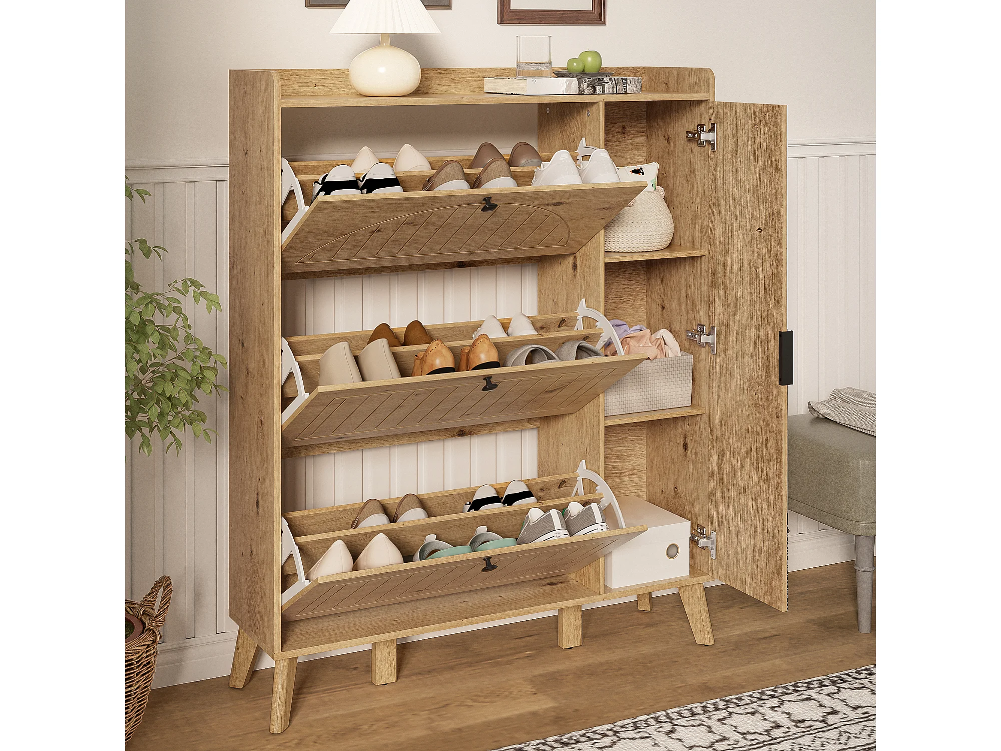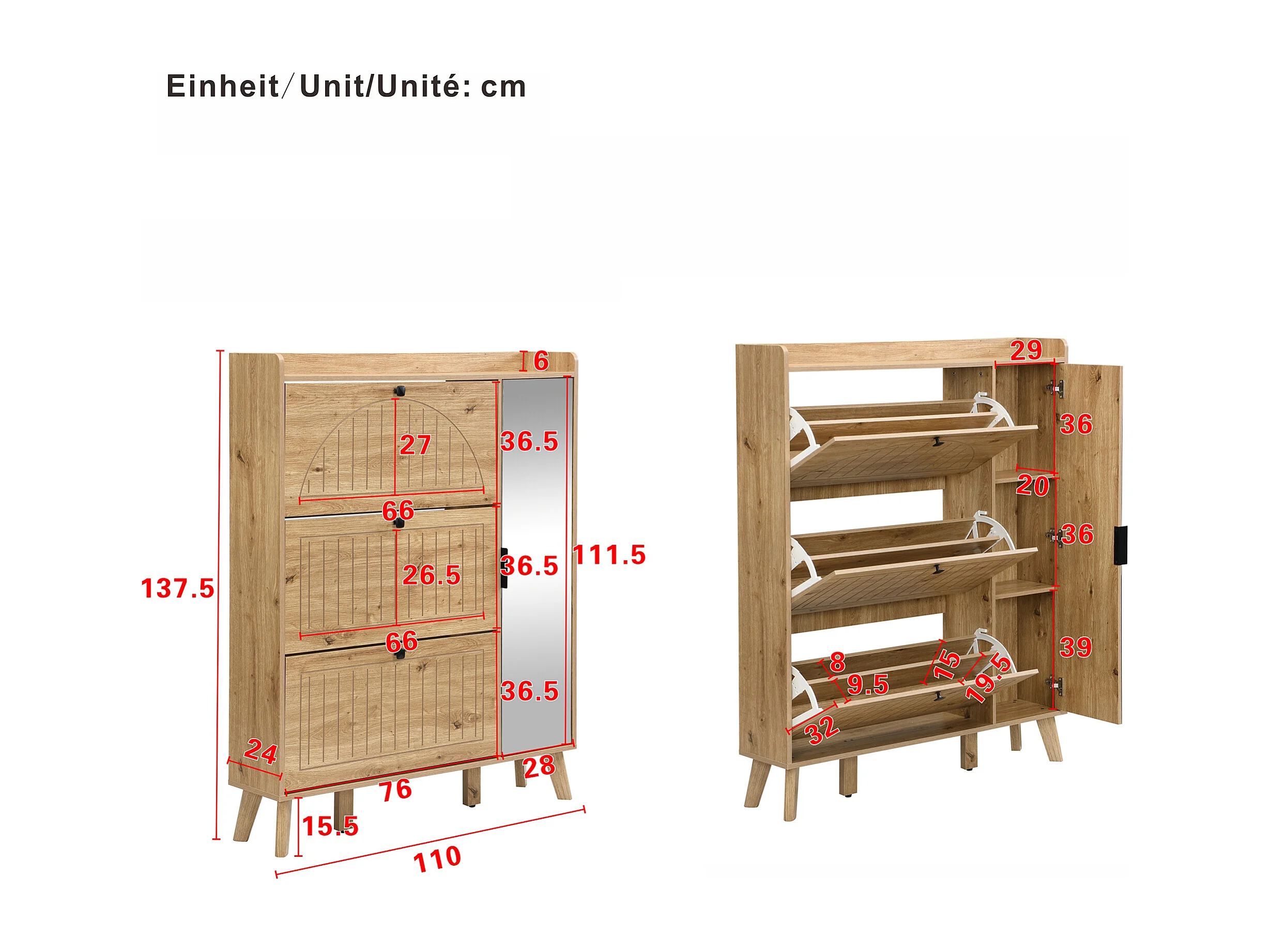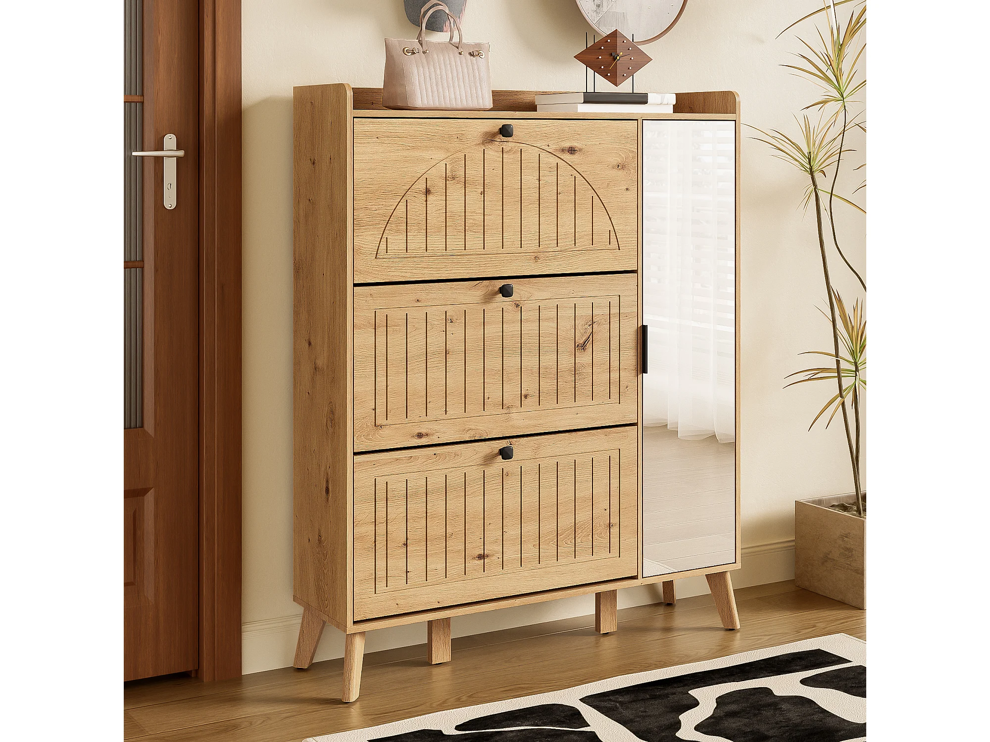 Moderner Schuhschrank 110×24×137,5 cm - mit 3 Klapptüren - mit Spiegel - Massivholzfüße - Natur
