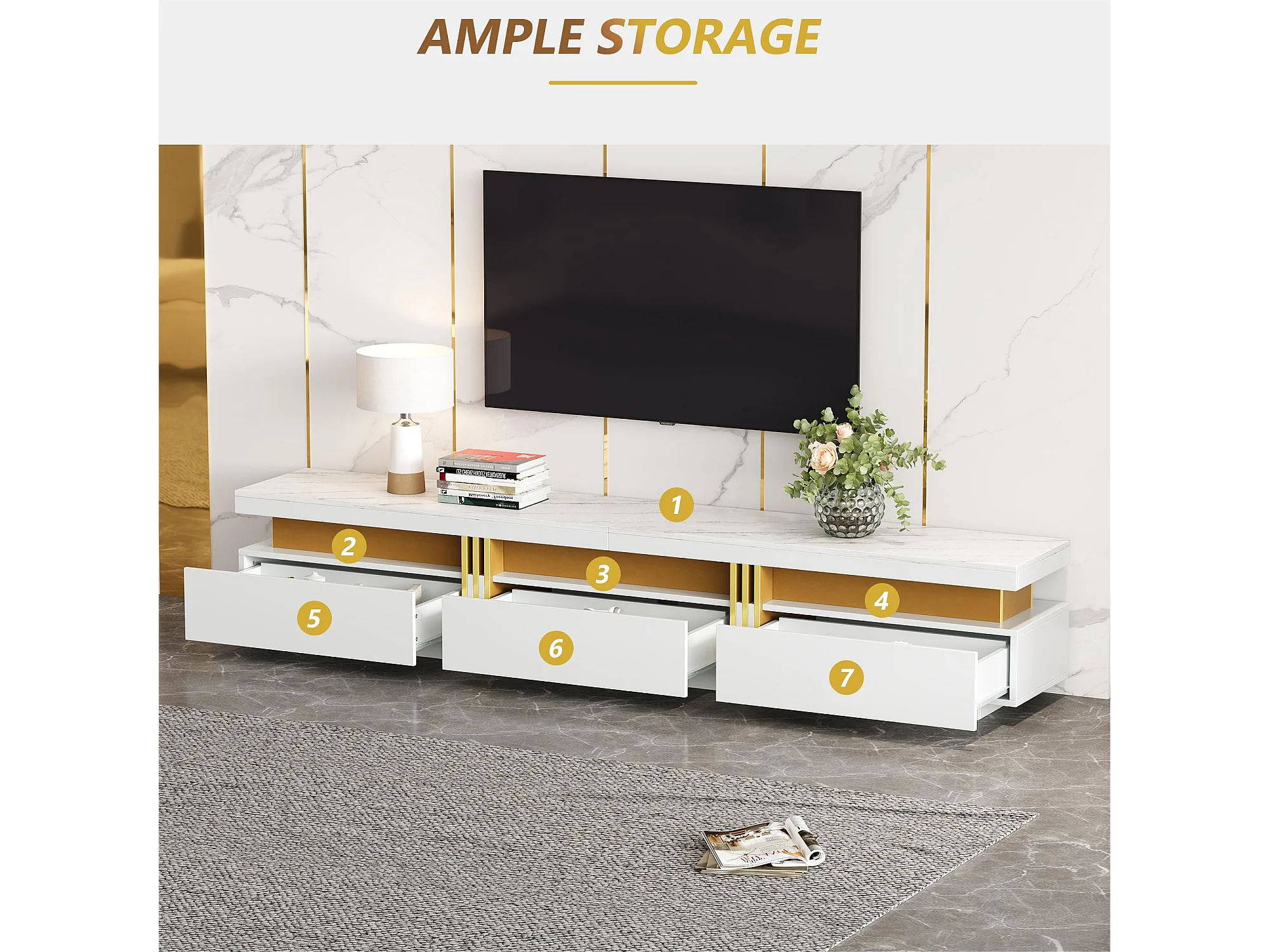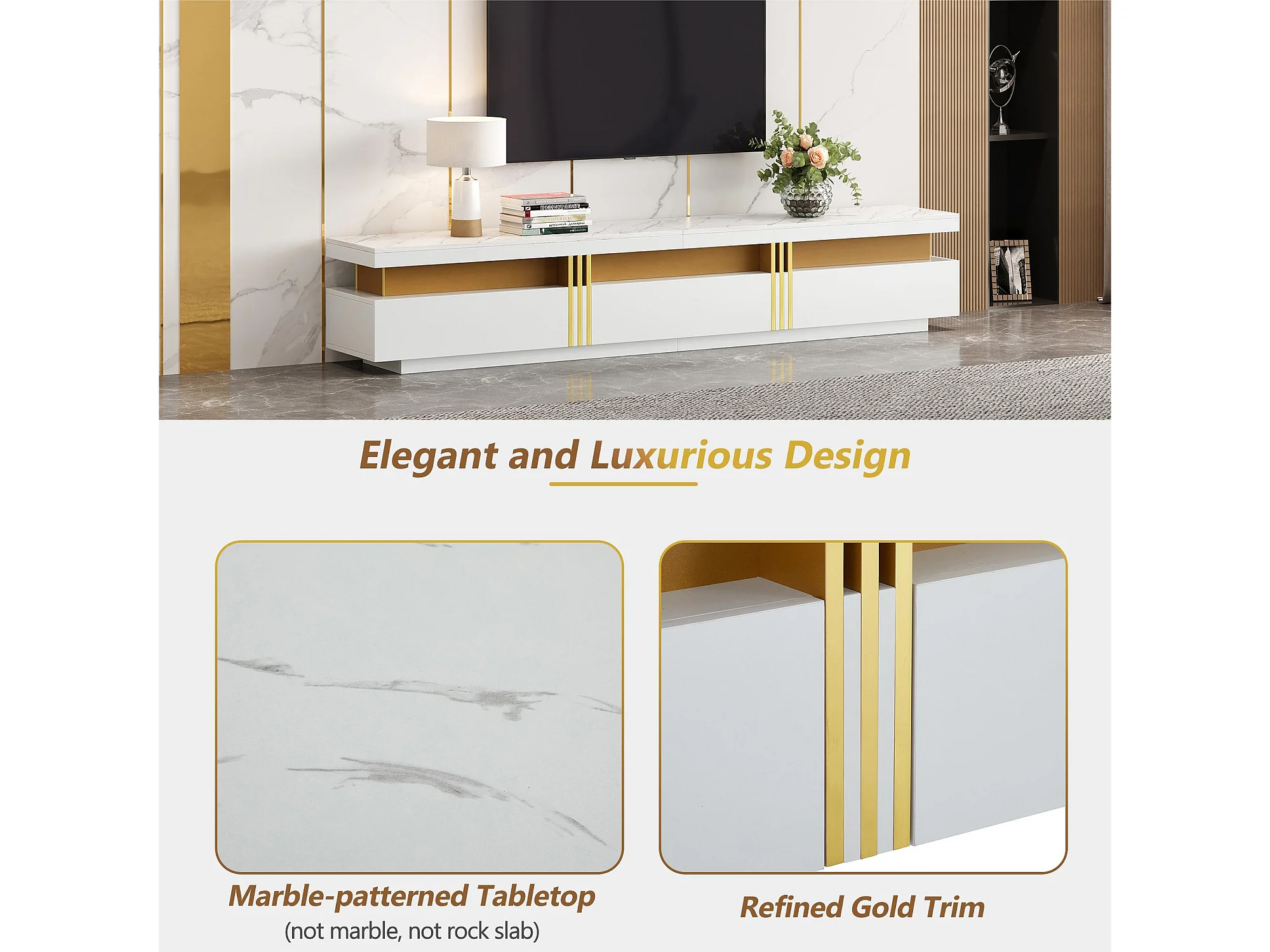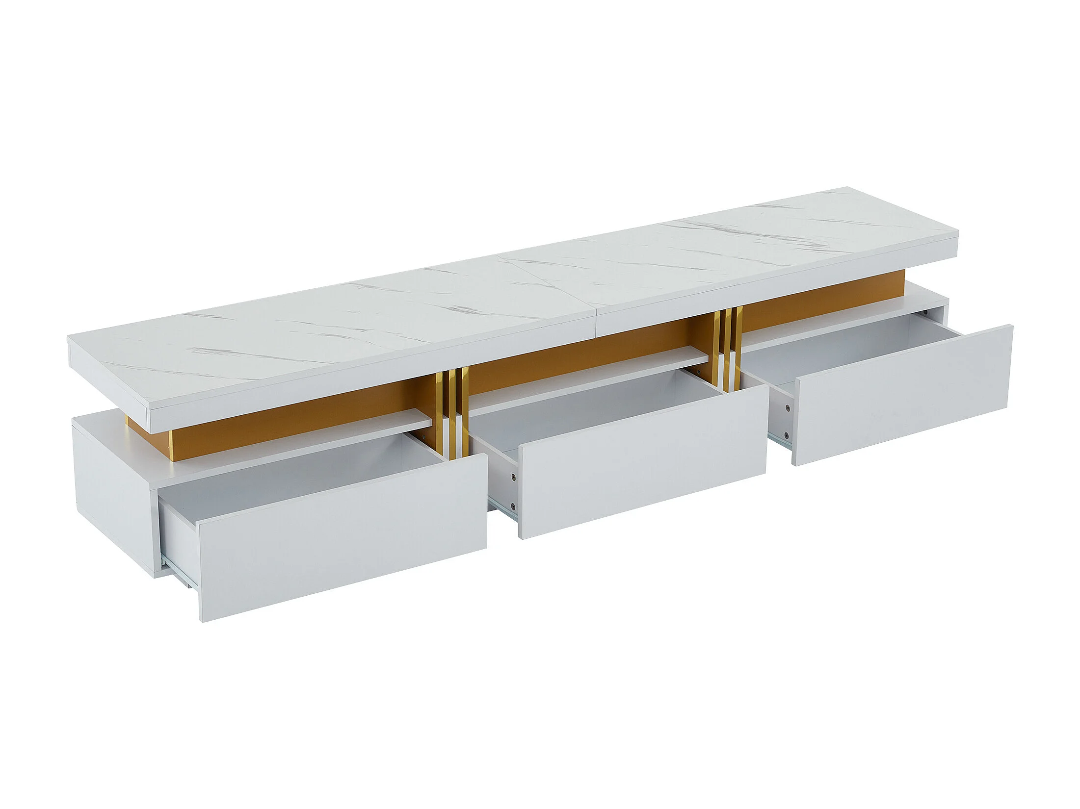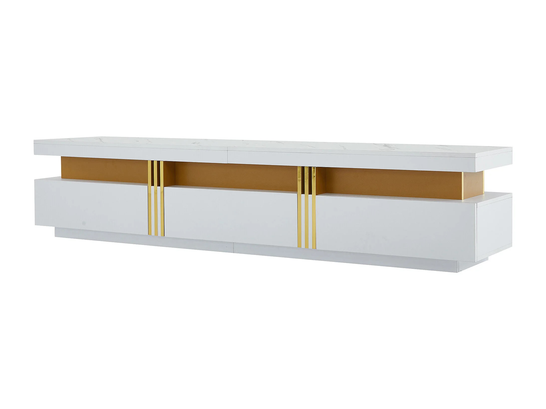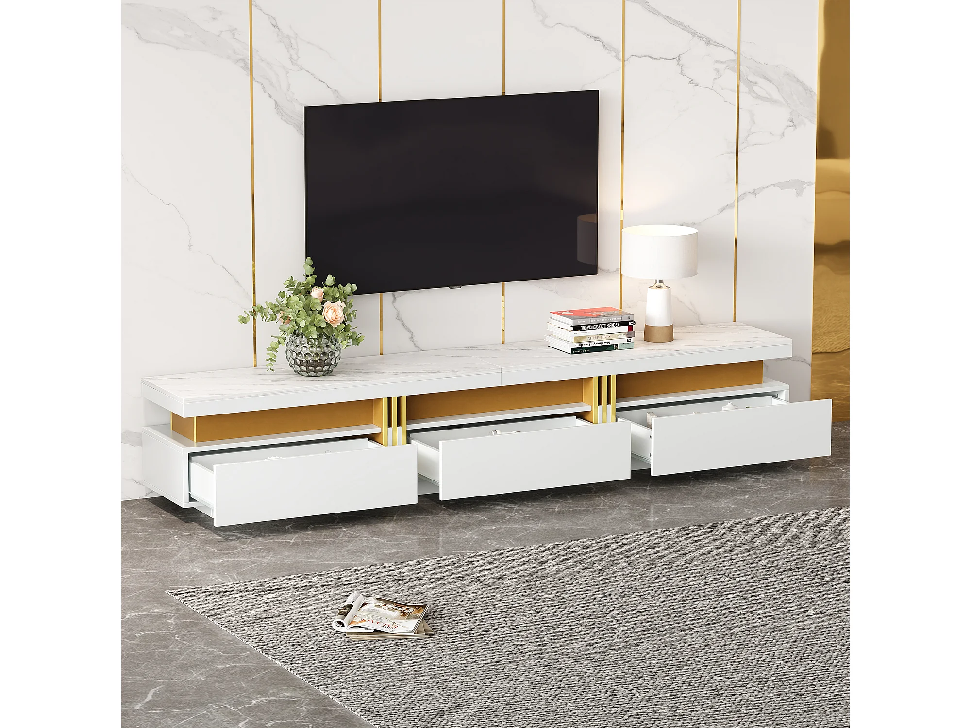 Moderner TV-Schrank 200 cm – mit 3 Schubladen – Marmoreffekt – Weiß