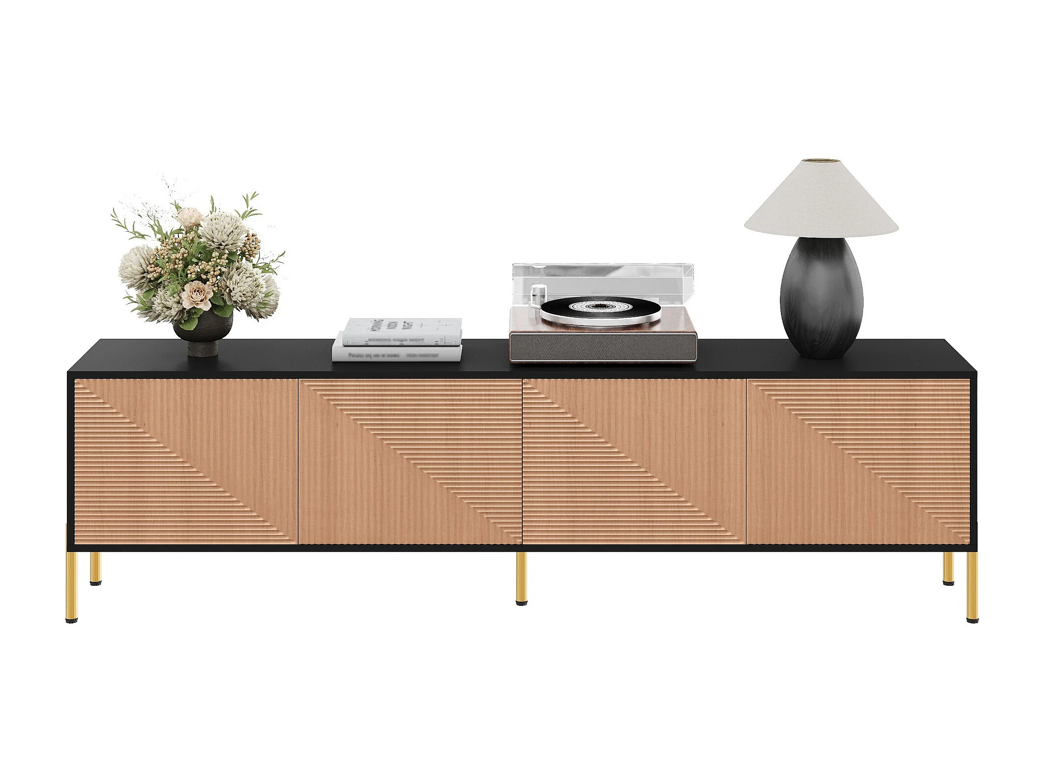 Moderner TV-Ständer – 179 x 35 x 53,5 cm – einzigartiges Design – mit 4 Türen – Spanplatte – schwarz + natur