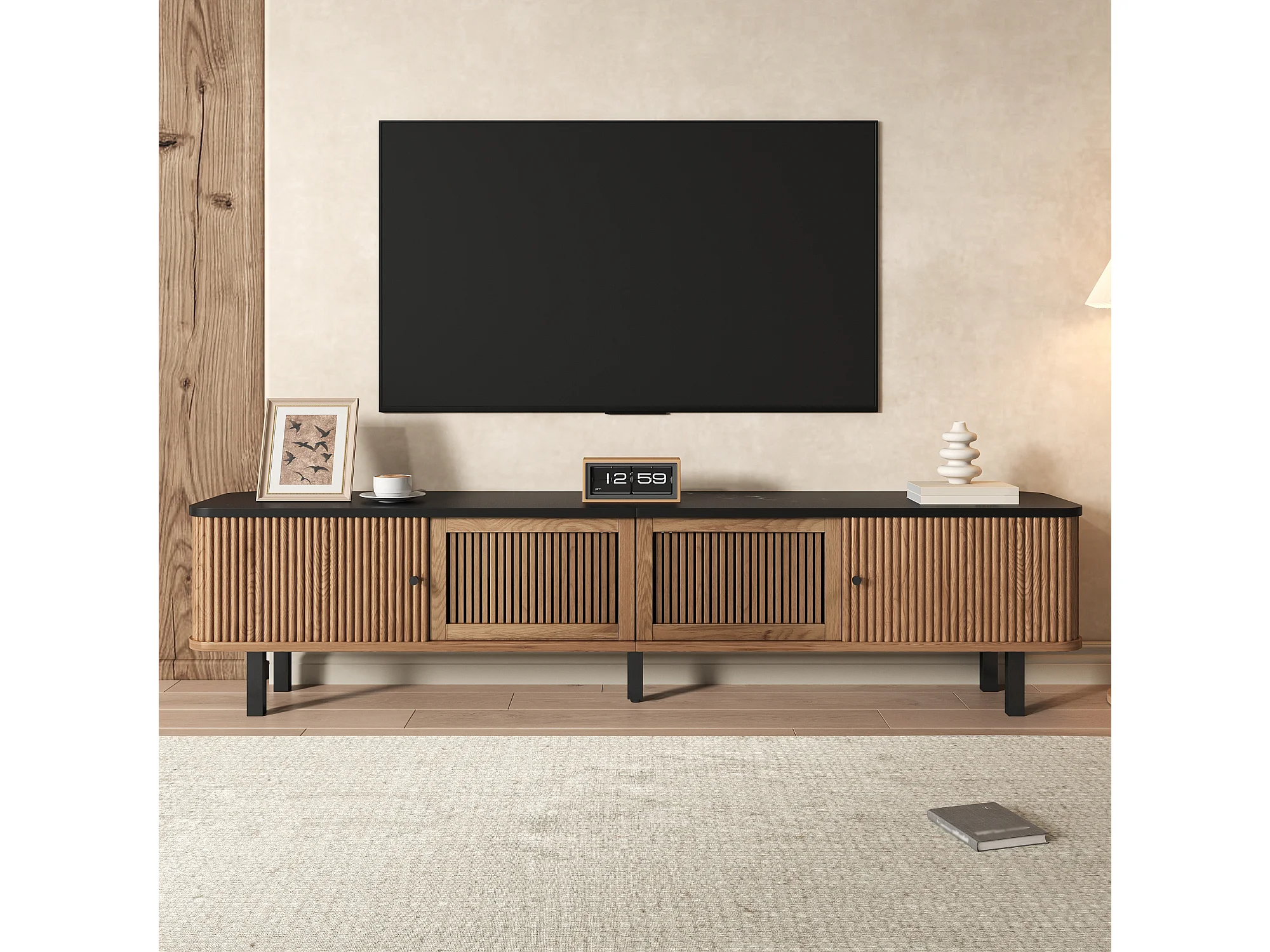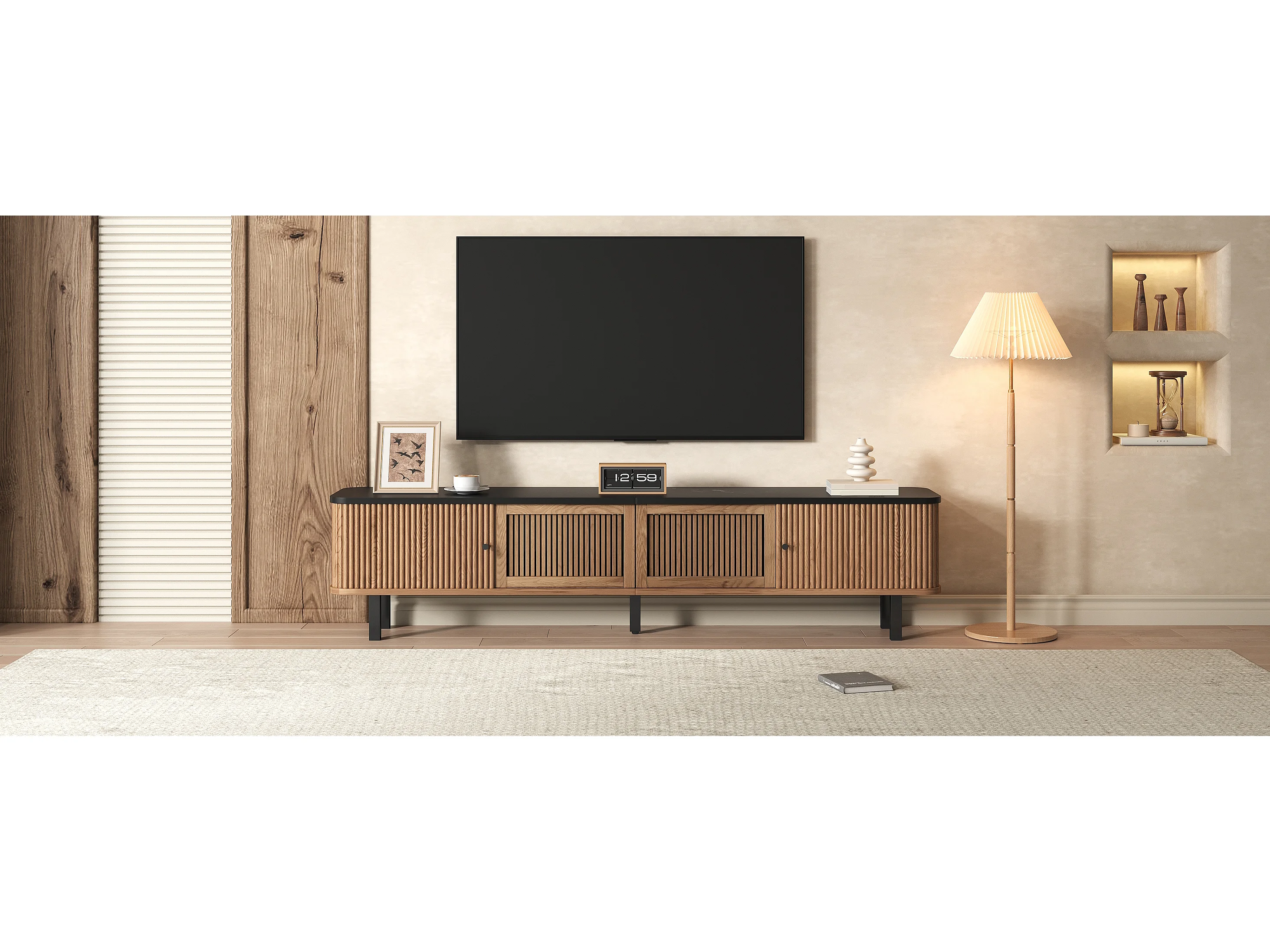 Moderner TV-Ständer – 190 x 35 x 45 cm – mit 2 Schiebetüren + 2 Gittertüren – MDF + Spanplatte – natur