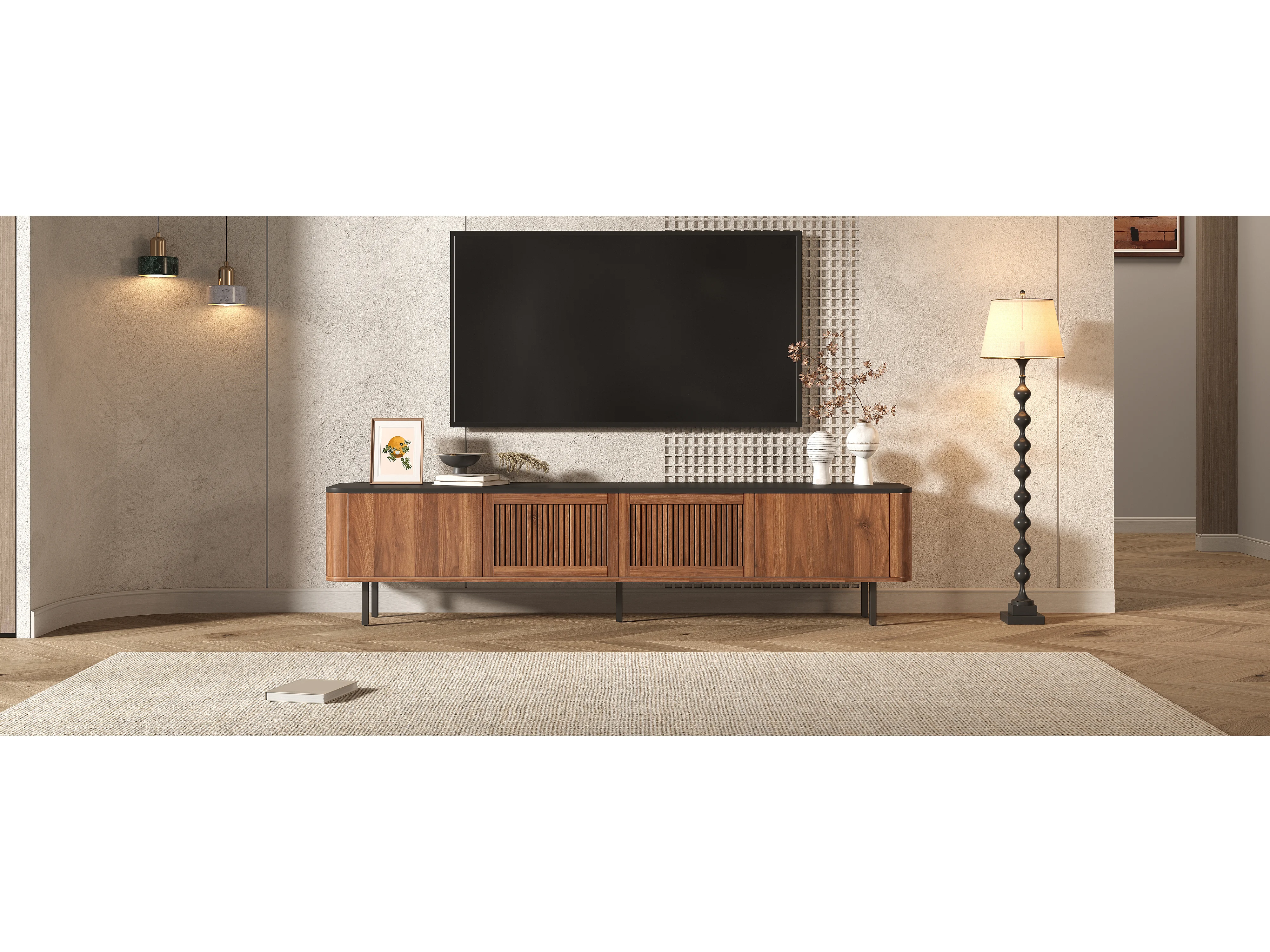 Moderner TV-Ständer – 190 x 35 x 45 cm – mit 4 Türen – Einzigartiges Design – MDF + Spanplatte – braun