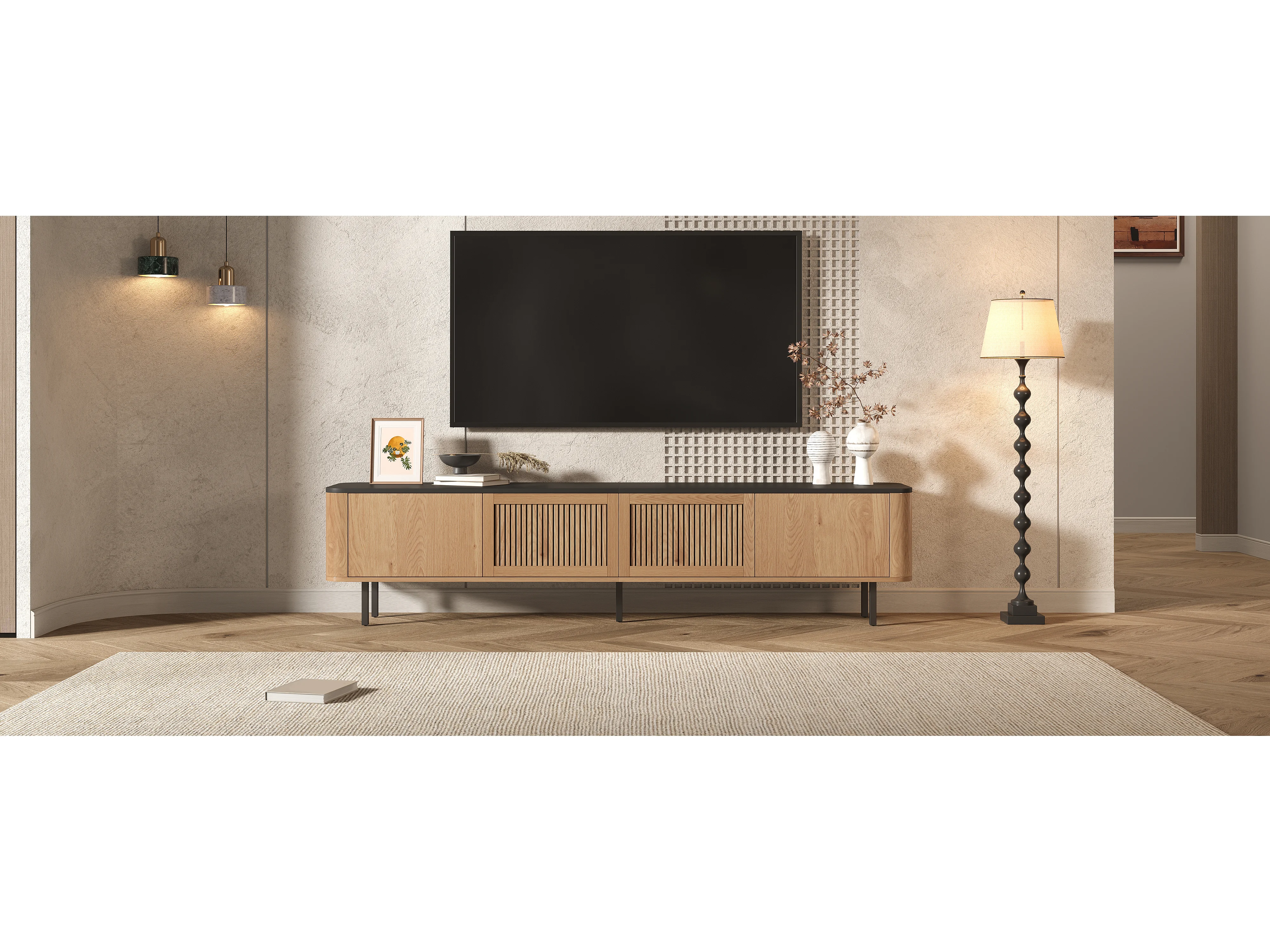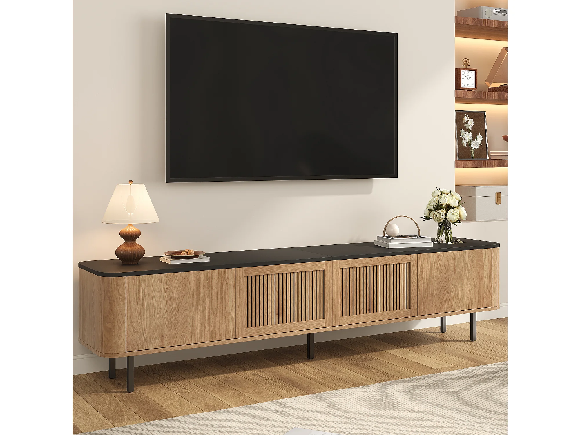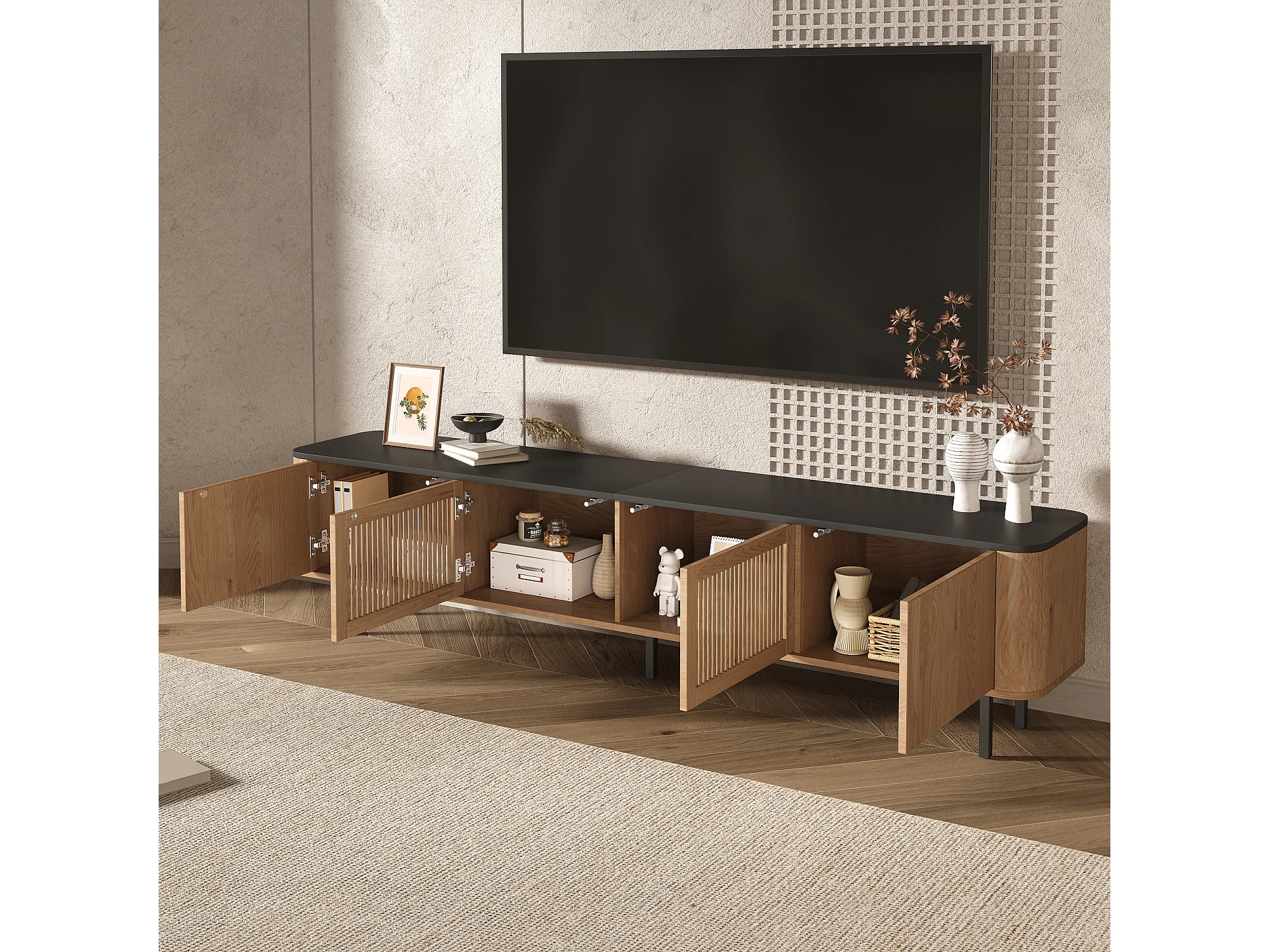 Moderner TV-Ständer – 190 x 35 x 45 cm – mit 4 Türen – Einzigartiges Design – MDF + Spanplatte – Natur