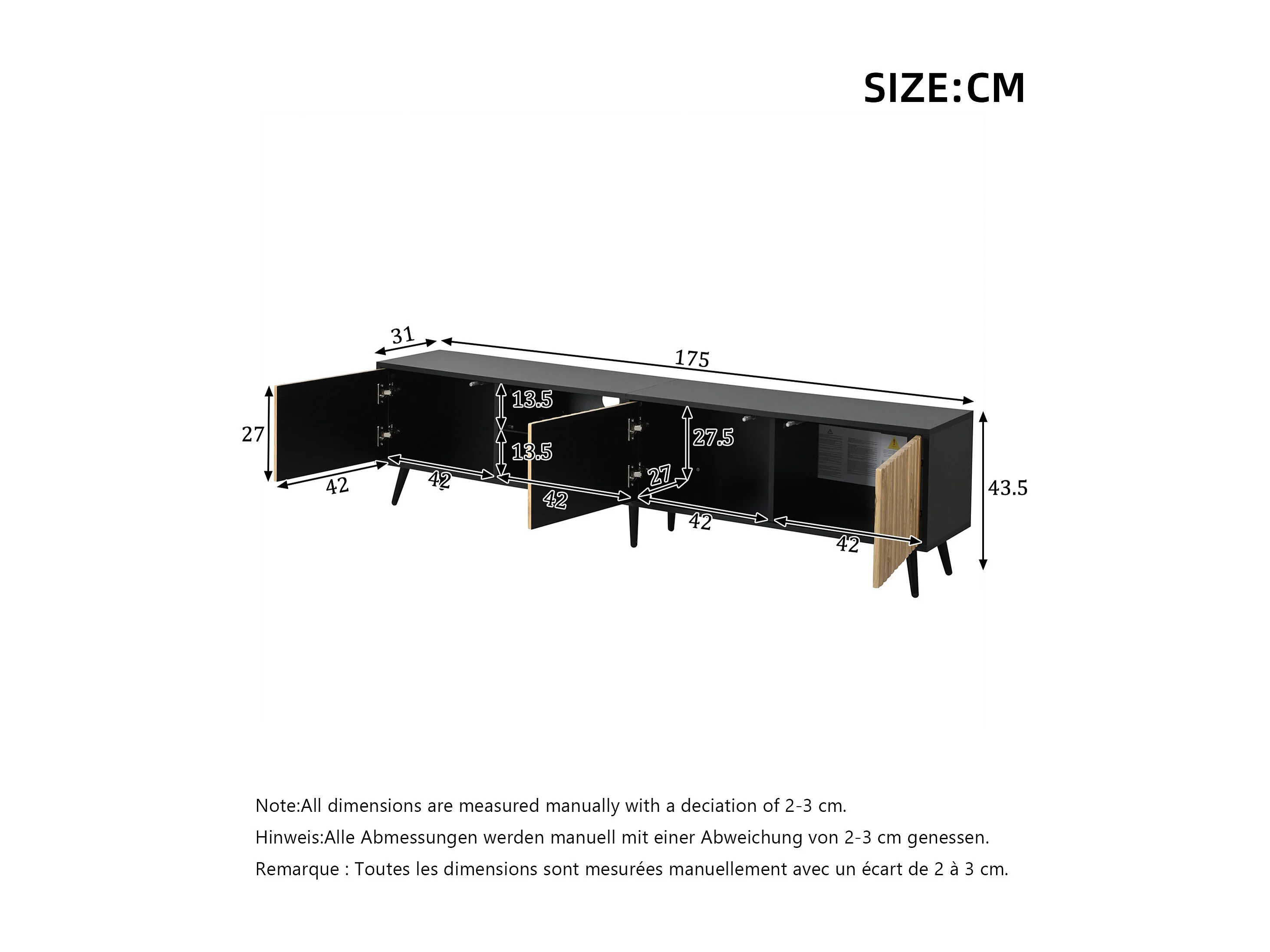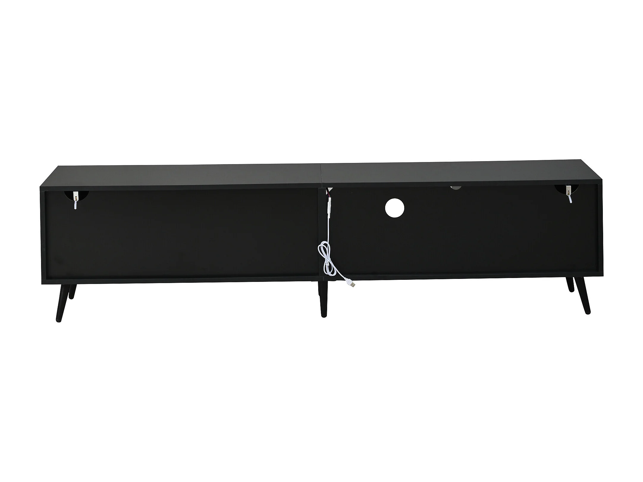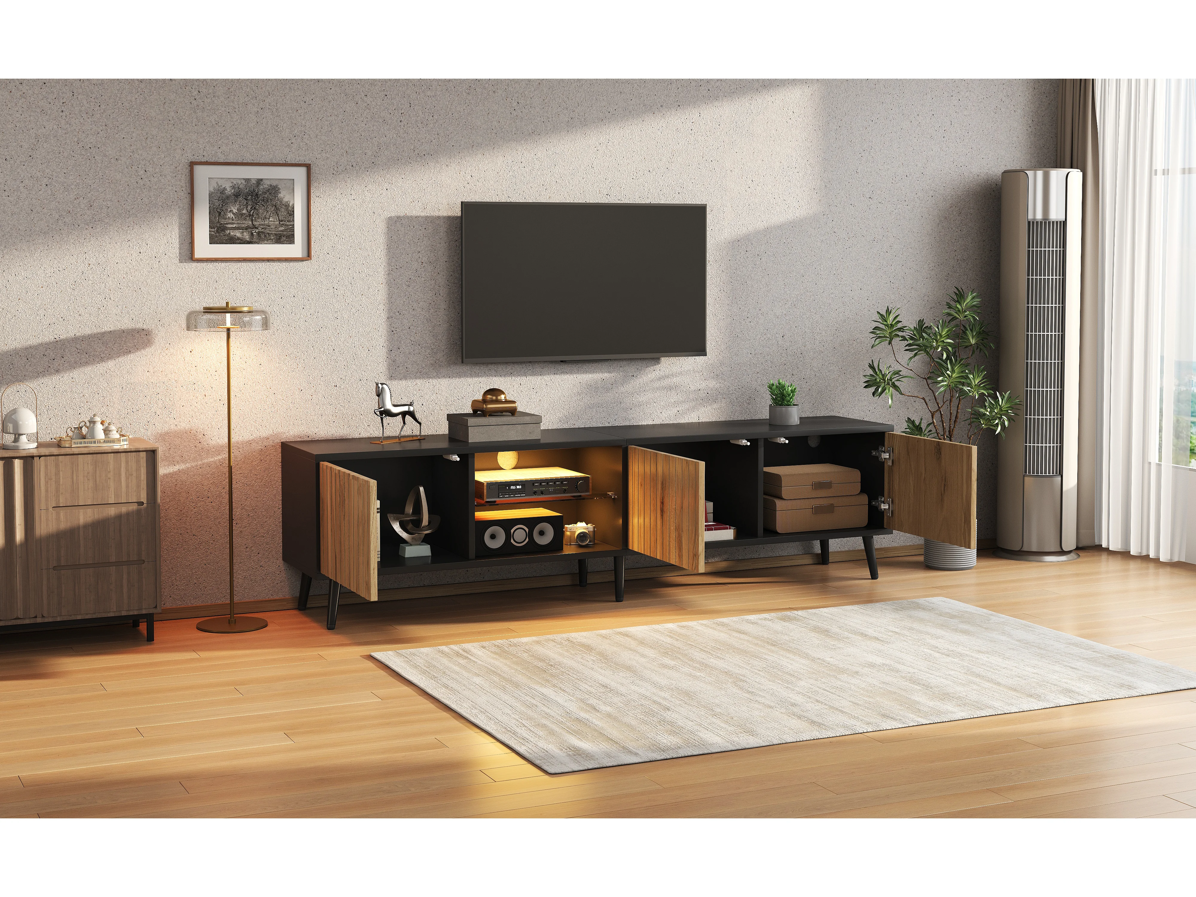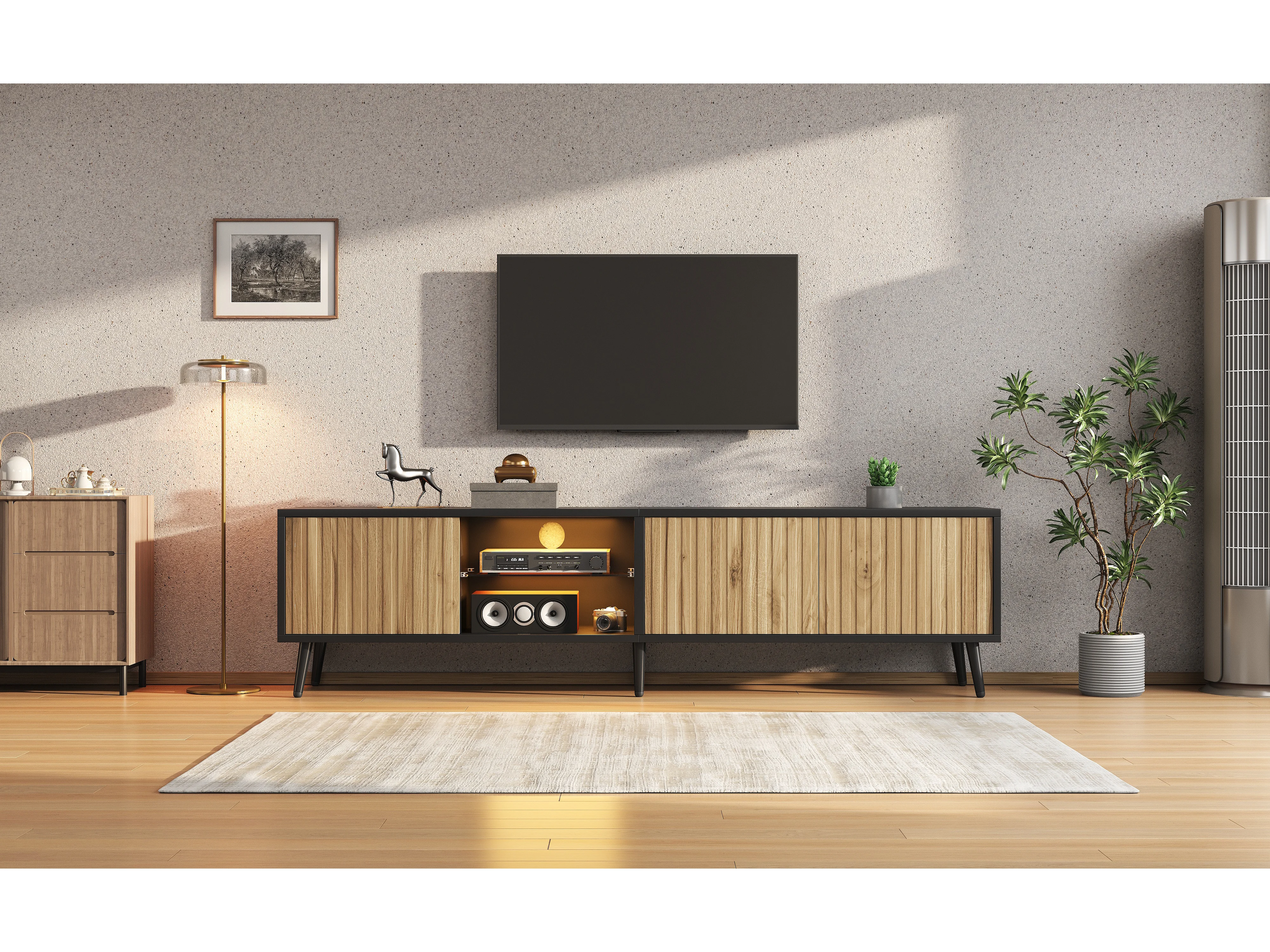 Moderner TV-Ständer fürs Wohnzimmer – 175 x 31 x 43,5 cm – mit 3 Türen, Ablagefach und LED-Beleuchtung – für 75-Zoll-Fernseher – Spanplatte – Natur