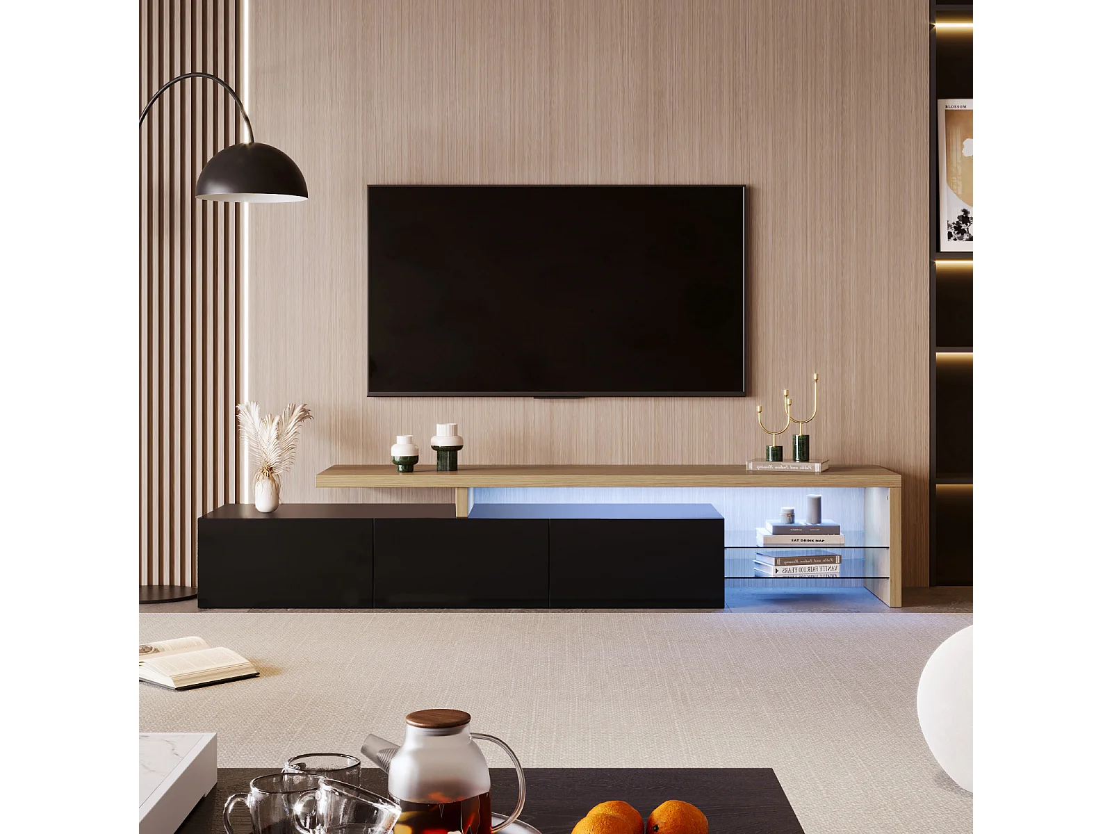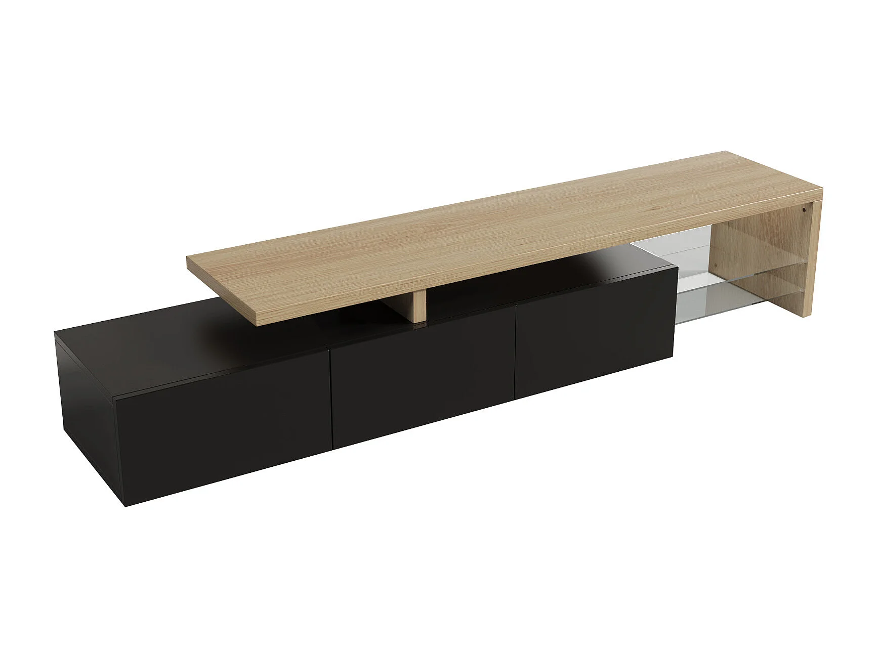 Moderner TV-Ständer mit dimmbaren LED-Leuchten, 3 Türen und Glasböden - Schwarz