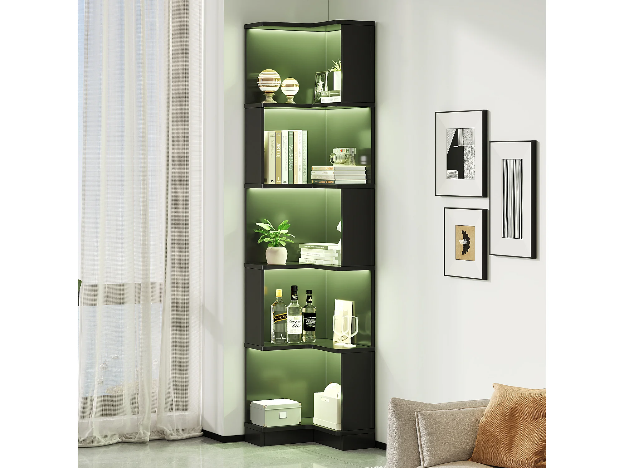 Modernes Eckregal – 63,5 x 45 x 175 cm – mit LED-Beleuchtung + 5 Ablagefächern – MDF – schwarz