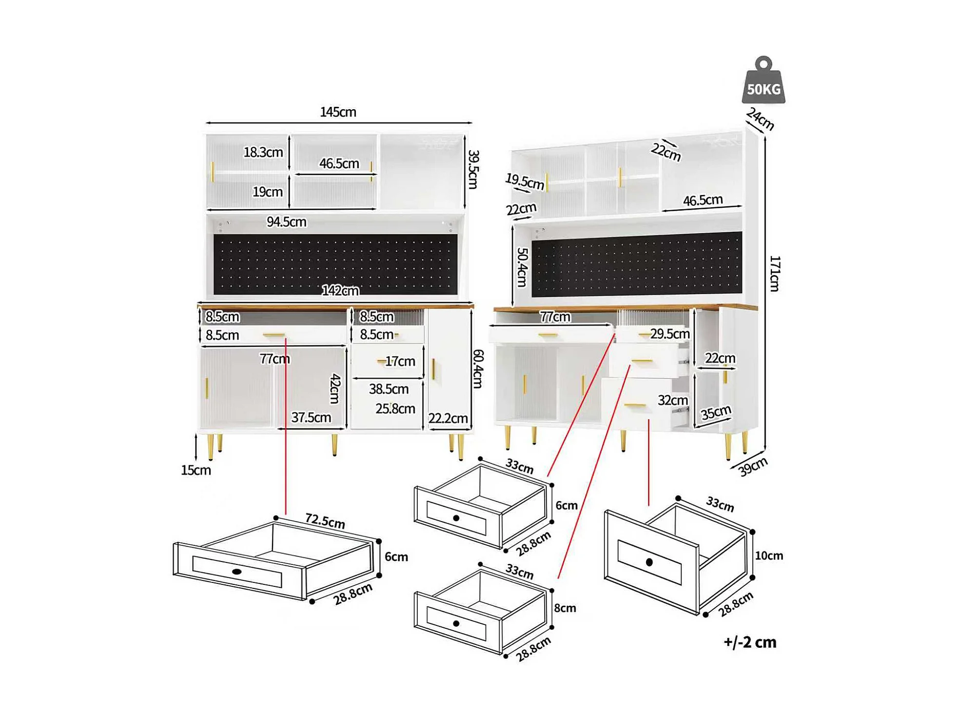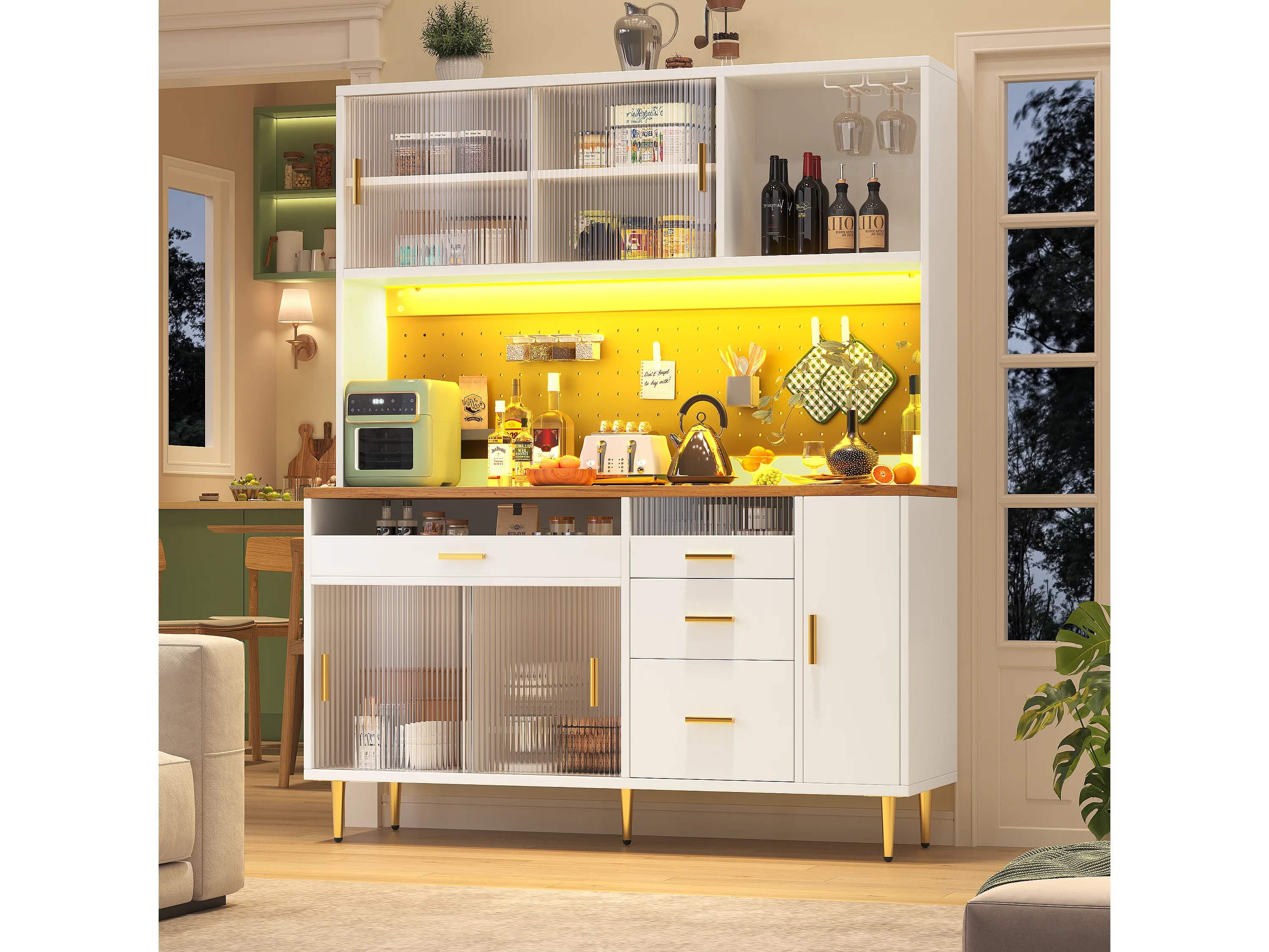 Modernes Küchen-Sideboard – 145 x 24 x 171 cm – mit LED-Beleuchtung, Regalböden, Türen und 4 Schubladen – Glas und MDF – weiß