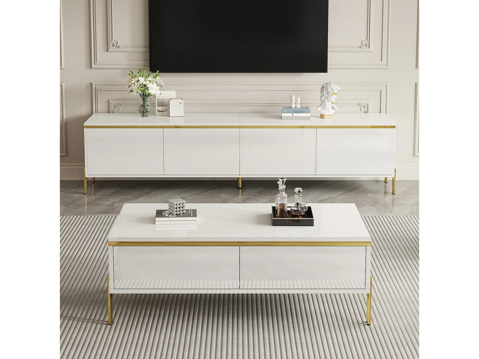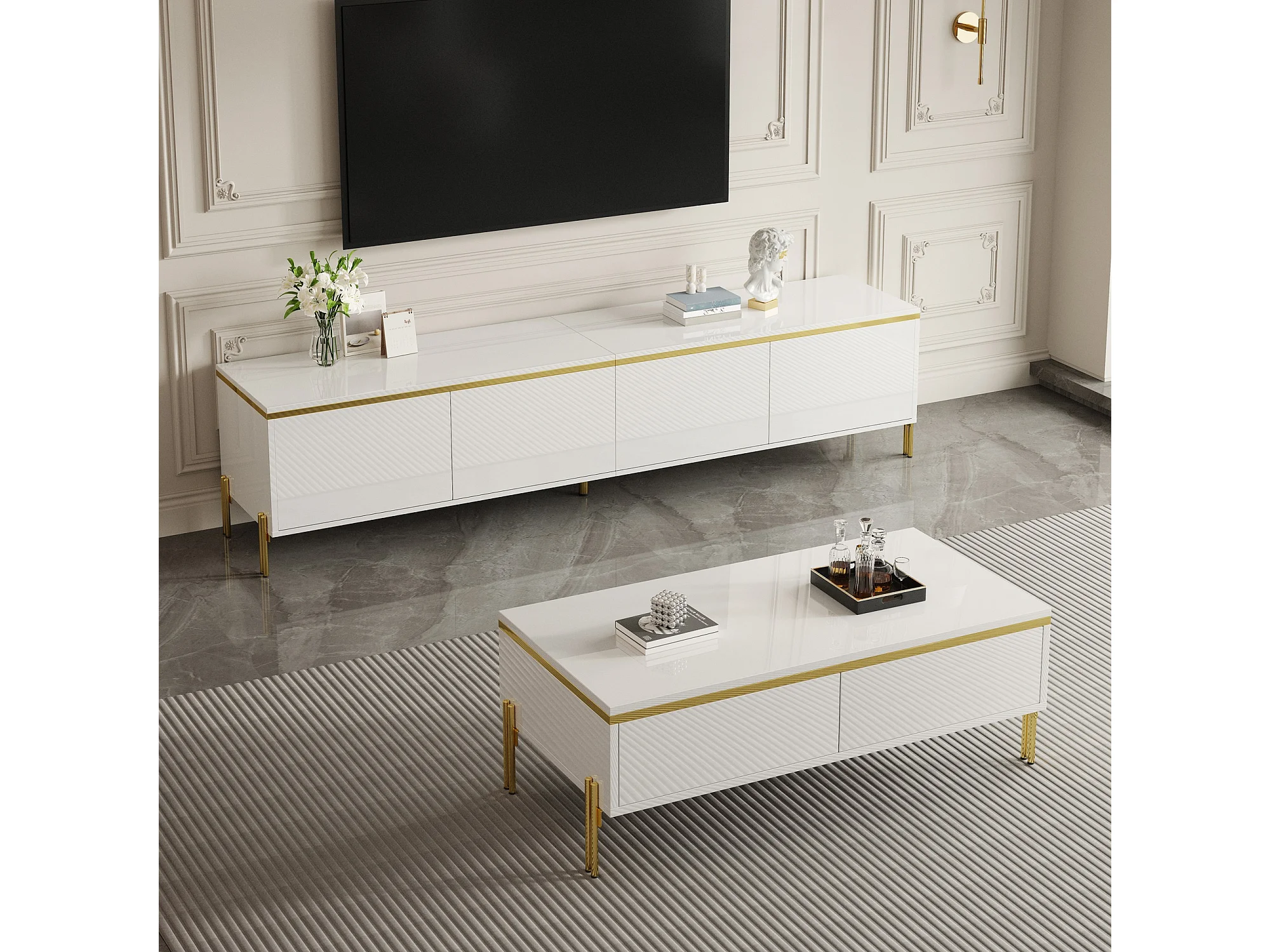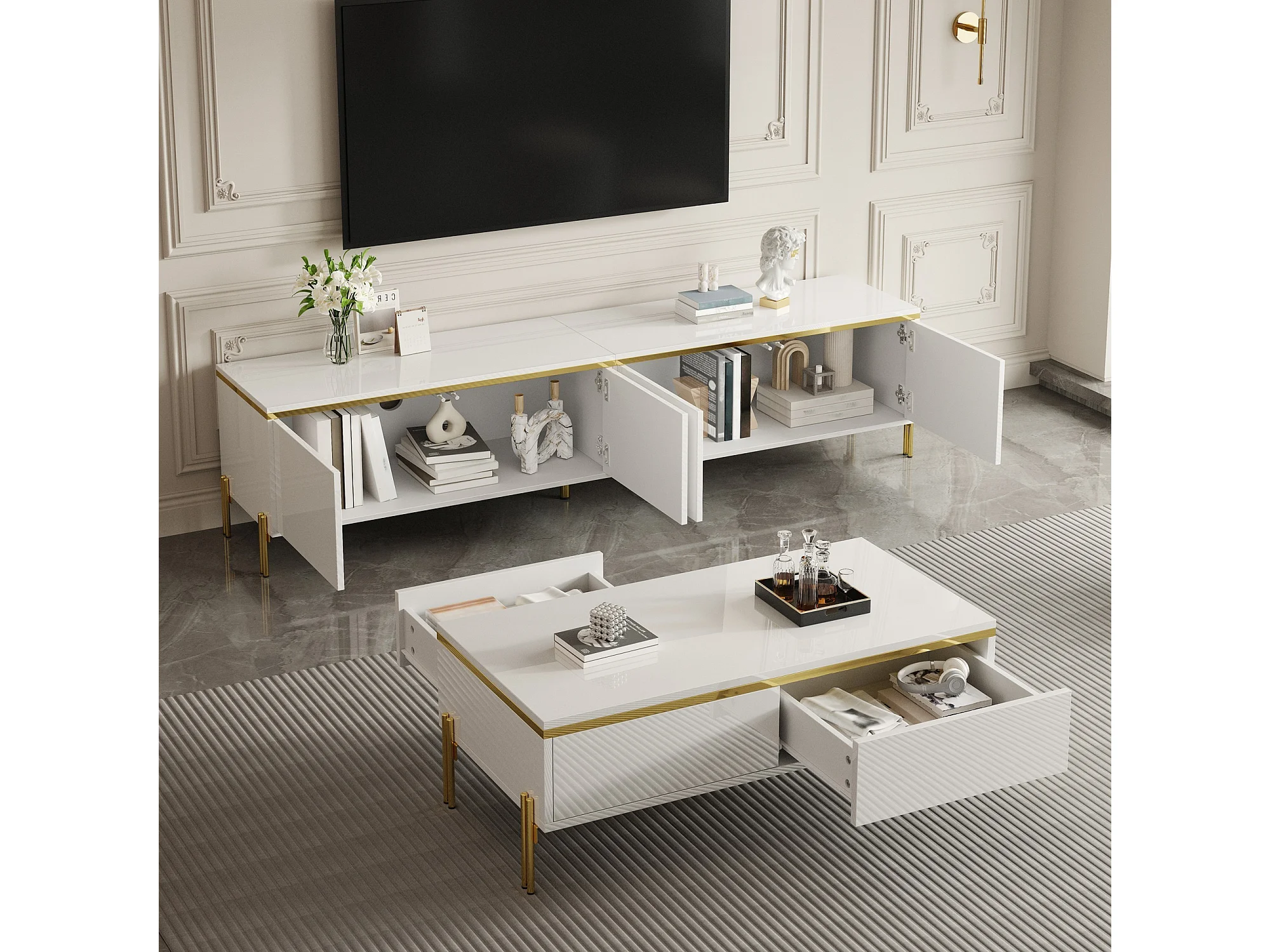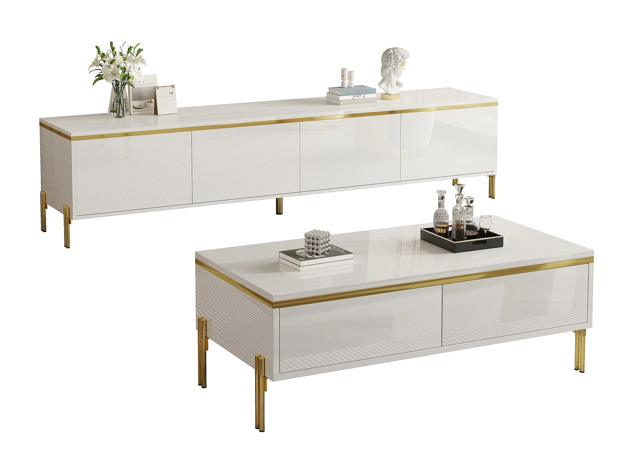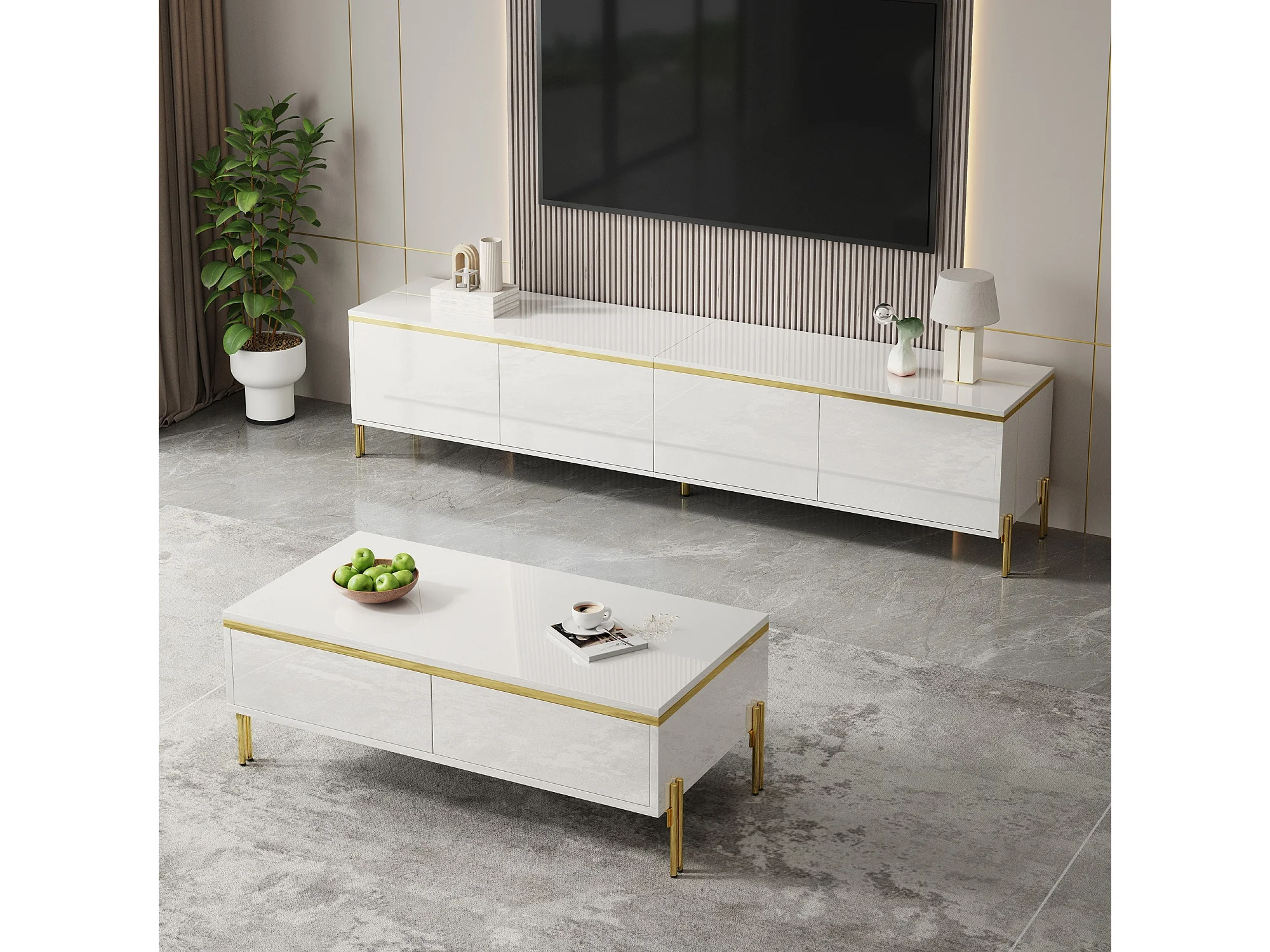 Modernes Luxus-TV-Möbel- und Couchtisch-Set – glatte, glänzende Oberfläche – mit Stauraum – Spanplatte – weiß