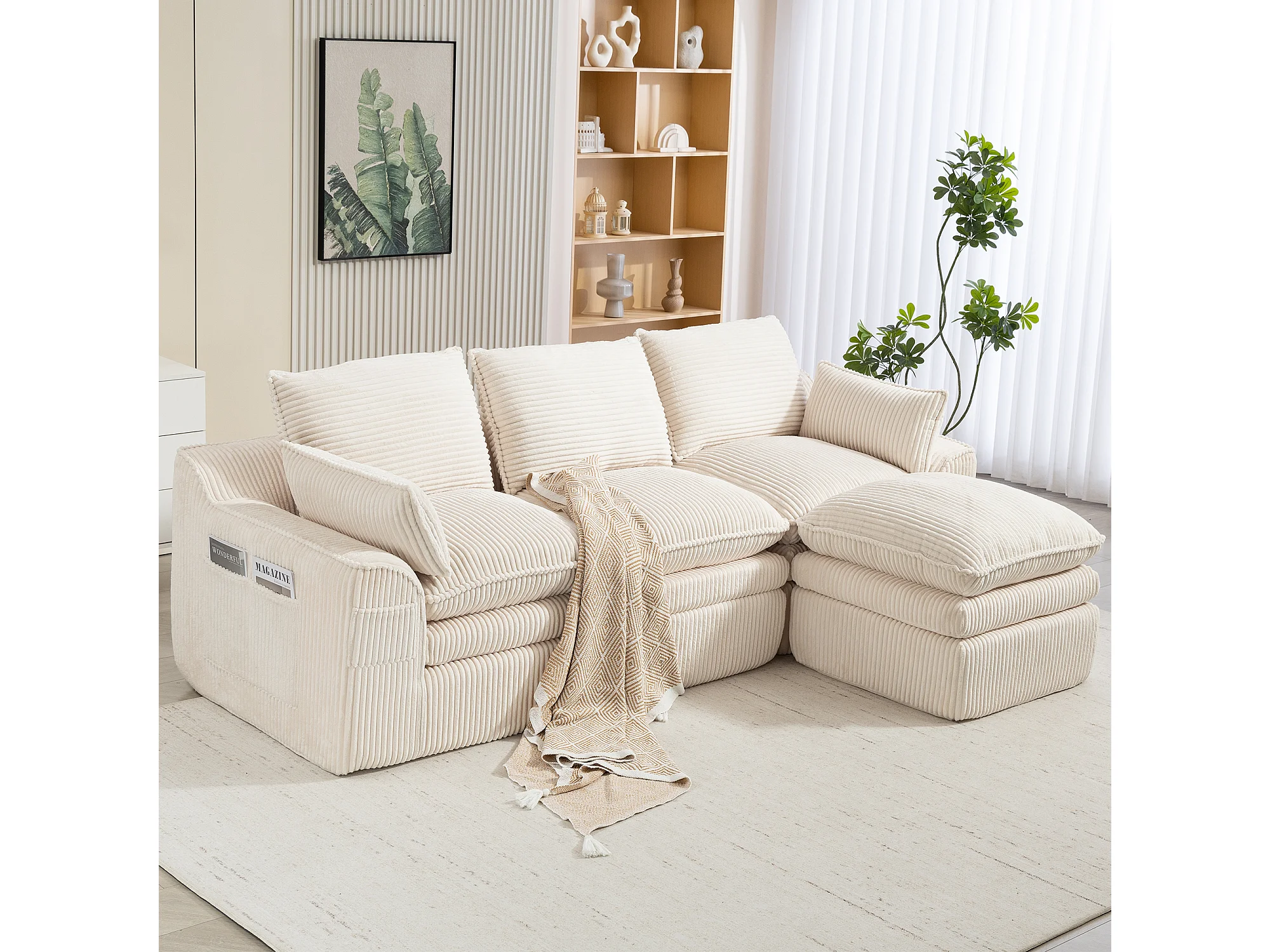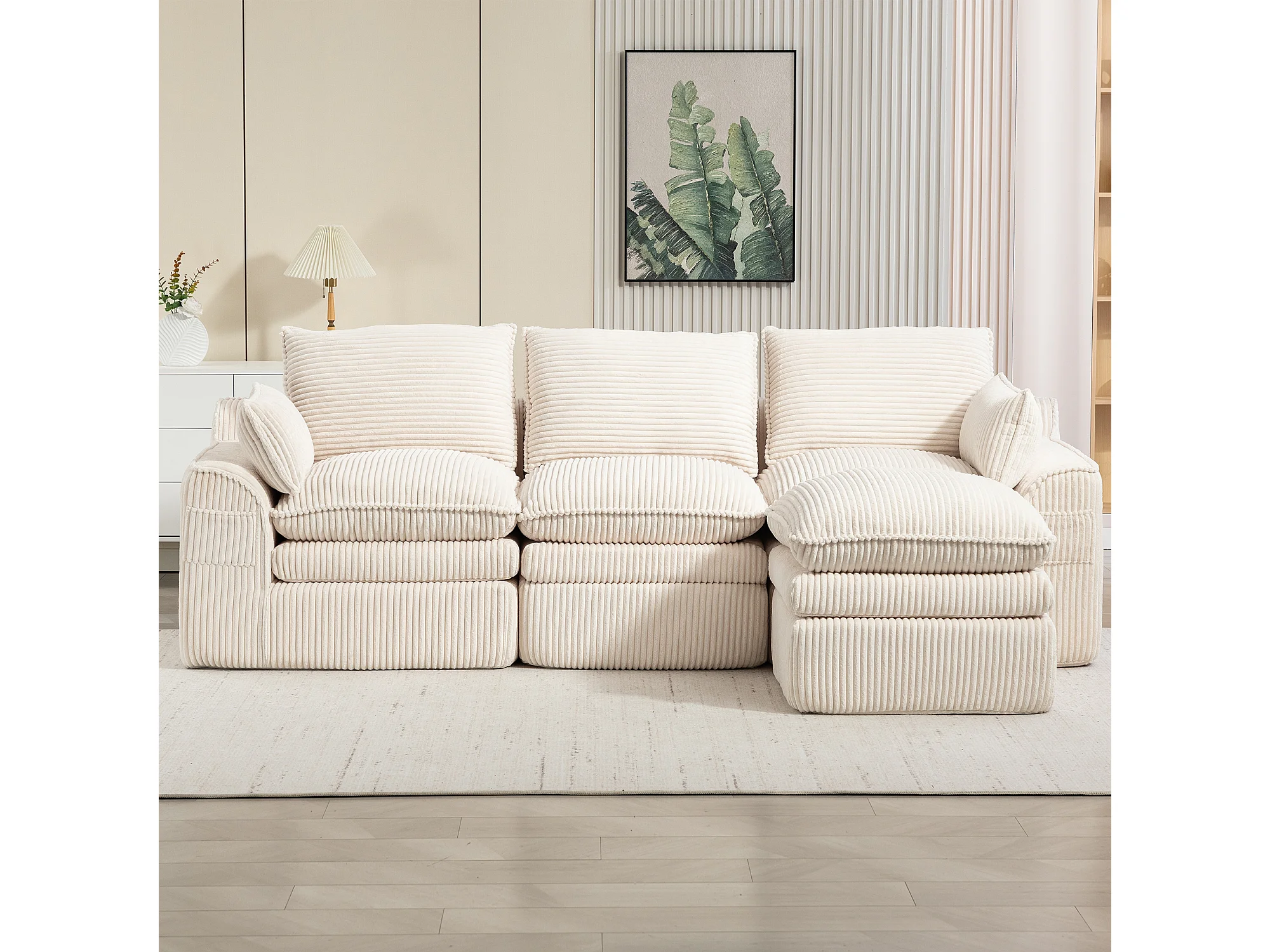 Modulares 3-Sitzer-Sofa-Set aus Cord – 263 x 167 x 85 cm – mit 1 Hocker + Kissen + 2 Taschen – beige
