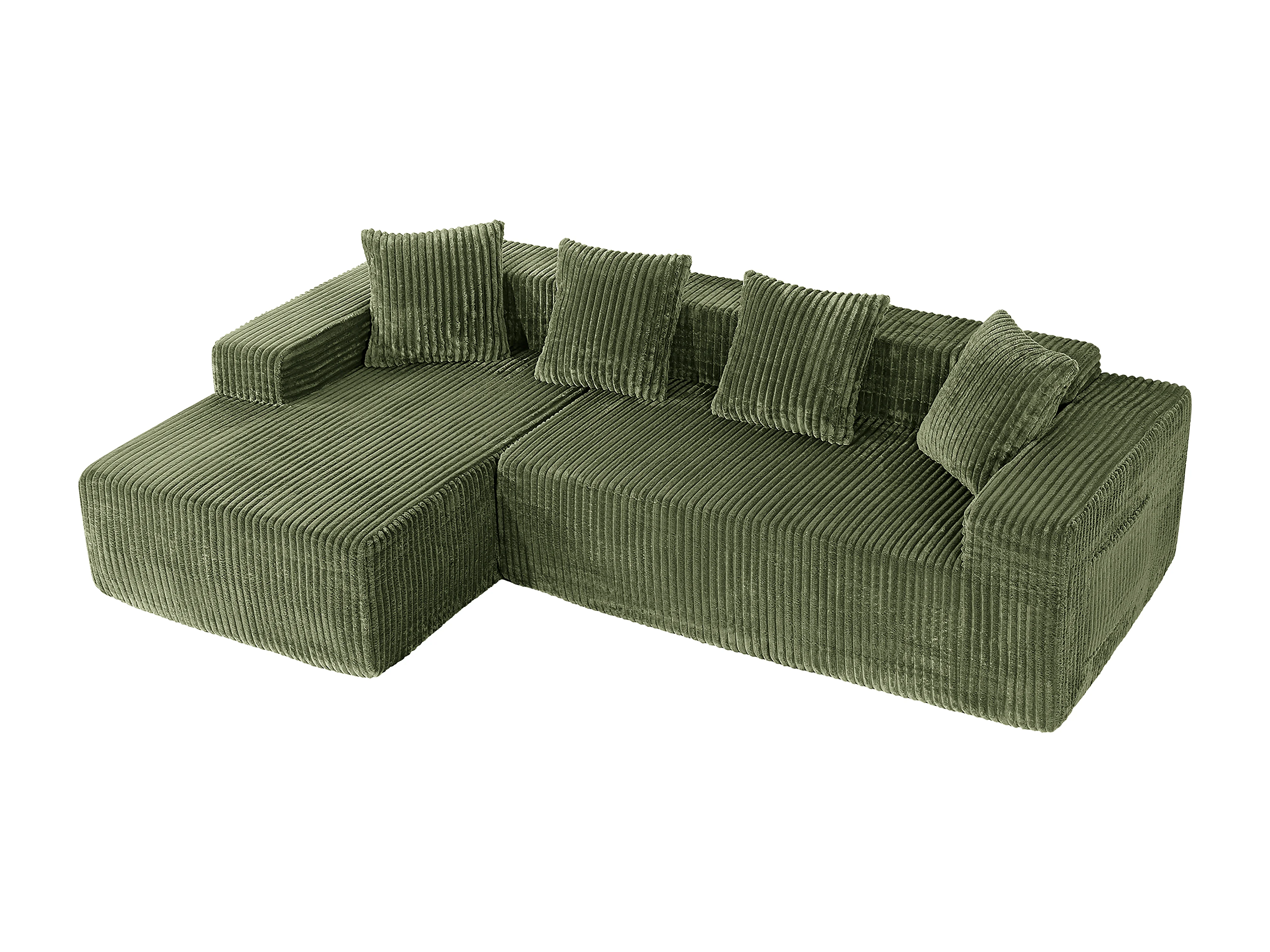 Modulares Ecksofa Links - in Rippvelours Grün - 3-sitzig - mit 4 Kissen und Liegefläche - 261x156x80cm