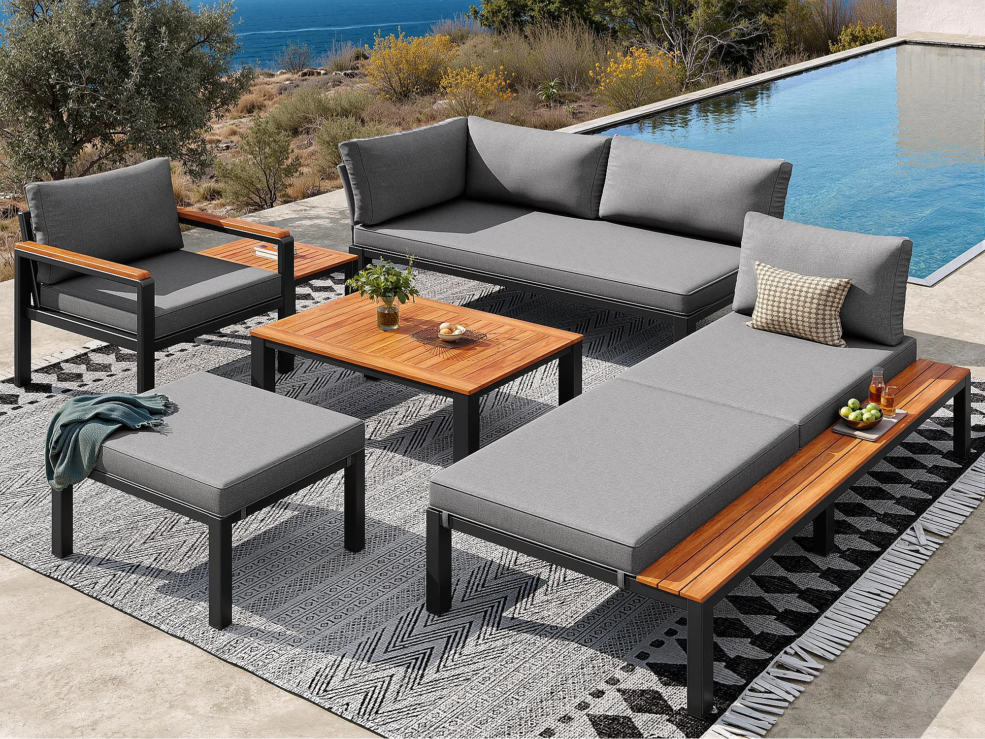 Modulares Garten-Salon-Set - für 6-7 Personen - Gestell aus verzinktem Eisen - mit Beistelltisch und Fußhocker - Grau