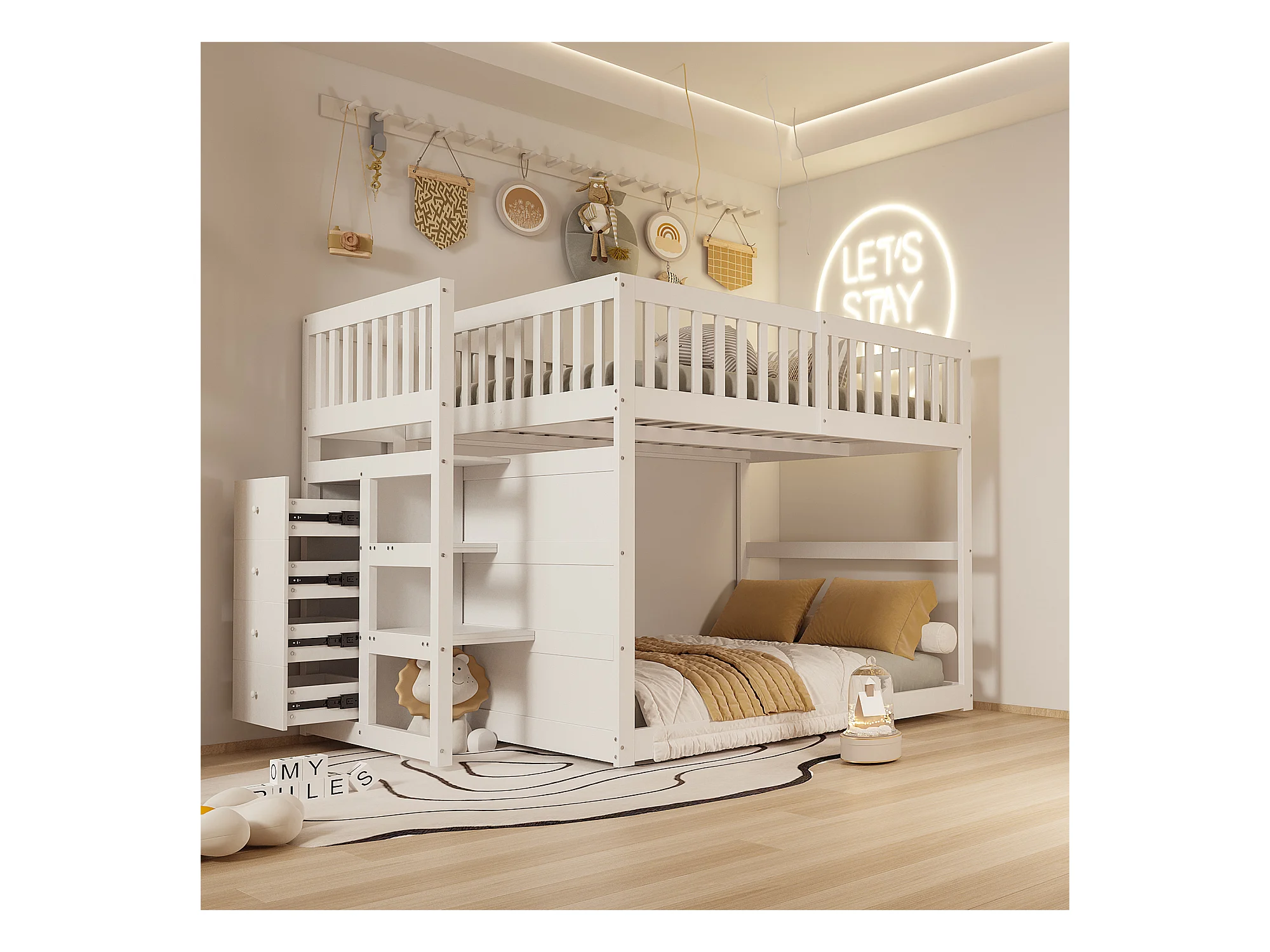 Niedriges Etagenbett140 x 200 cm, Sicherheits-Etagenbett mit Staufach, hohes Zaun-Design