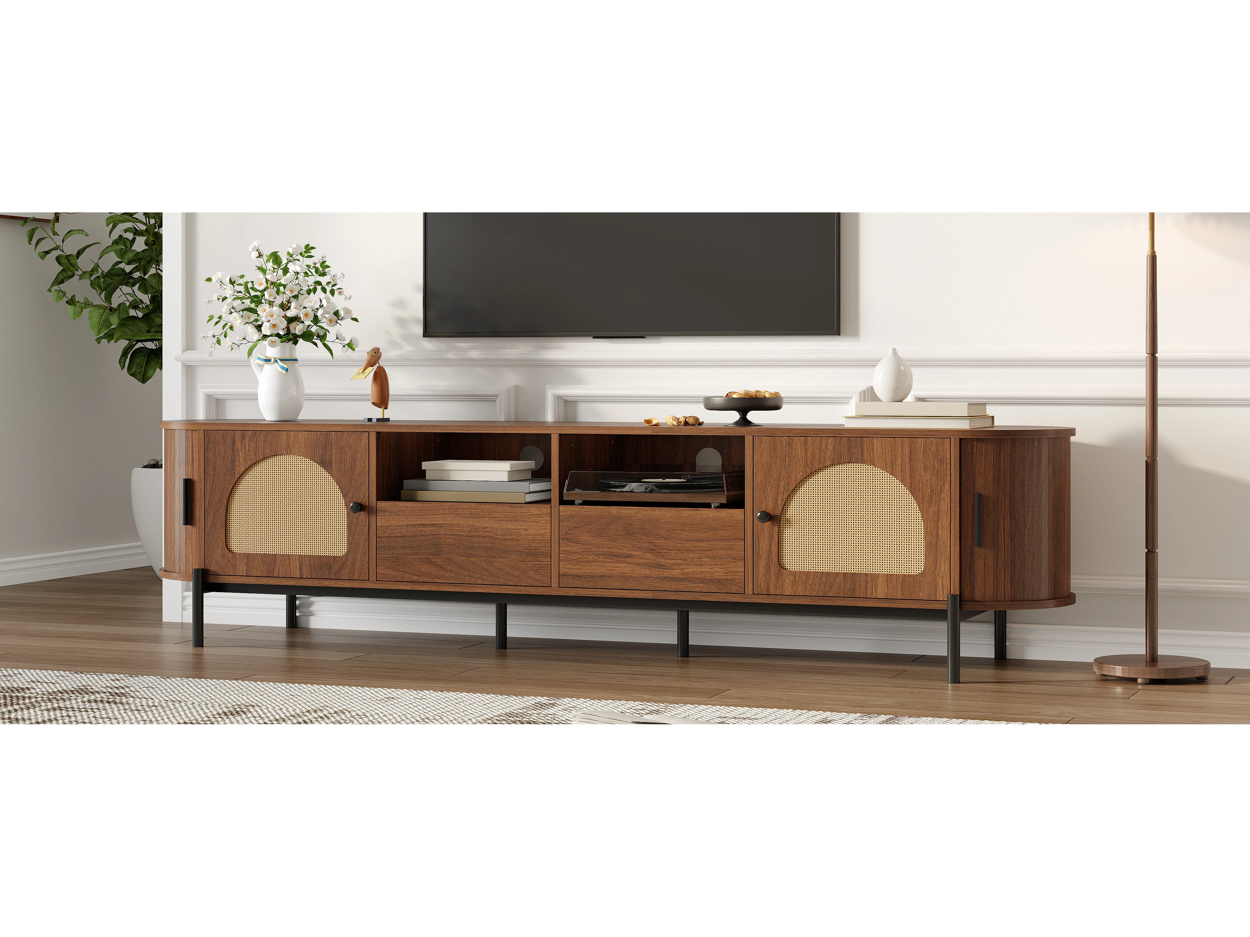 Ovaler TV-Ständer aus Rattan – 200 x 40 x 49,5 cm – mit Schiebetüren und 2 Schubladen – Metallbeine – MDF – braun