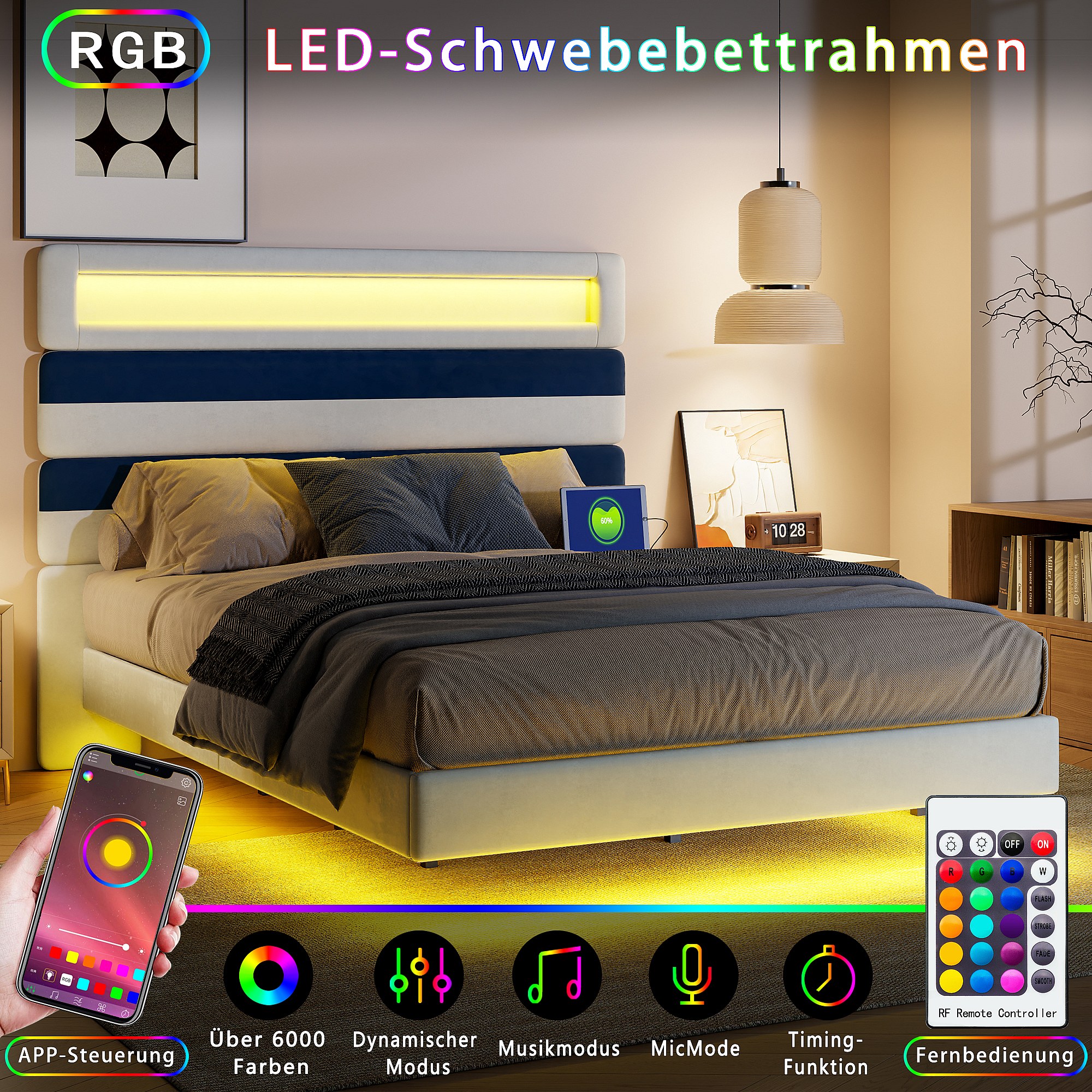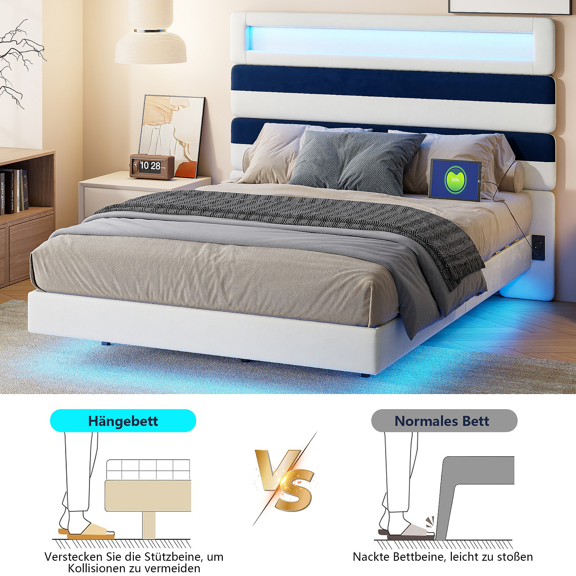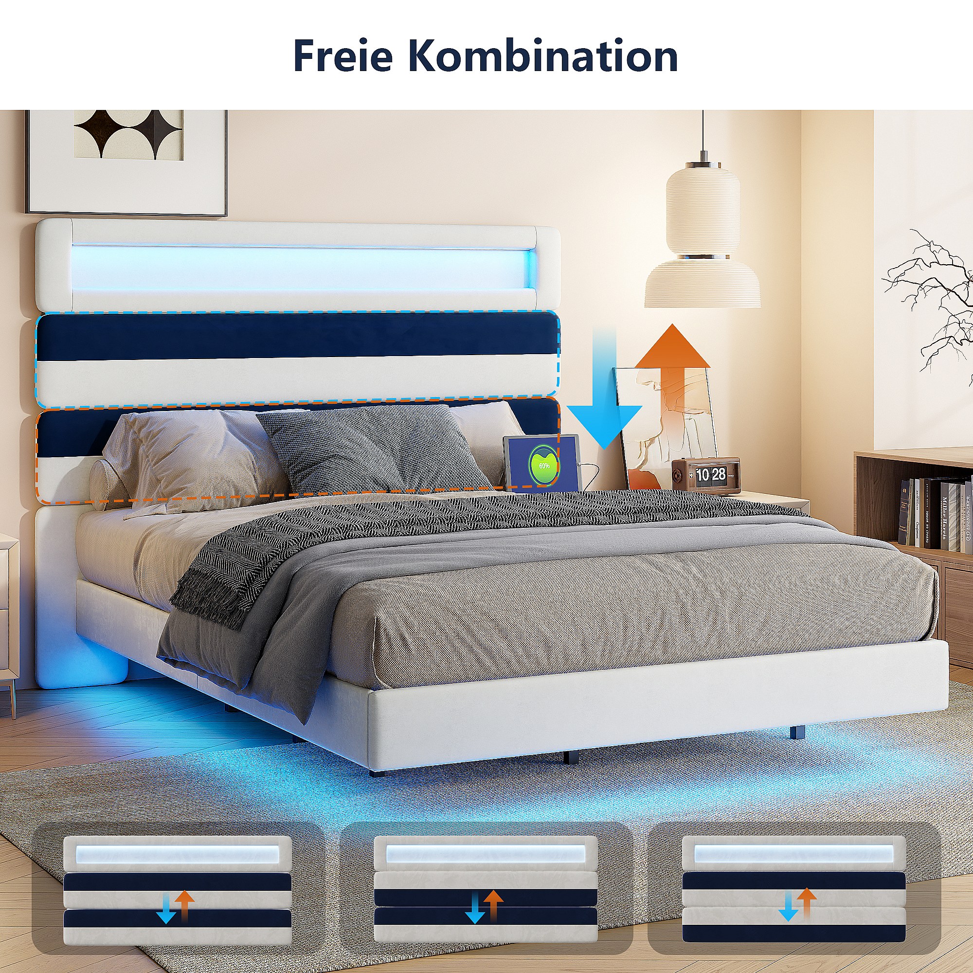 Polsterbett 140x190cm mit USB, Jugendbett, Doppelbett mit LED, Samt, Weiß und Blau