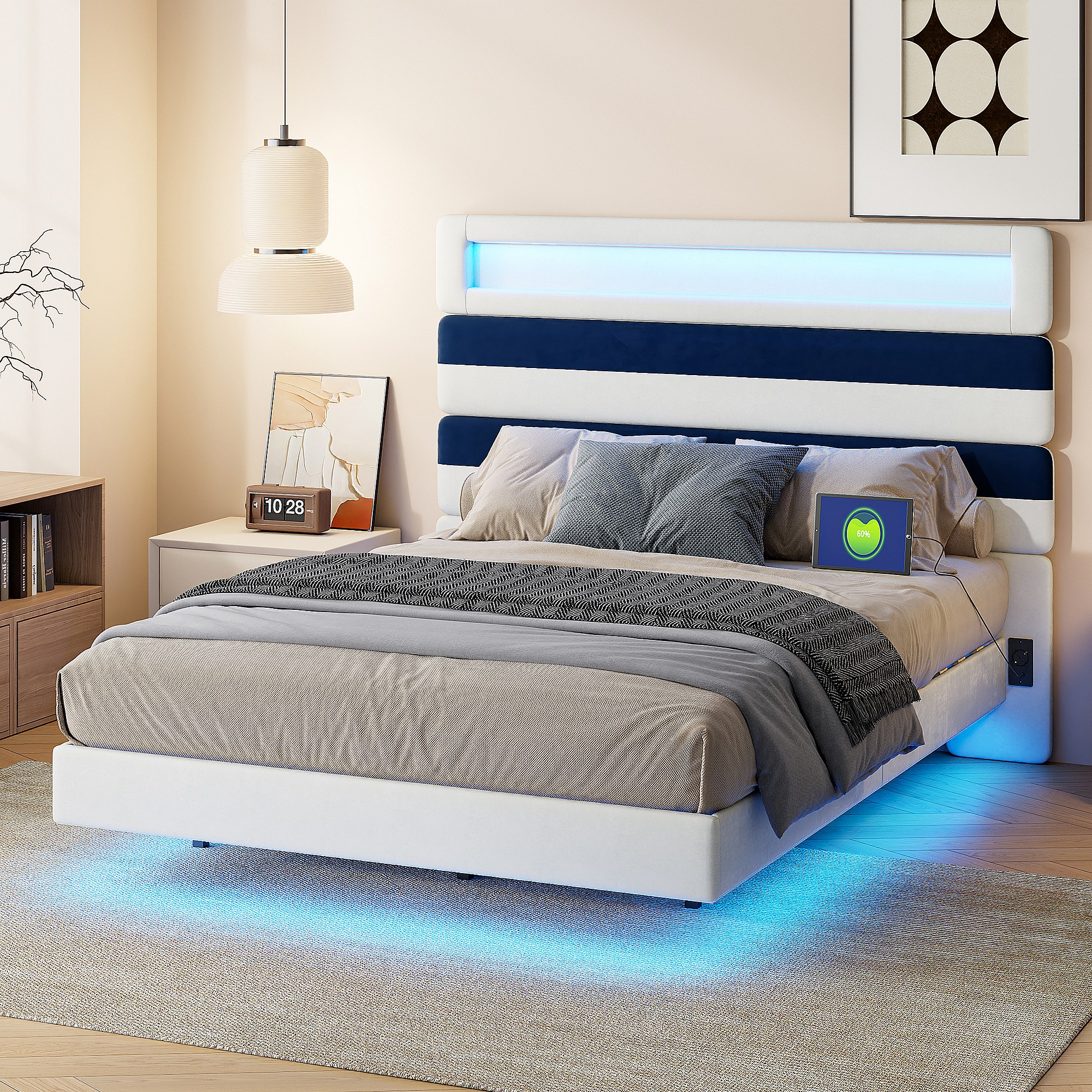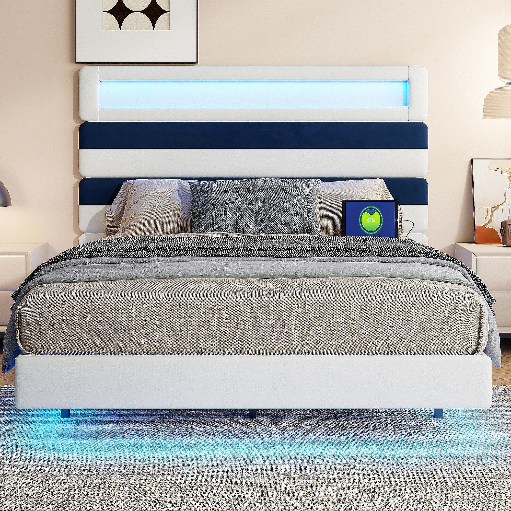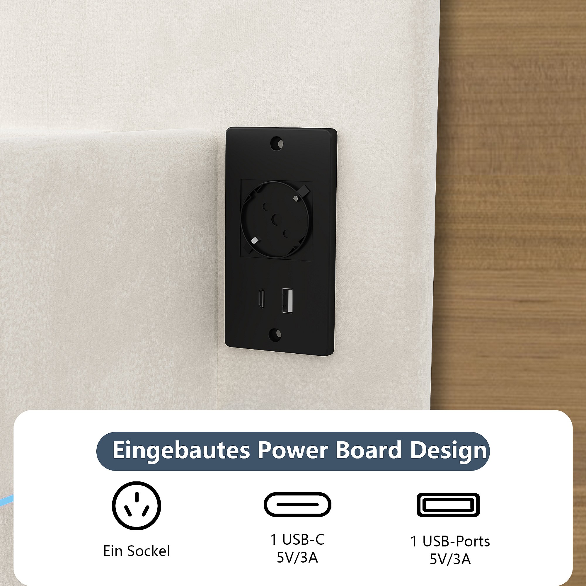 Polsterbett 140x190cm mit USB, Jugendbett, Doppelbett mit LED, Samt, Weiß und Blau