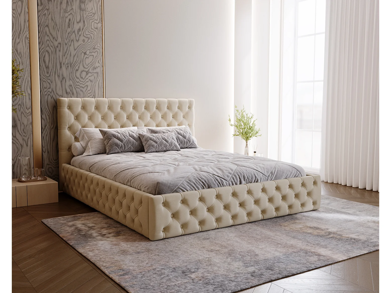Polsterbett 140x200 Verti Slim - Samtstoff, Bett mit Bettkasten, Metall-Lattenrost - Beige (Magic Velvet 2201)