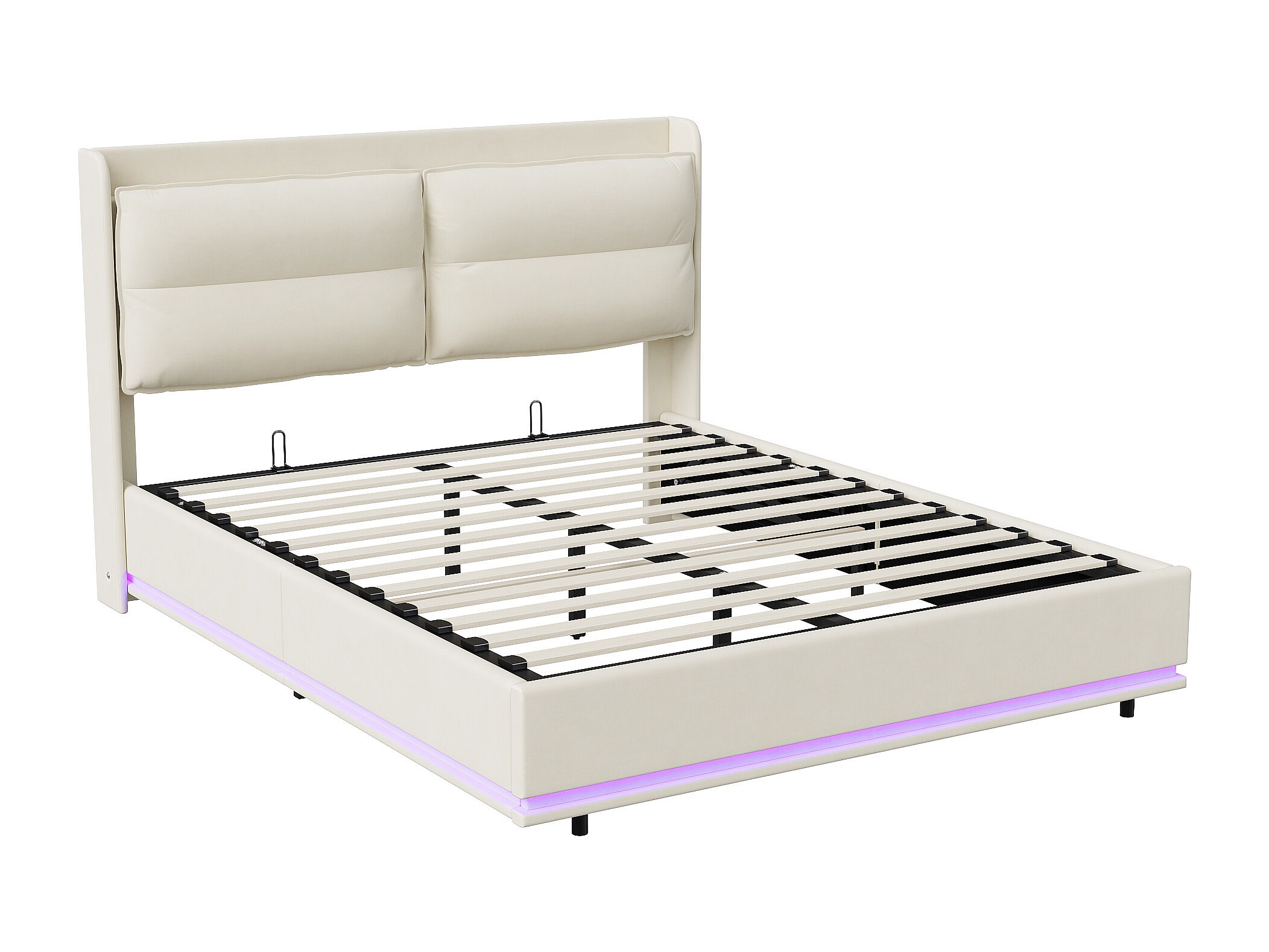 Polsterbett 160x200cm mit Wireless Charging (USB & Type-c), Doppelbett mit LED, Samt, beige
