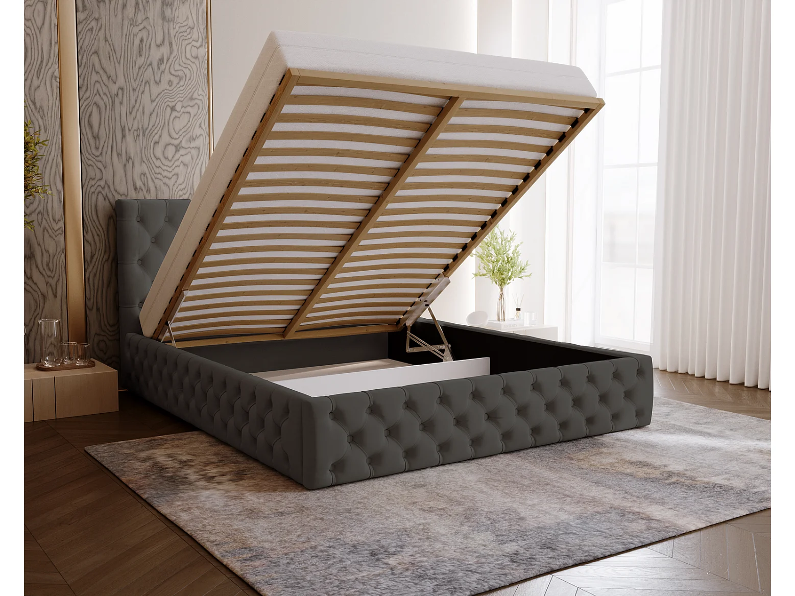 Polsterbett 200x200 Verti Slim - Samtstoff, Bett mit Bettkasten, Lattenrost - Dunkelgrau (Magic Velvet 2271)