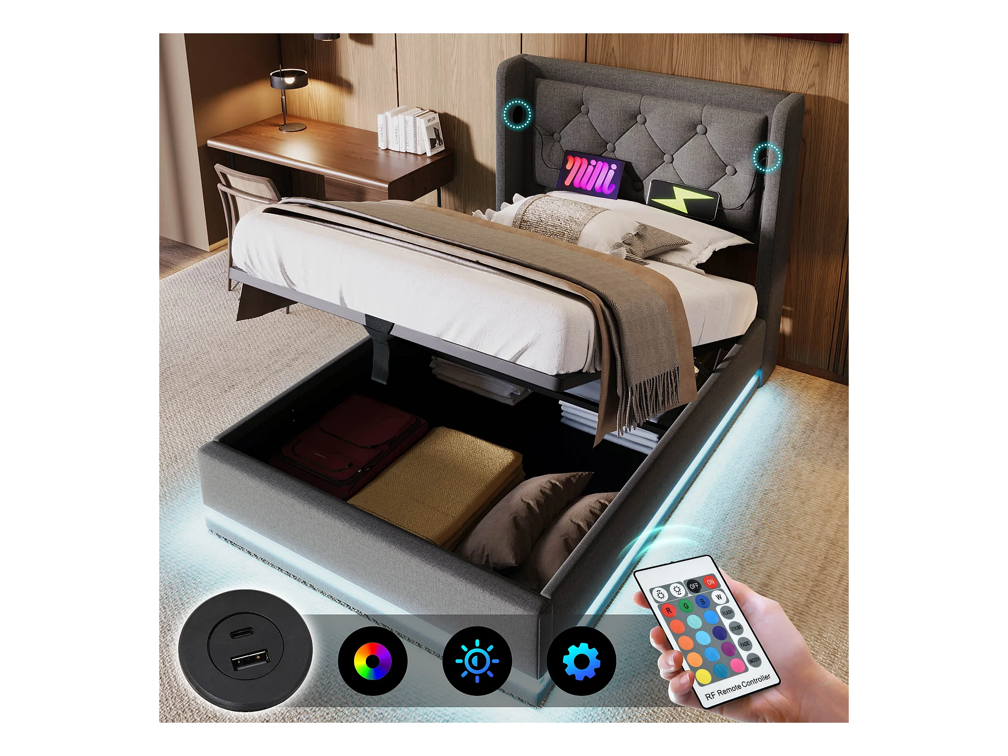 Polsterbett, 90 x 200 cm, graues Baumwollmaterial, Bett mit hydraulischem Stauraum