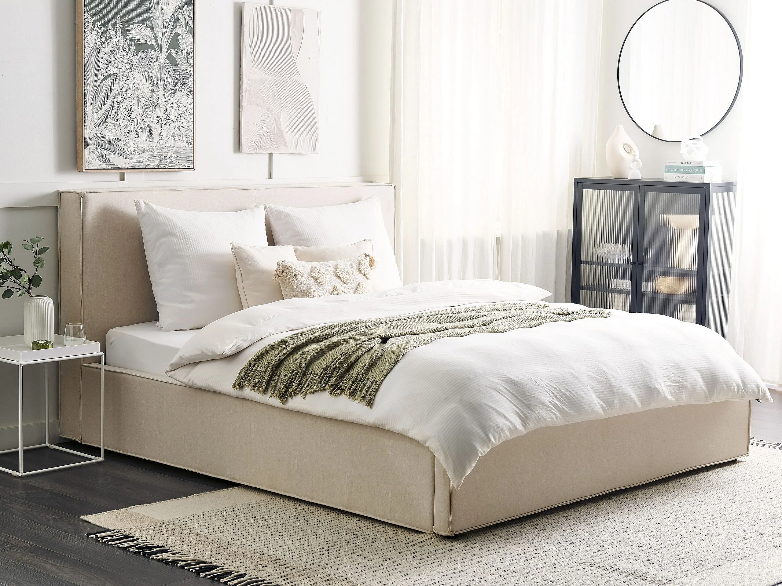 Polsterbett beige mit hohem Kopfteil Lattenrost 180 x 200 cm Bettkasten Moissac