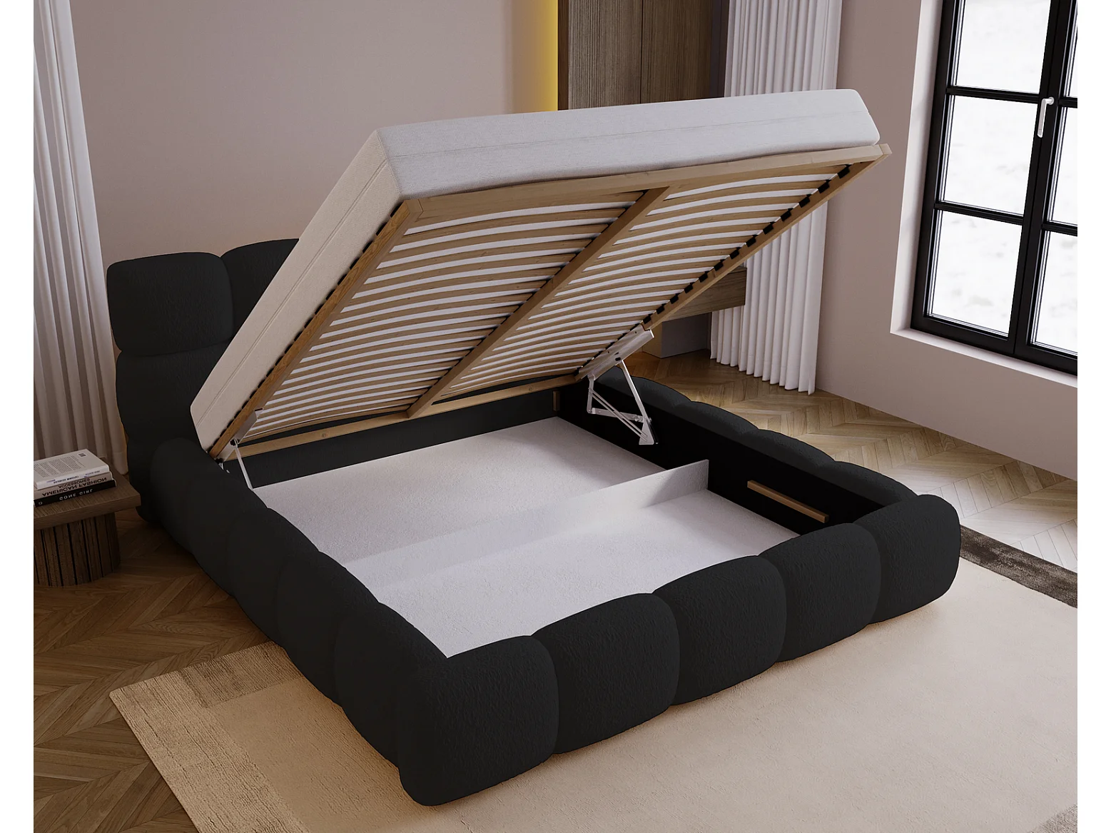 Polsterbett mit Bettkasten 200x200 Lucca - Stoff Bouclé, Lattenrost, Schwarz (Lambi 13)