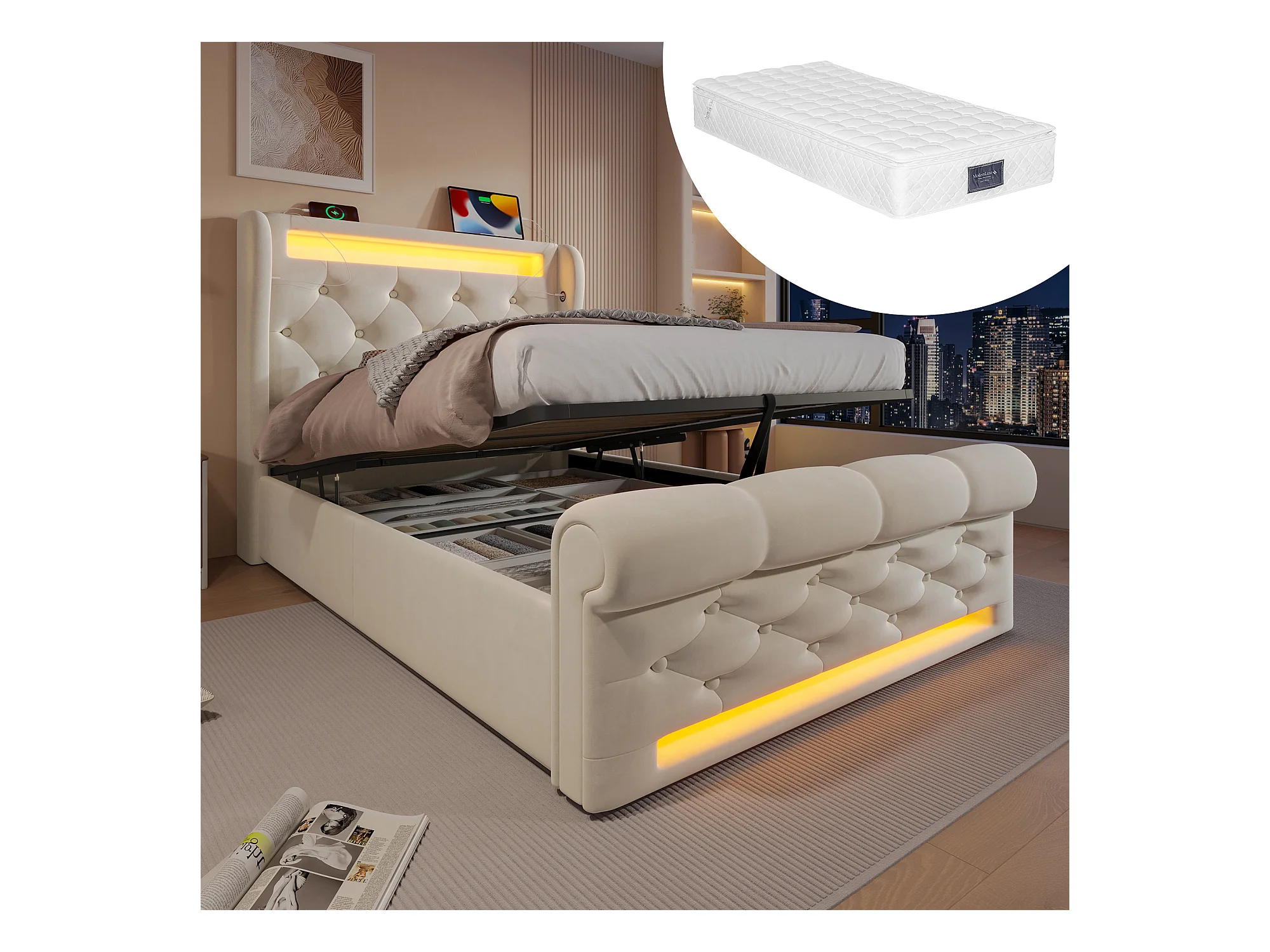Polsterbett mit Stauraum - 90 x 200 cm - mit LEDs - Kopfteil mit Stauraum und USB - mit Matratze - Samt - Beige