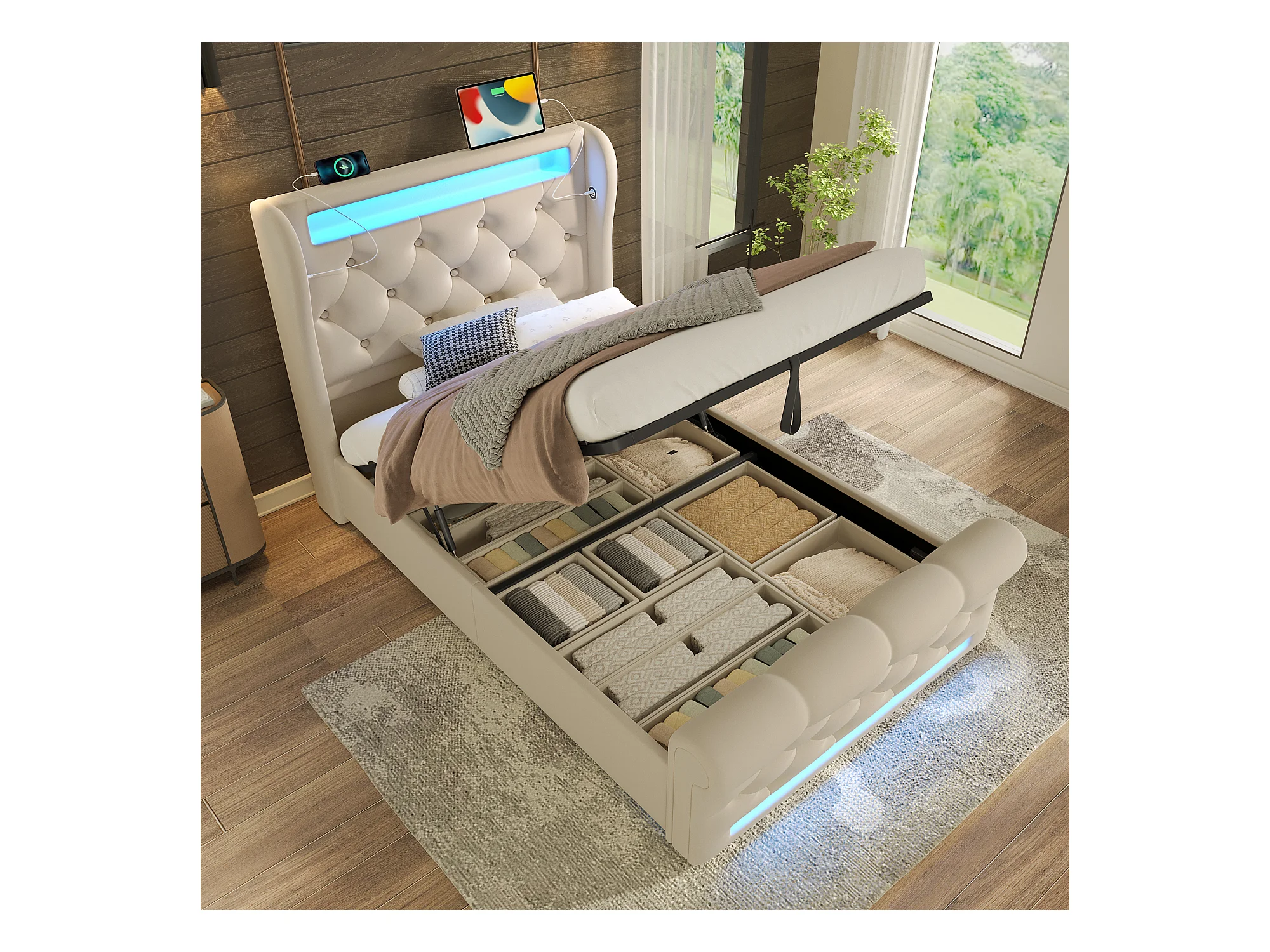 Gepolstertes Bett mit Stauraum - 90 x 200 cm - verstellbares Kopfteil - mit USB + LEDs - hydraulischer Stauraum - Samt - Beige