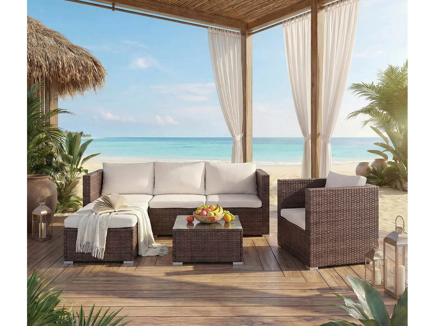 Poly-Rattan-Garnitur Busto, Braun, Kissen creme