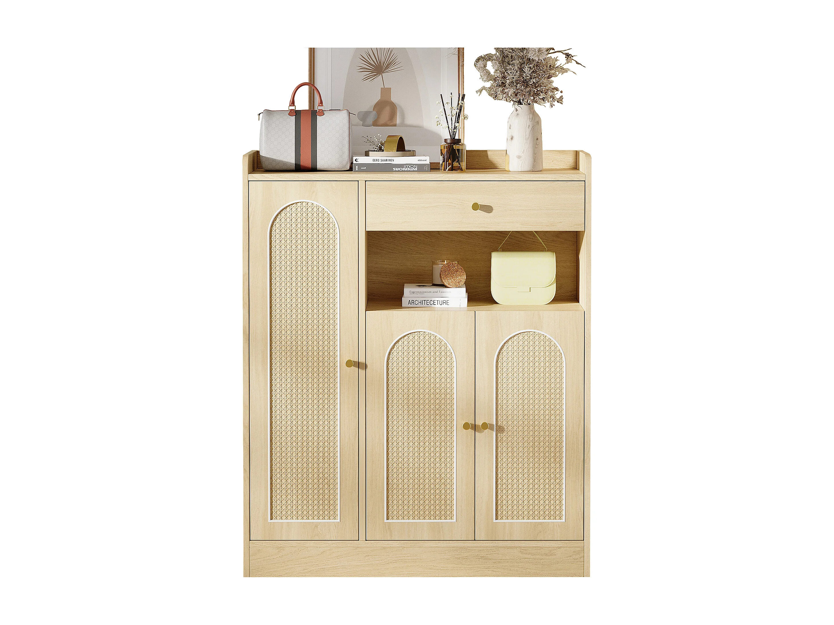 Rattan-Schuhschrank für den Eingangsbereich – 90 x 35 x 110 cm – mit 1 Schublade, 3 Türen und Einlegeböden – MDF und Spanplatte – natur