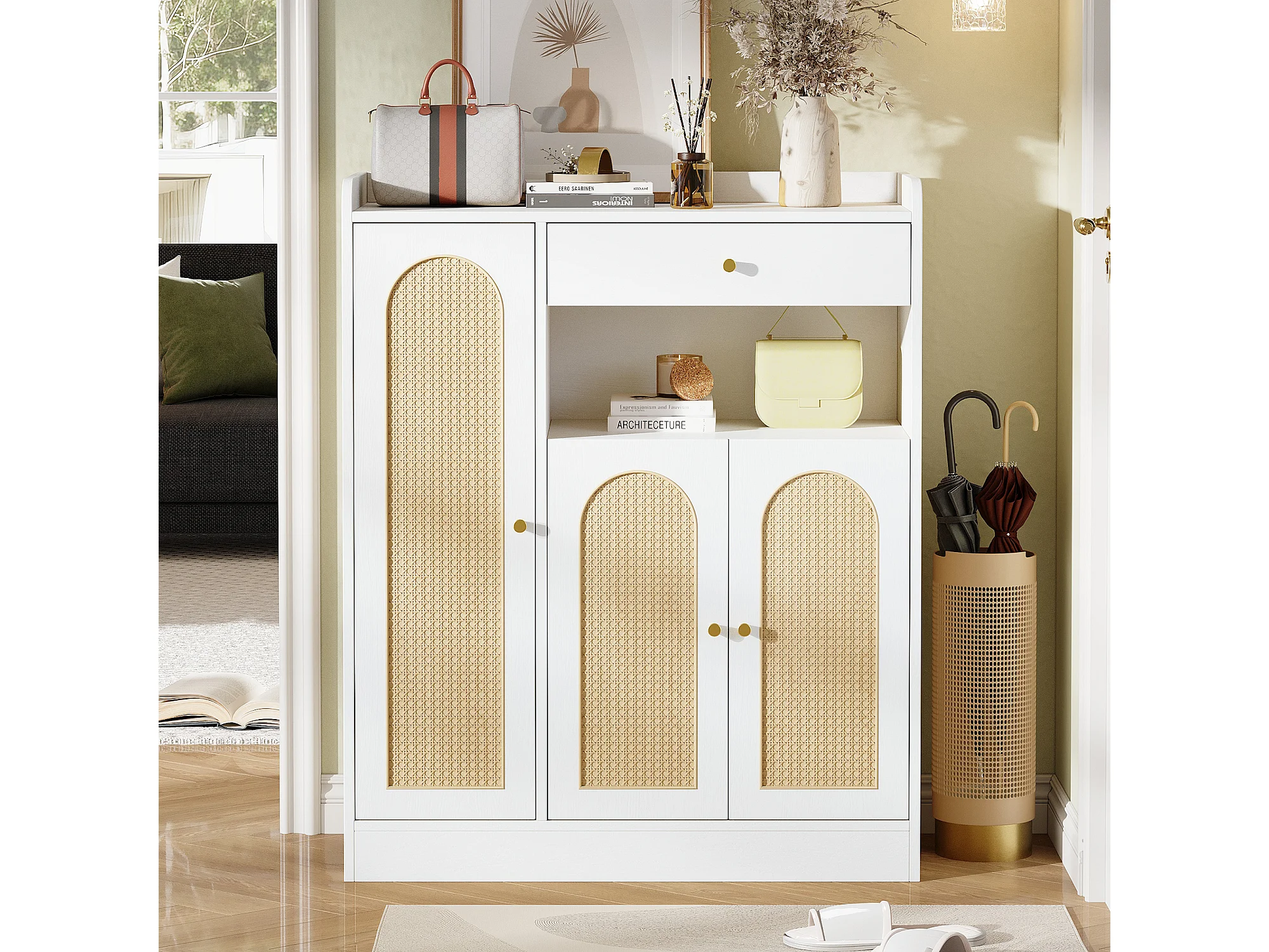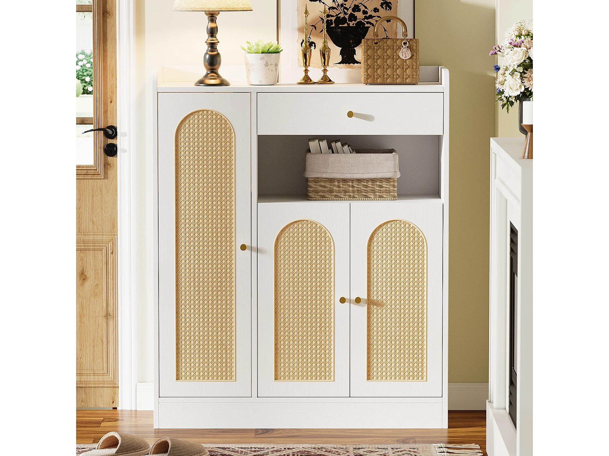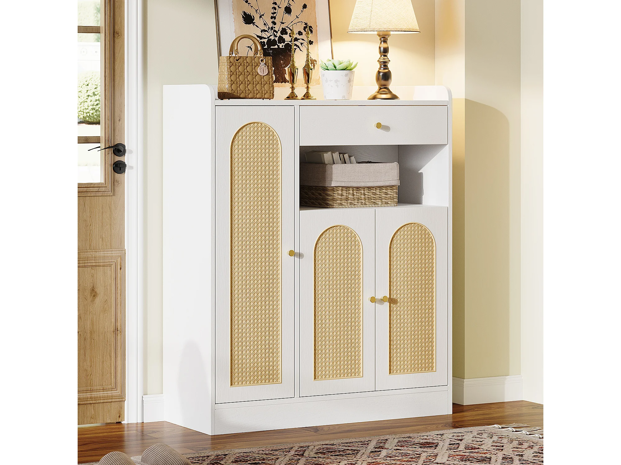 Rattan-Schuhschrank für den Eingangsbereich – 90 x 35 x 110 cm – mit 1 Schublade, 3 Türen und Einlegeböden – MDF und Spanplatte – natur