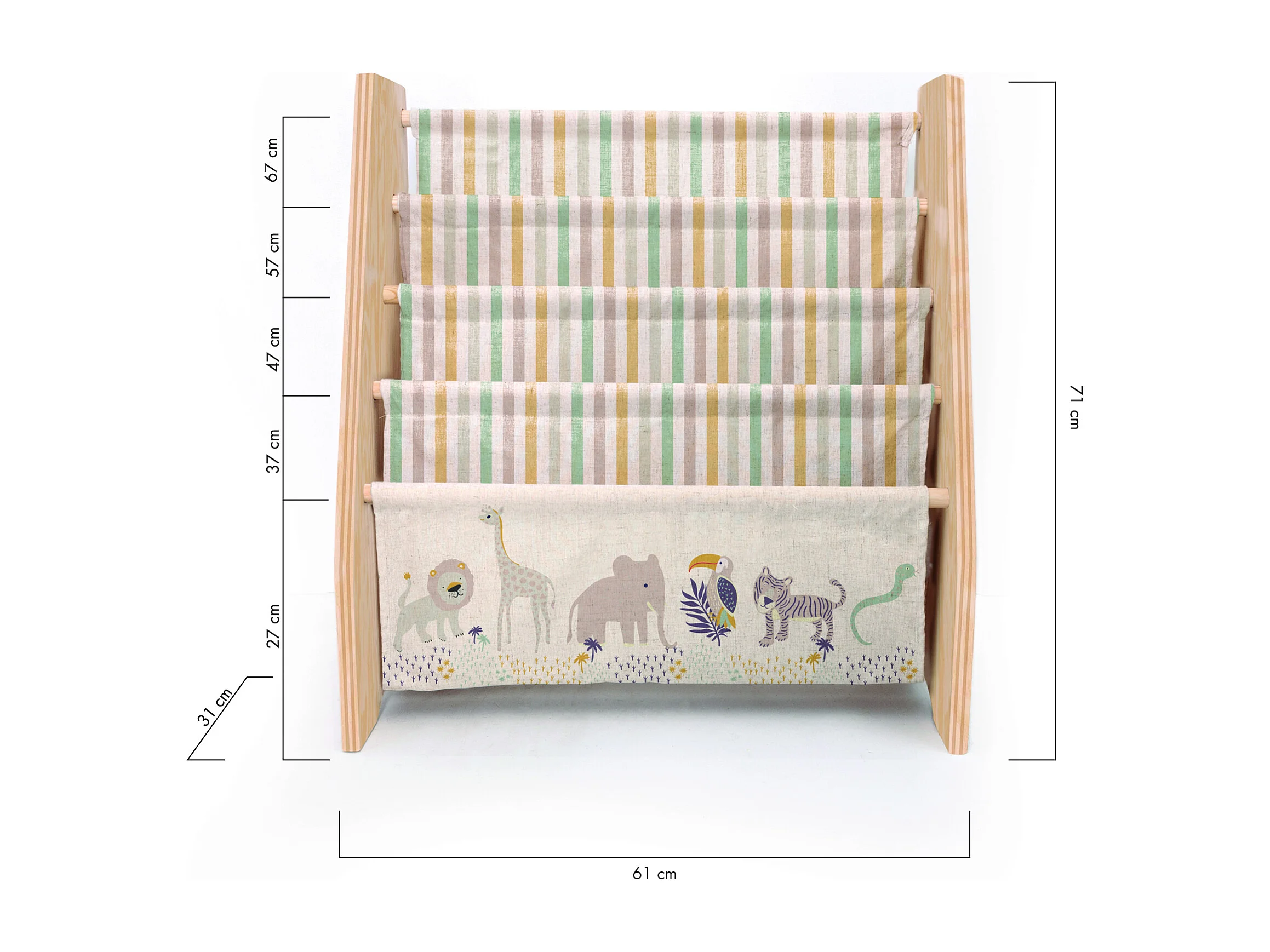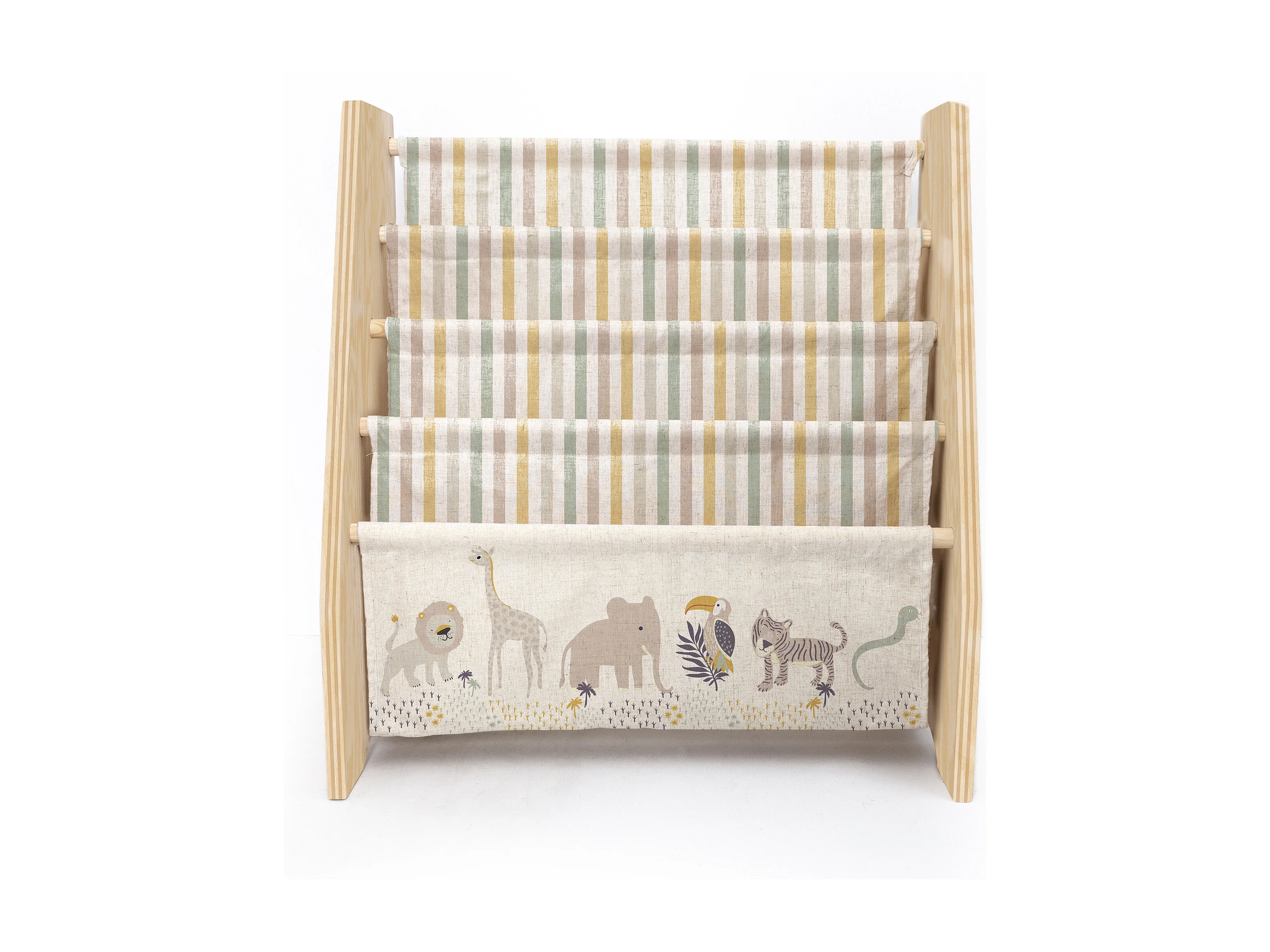 Regal Kiefer-Sperrholz, afrikanisches Textil, Montessori-Stil.