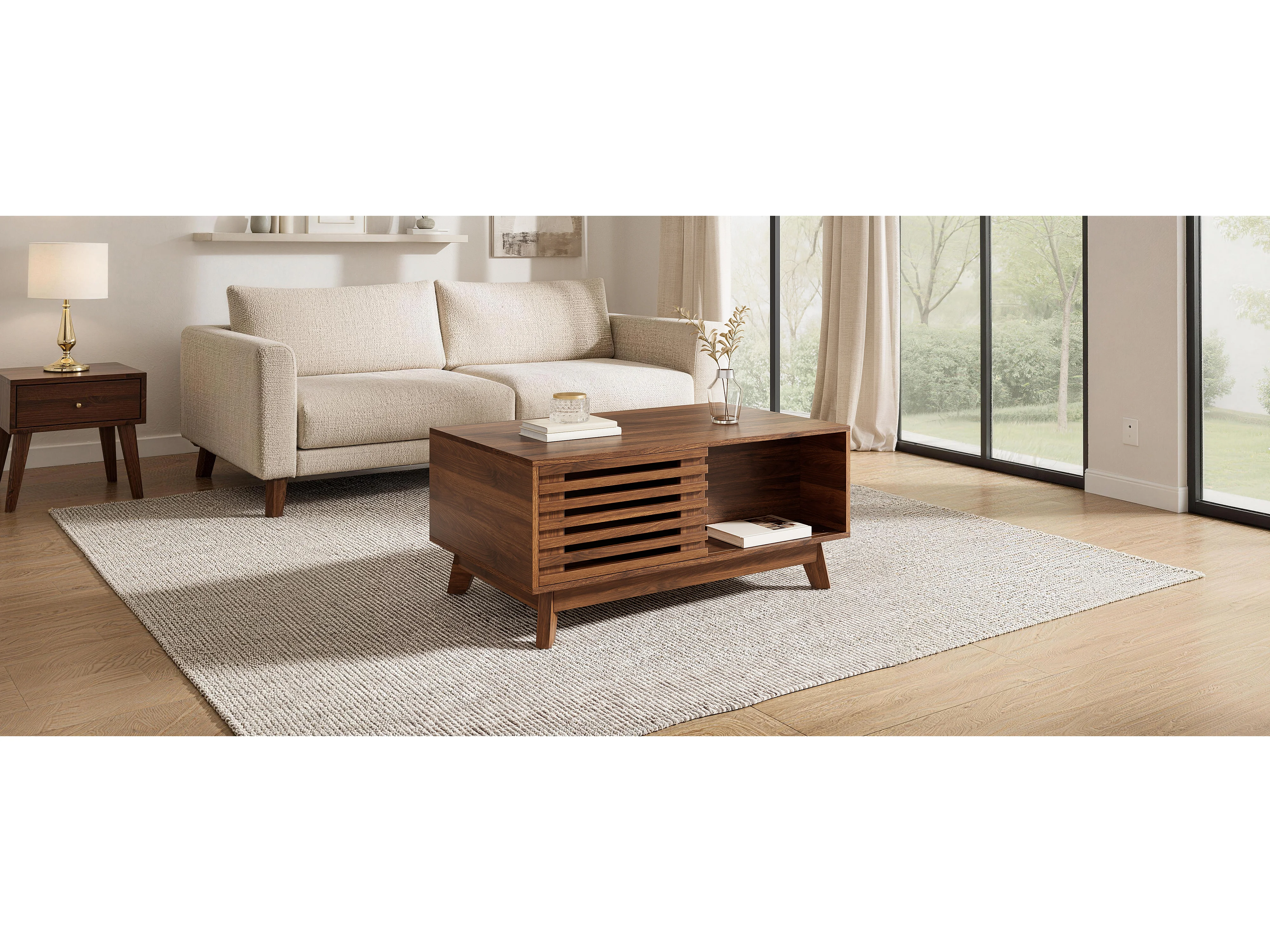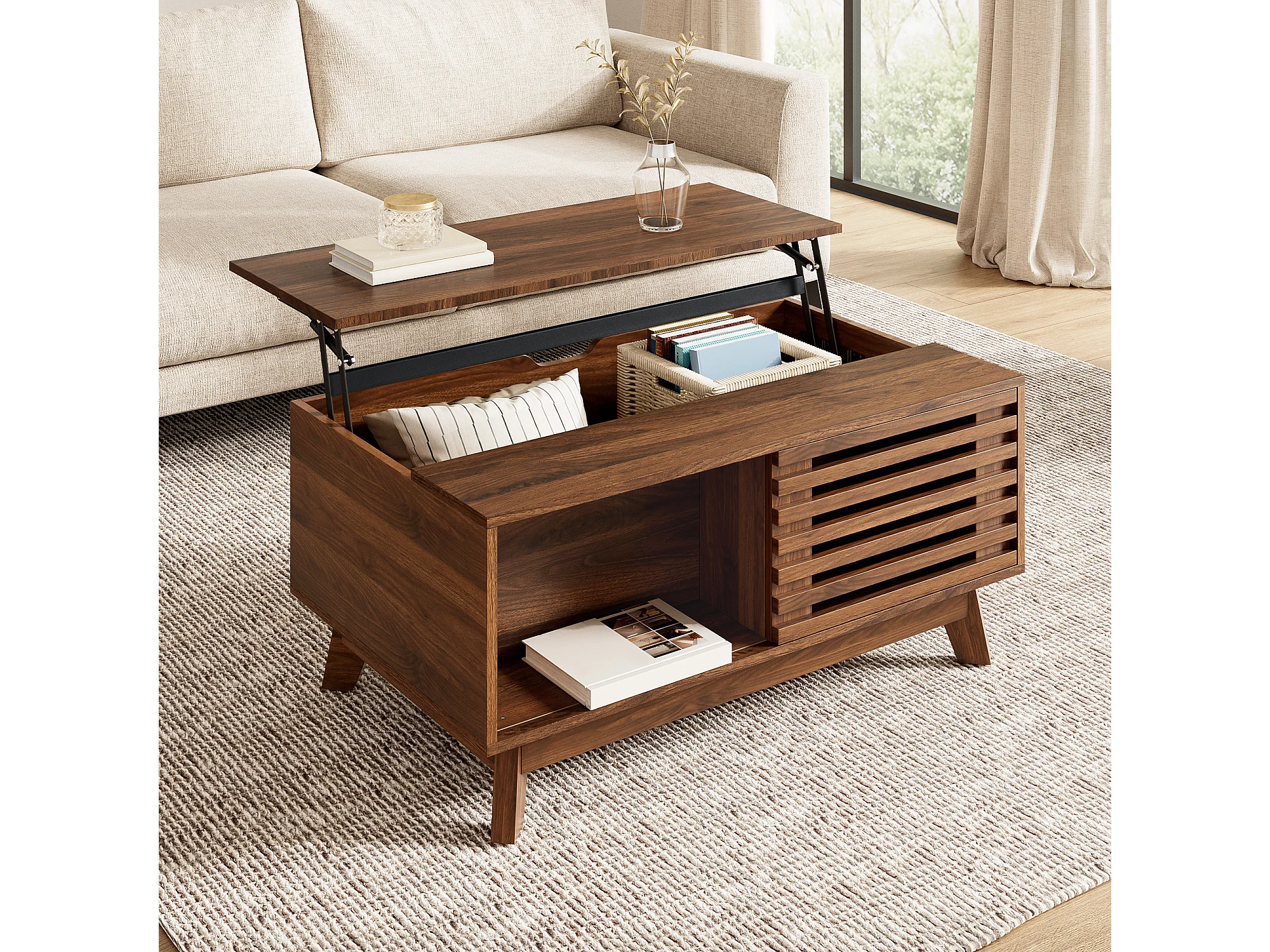 Retro-moderner Couchtisch mit Hubmechanismus – 90 x 50 x 57,5 cm – mit Schiebetür und Ablage – Walnuss-Finish – MDF – braun