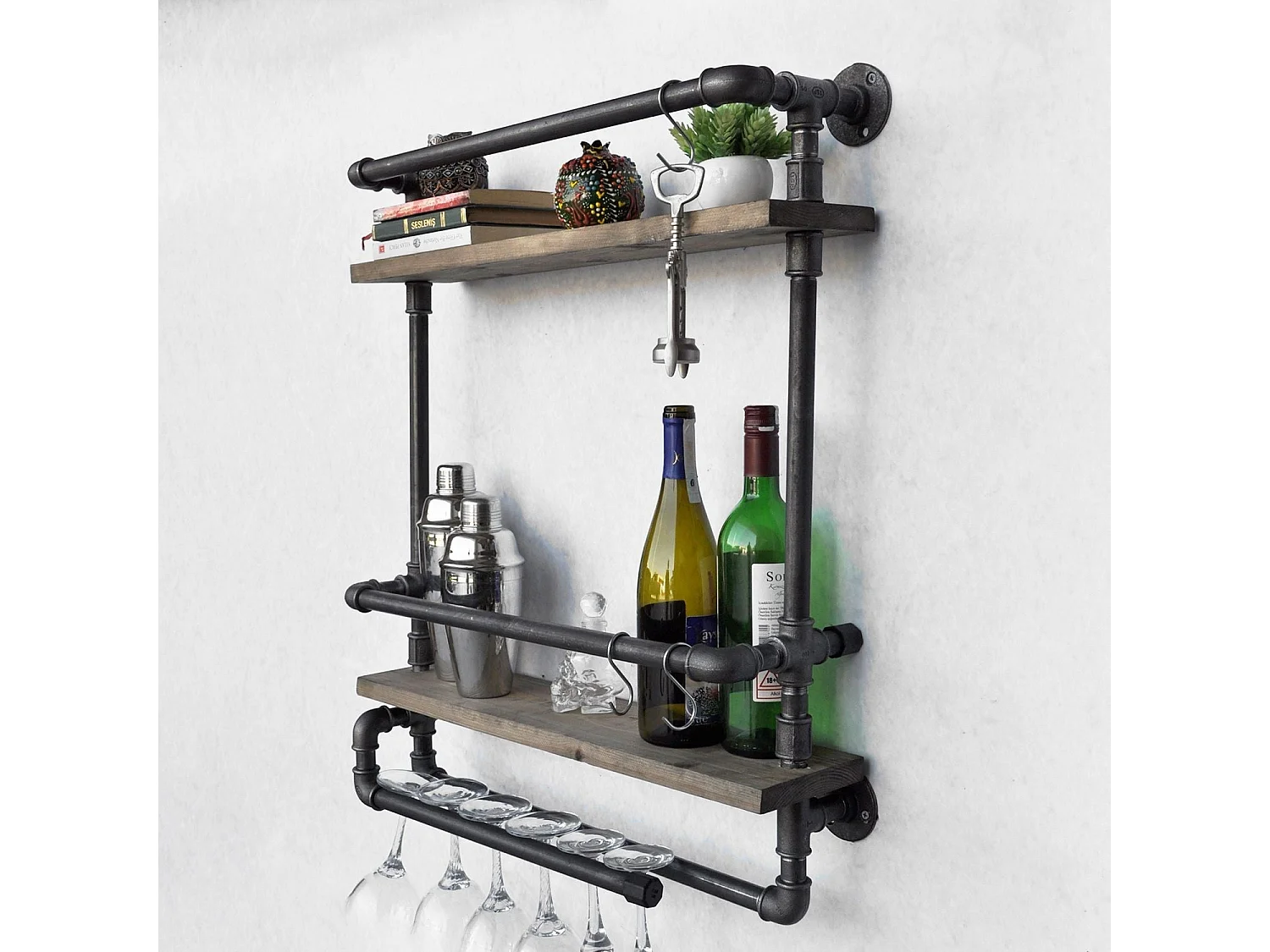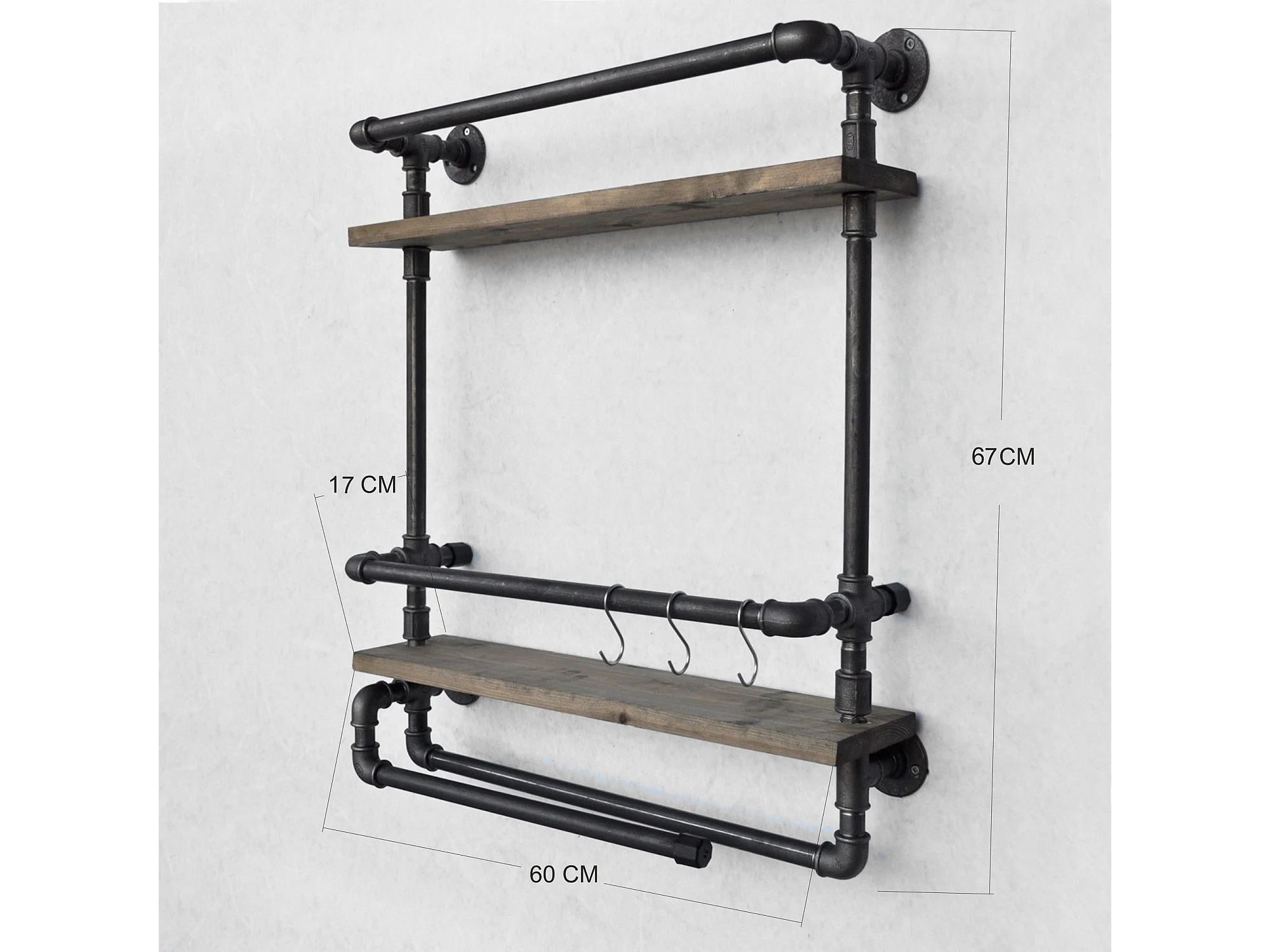 Rohrregal – 60 cm x 20 cm x 14 cm – Schwarz und Walnuss – Tannenholz und Metall
