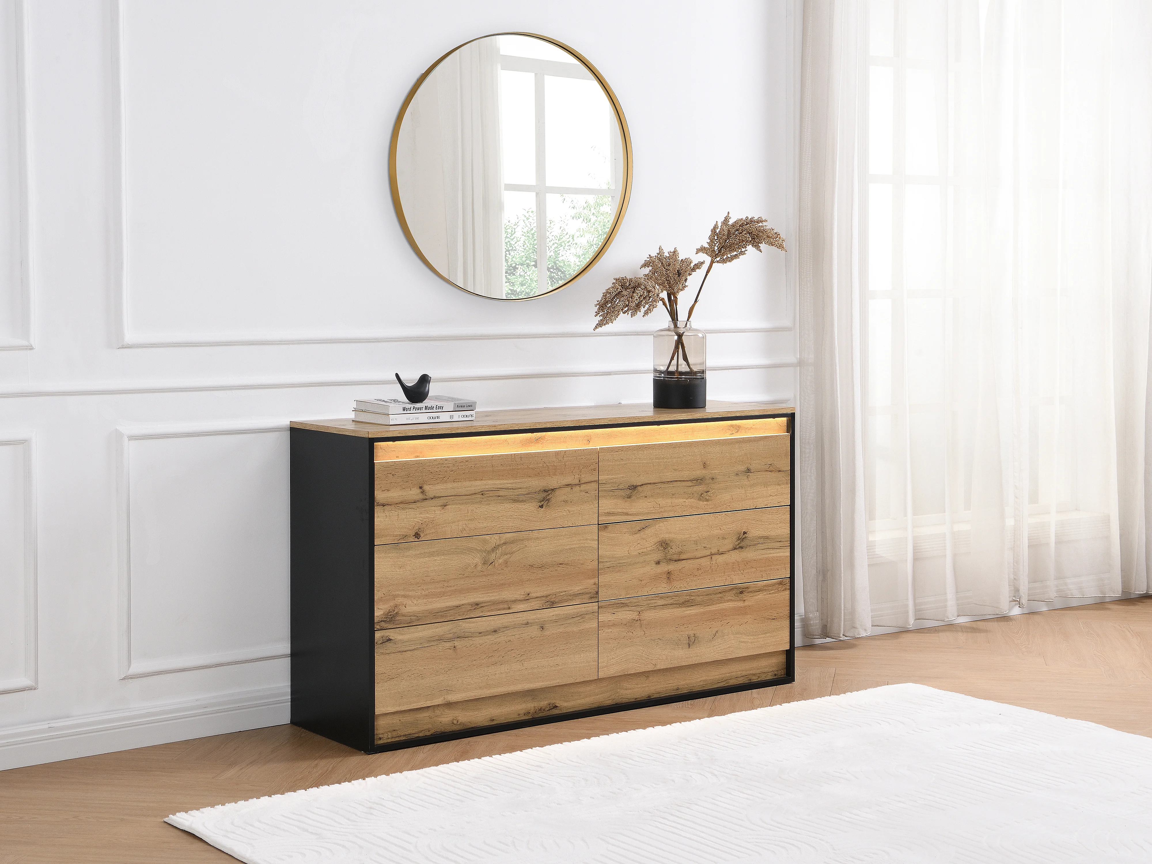 Kommode mit 6 Schubladen - Mit LED-Beleuchtung - MDF - Holzfarben & Schwarz - RUKALO