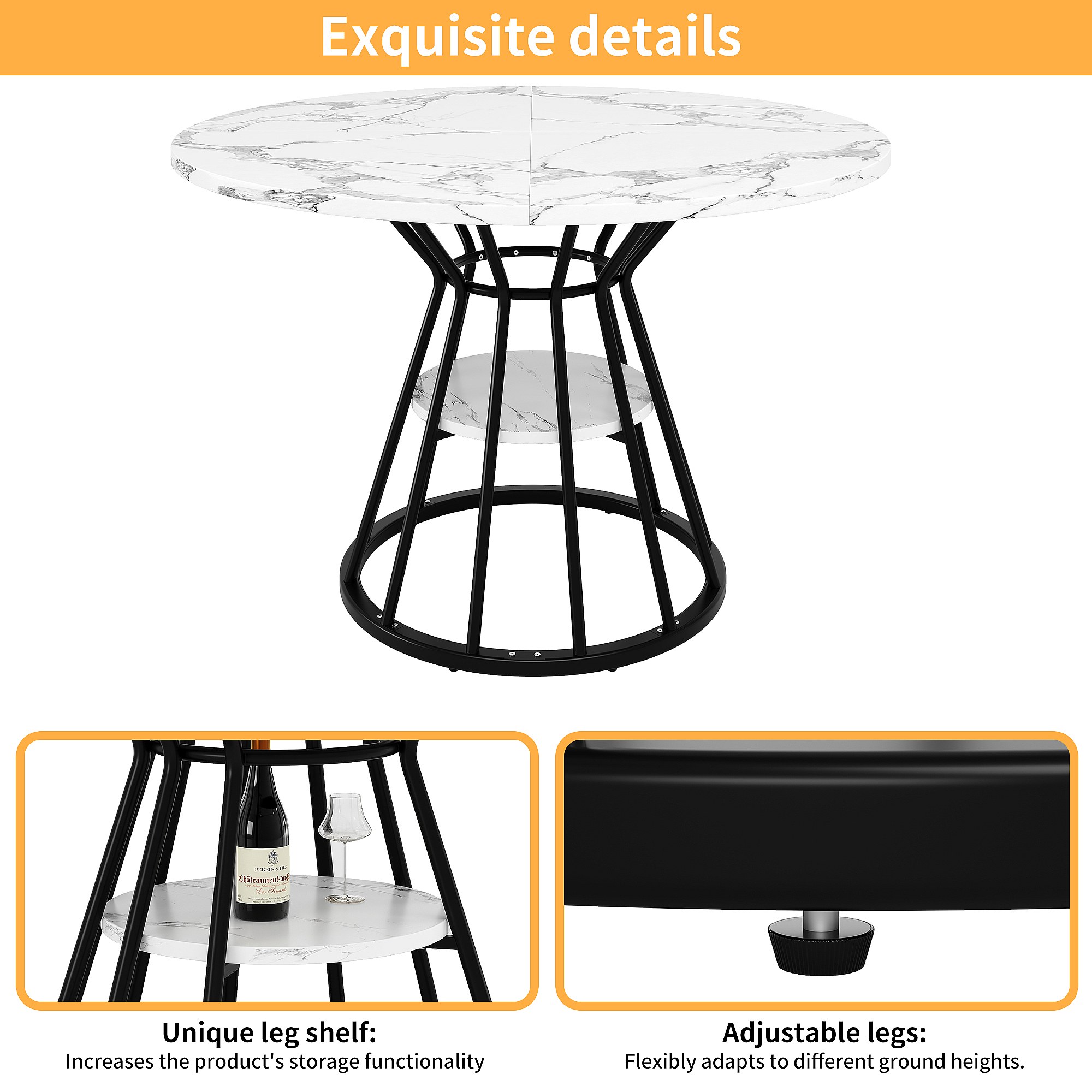 Runder Esstisch - Metallgestell - Marmorierte Oberfläche - Für 4 Personen - Mit Ablageplatte - Weiß & Schwarz