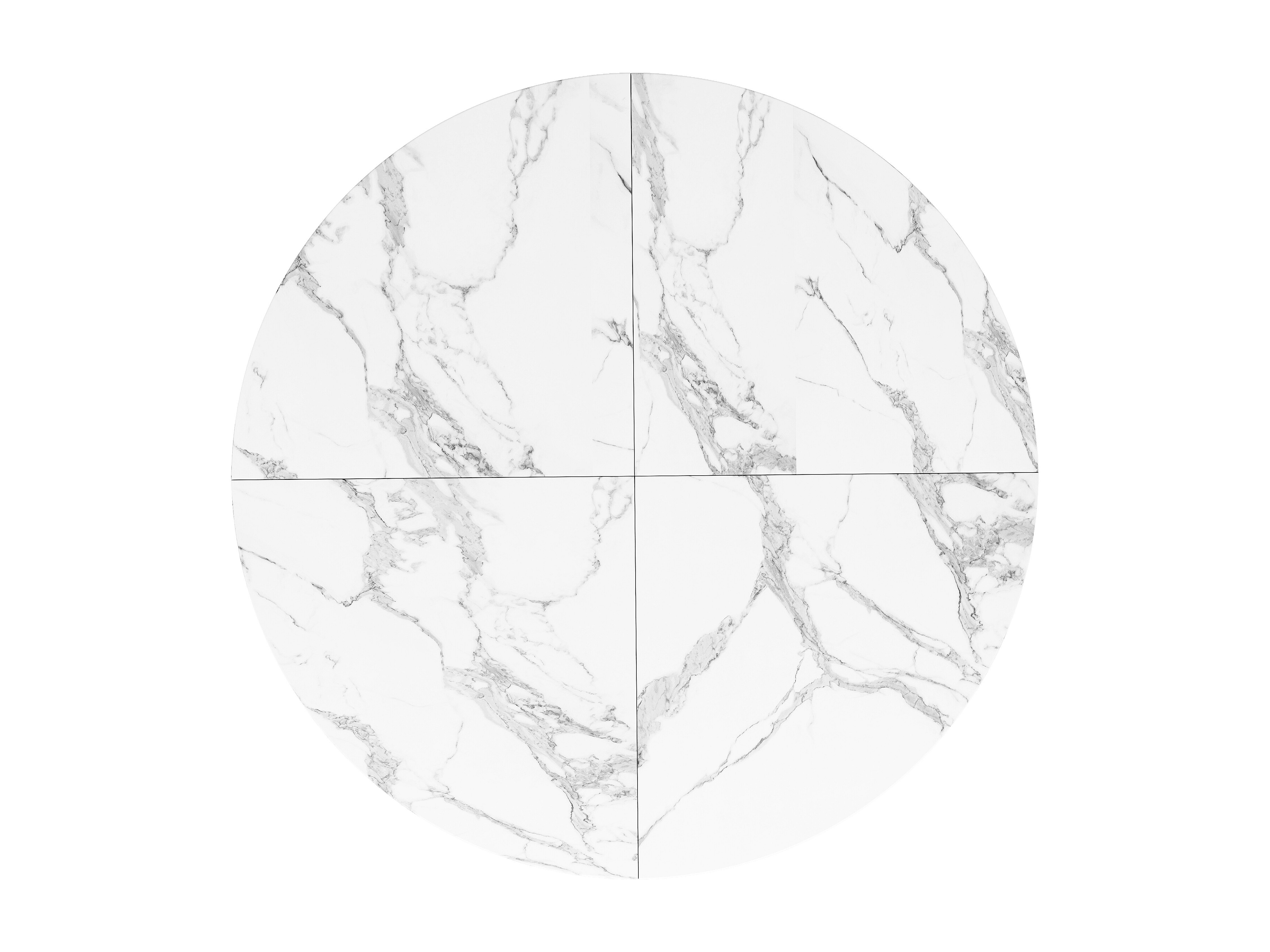 Moderner runder Esstisch (Durchmesser 1 m), X-förmige Metallstütze, Platte mit Marmormuster, Weiß