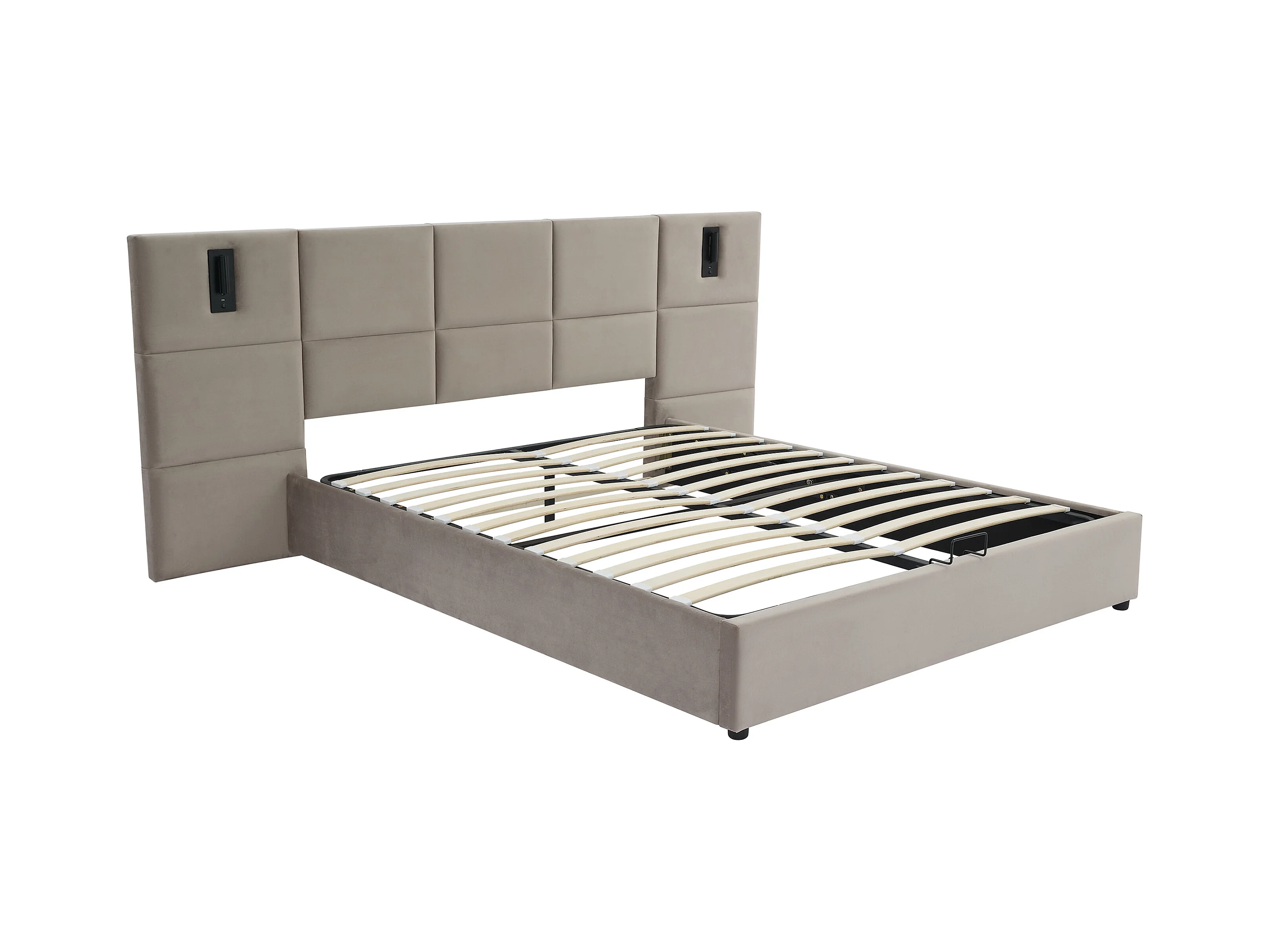 Bett mit Bettkasten mit Kopfteil & integrierter Lampe + Matratze - 160 x 200 cm - Samt - Taupe - SARETO