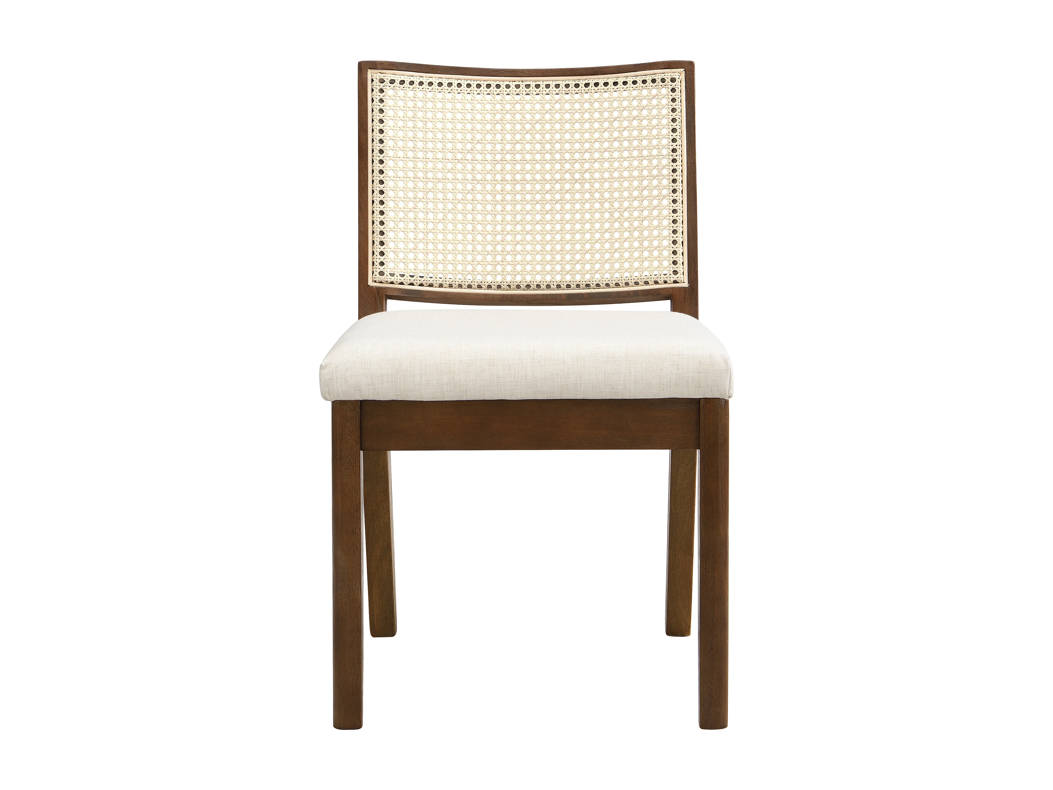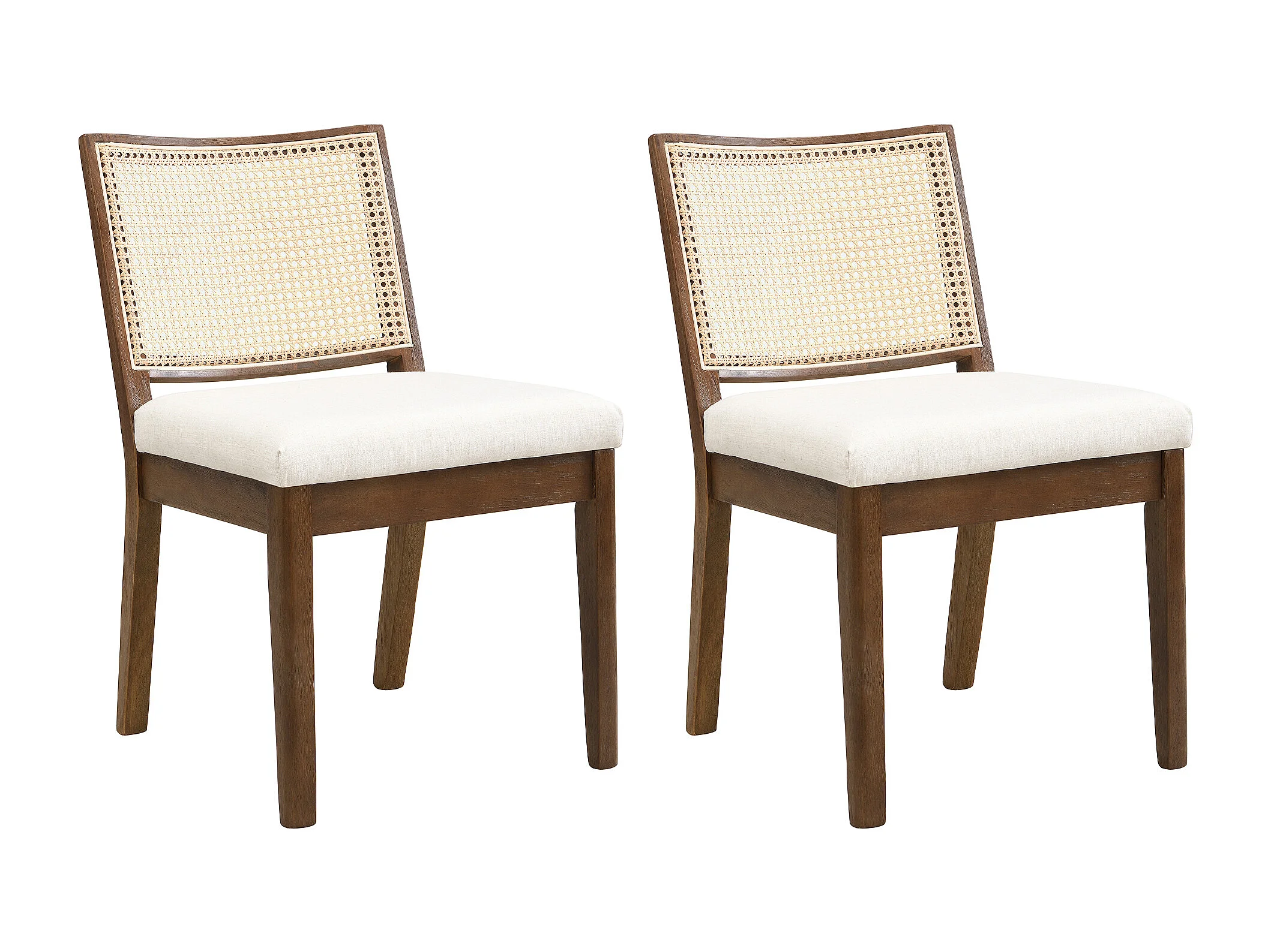 Satz mit 6 Massivholz-Stühlen - Rückenlehne aus Rattan - Sitzkissen aus Leinen - Nussbaumfarbe